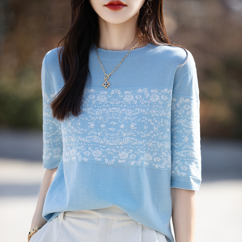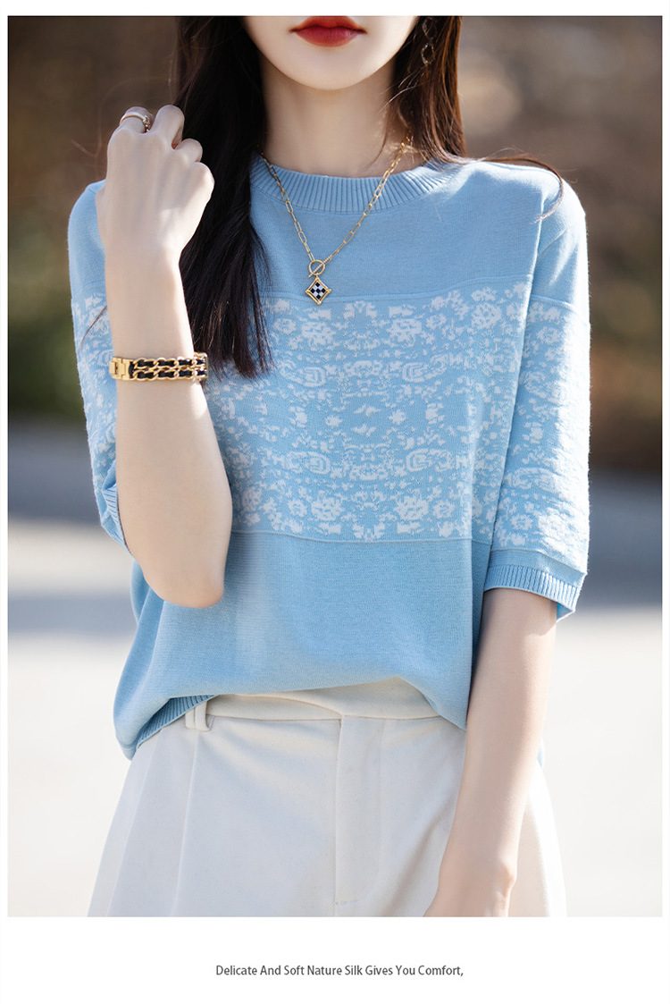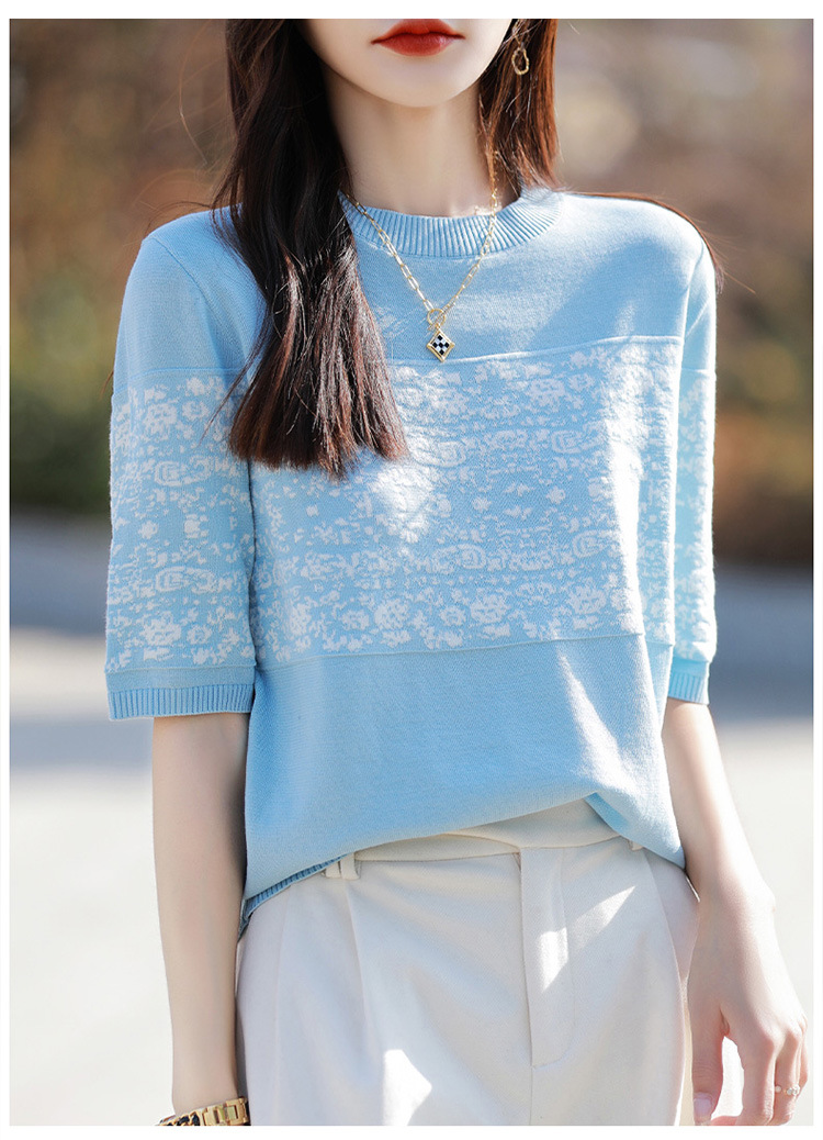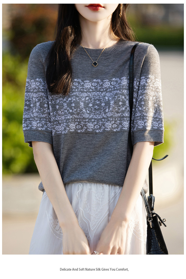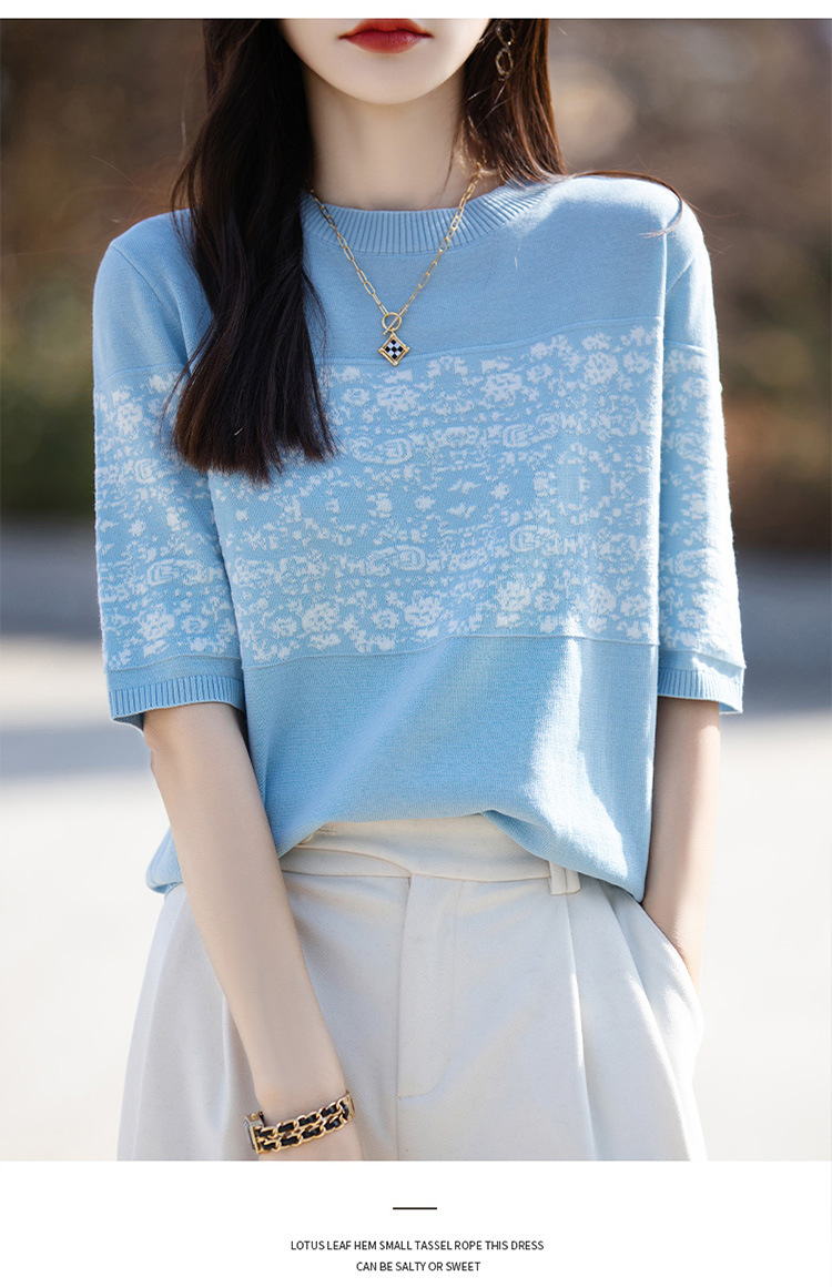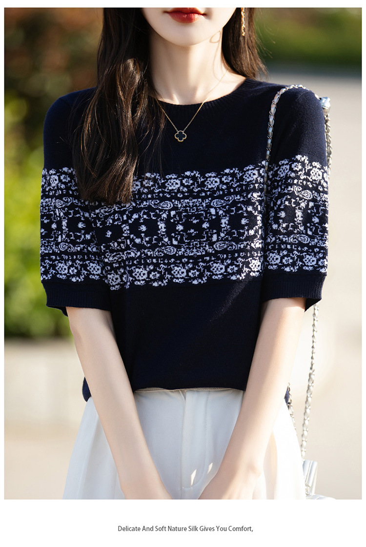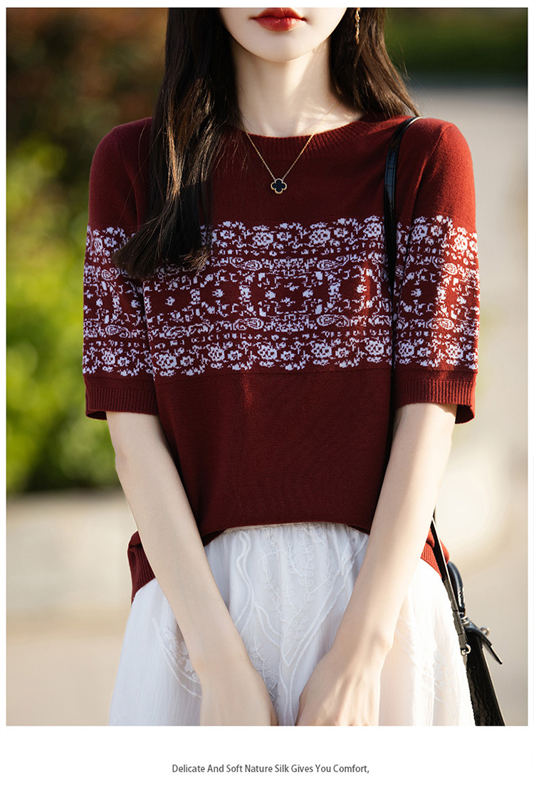 2024 лето новый камвольный шерстяной свитер с короткими рукавами женский округлый воротник жаккардовый цвет свободный модный топ