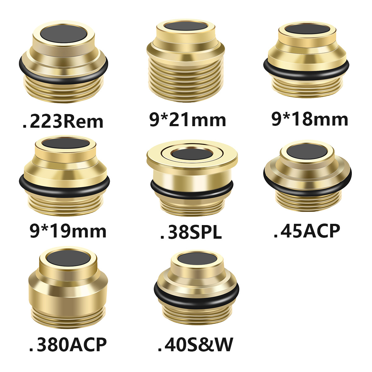 9x18mm; 9x19mm; .223Rem; .40S&W; .38SPL; .380ACP ( long); .45ACP; .38Super; .380ACP ( short); 7.62*39; cal44 mag