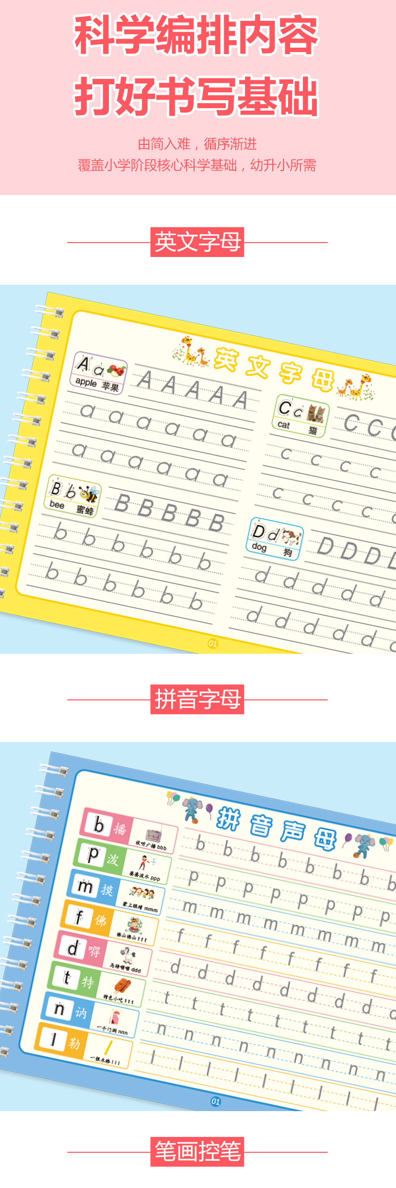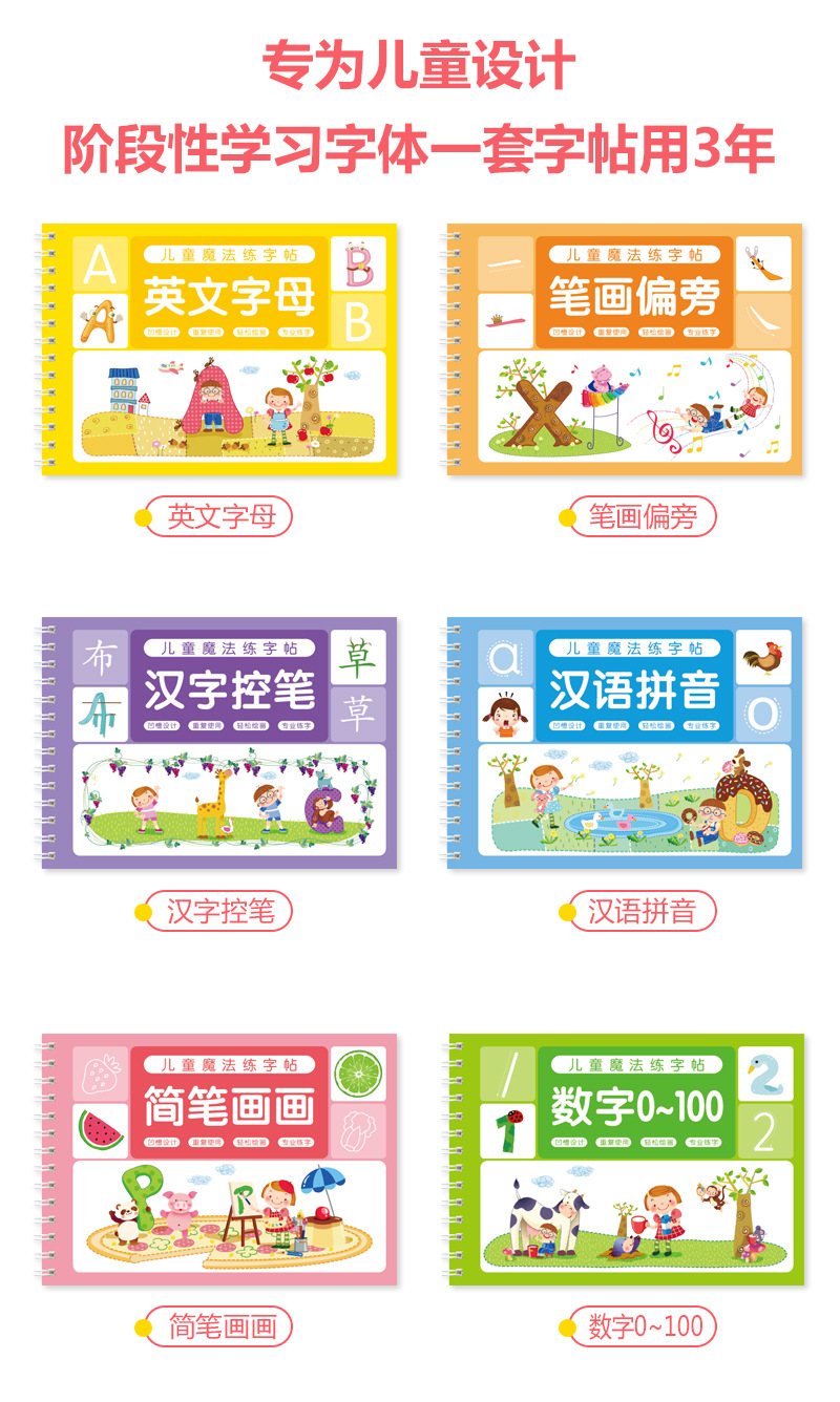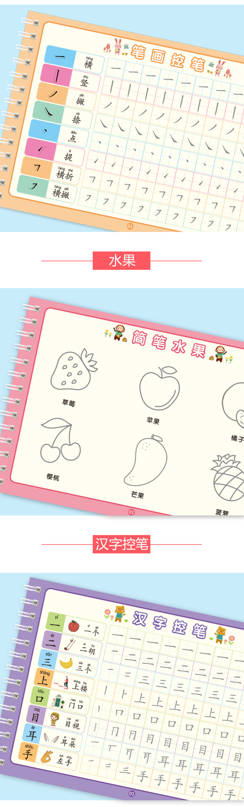 Книга для рисования с горизонтальной канавкой, номер 0-100; Книга для рисования с горизонтальными канавками, управление ручкой китайского иероглифа; Книга для рисования с горизонтальными канавками, английские буквы; Книга для рисования с горизонтальными канавками, китайский пиньинь; Книга для рисования с горизонтальными канавками и стороной для рисования ручкой; Книга для рисования с горизонтальными канавками, простое рисование; Затухающий стержень (5 стержней); Затухающий стержень (8 стержней); Затухающий стержень (10 стержней)