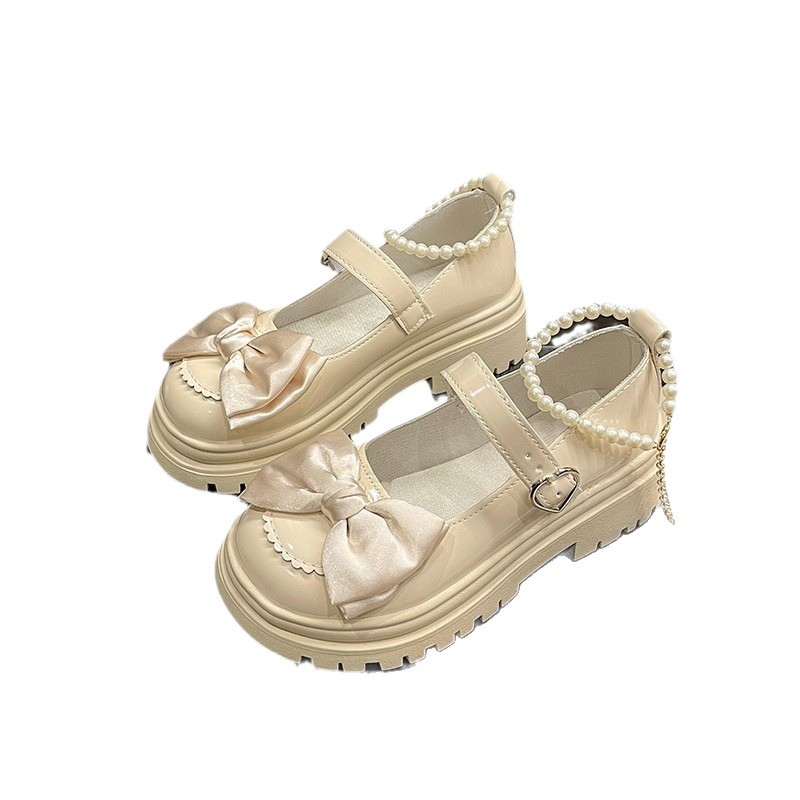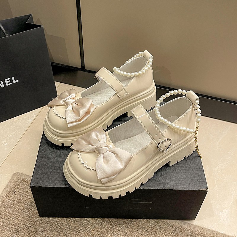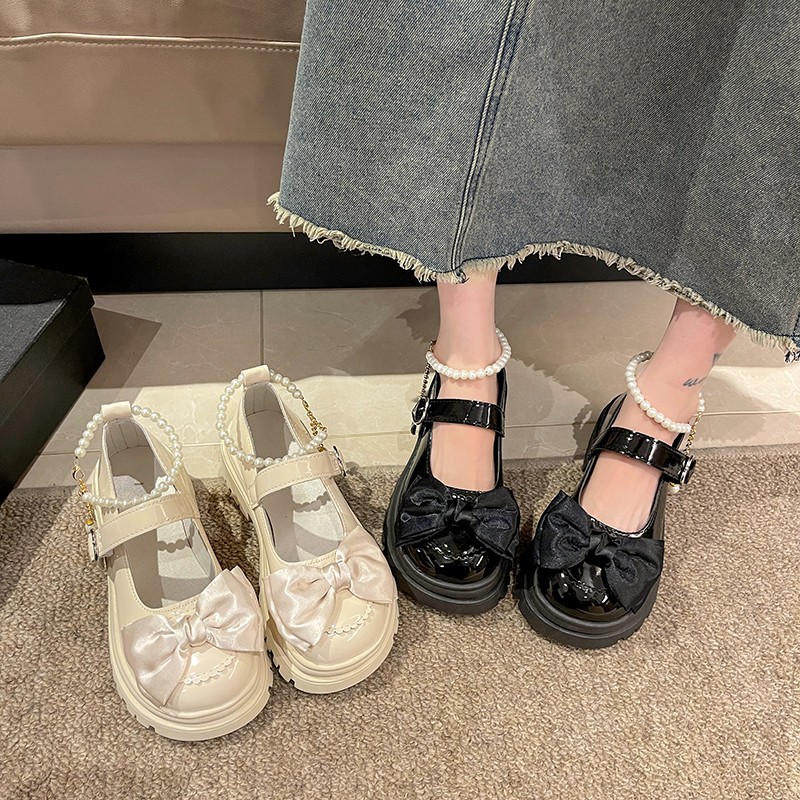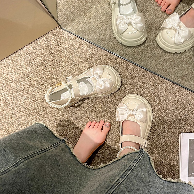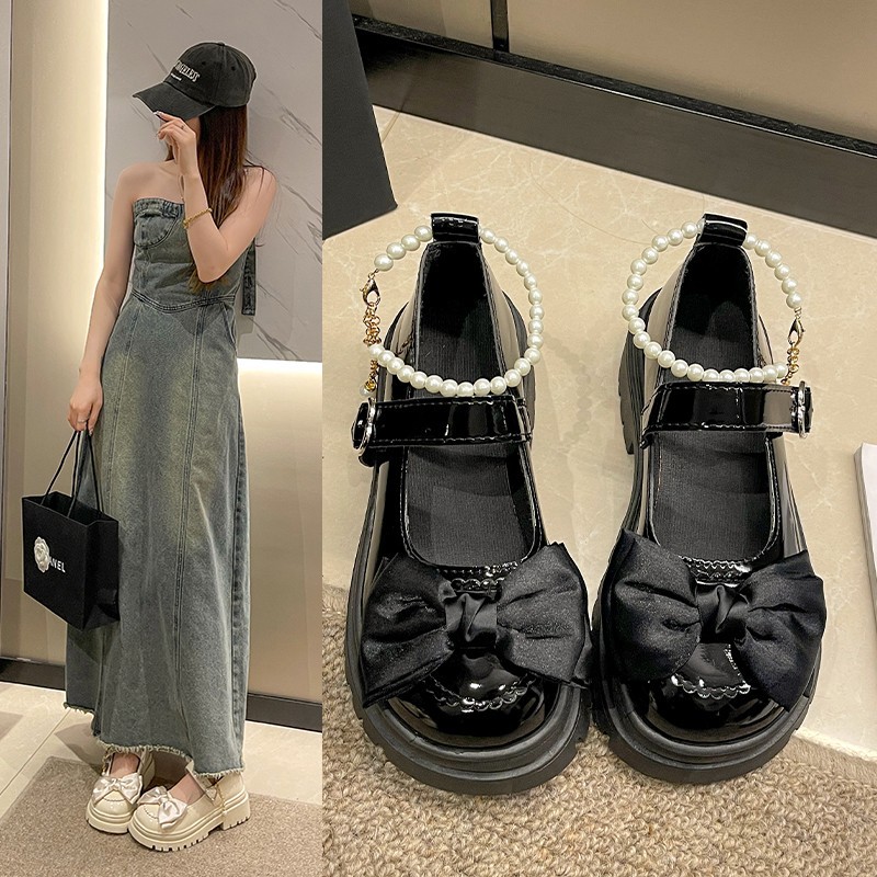 Толстая подошва с толстым каблуком Британская Академия Маленькие кожаные туфли Женская 2024 Летняя новая пуговица с бантом Mary Jen