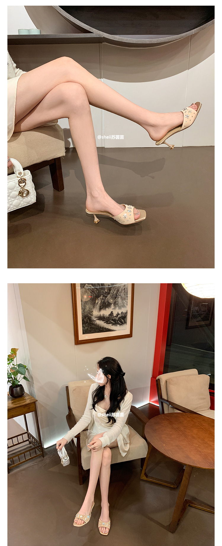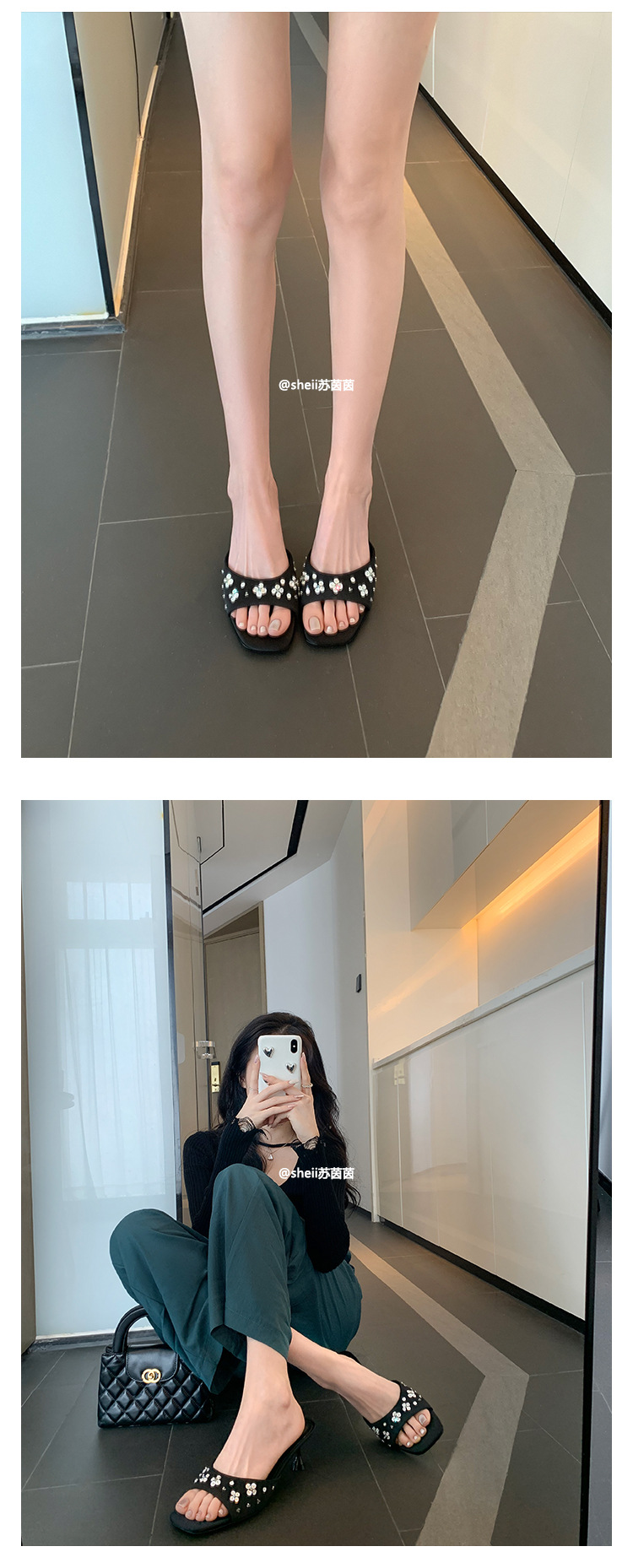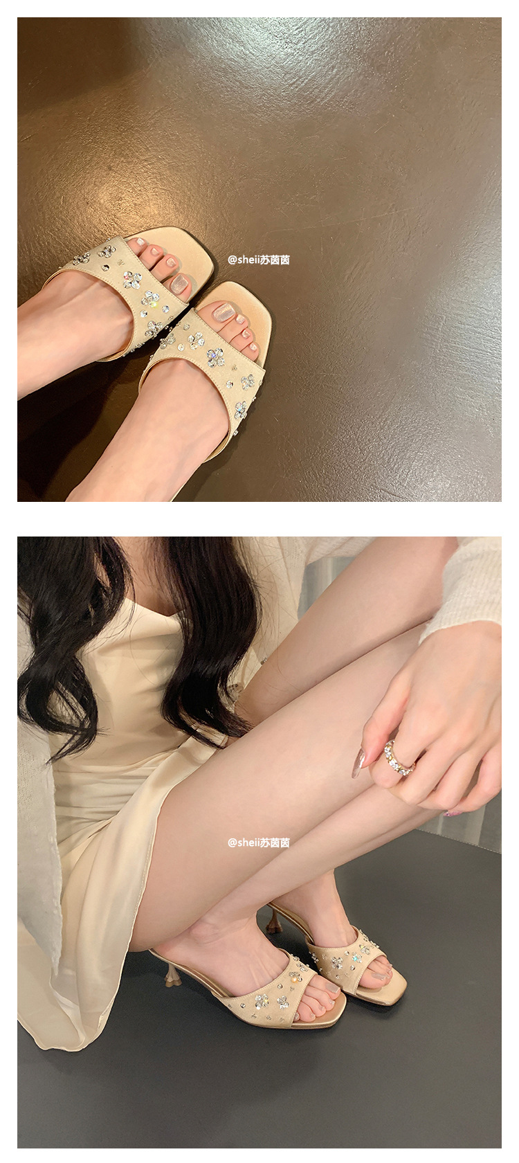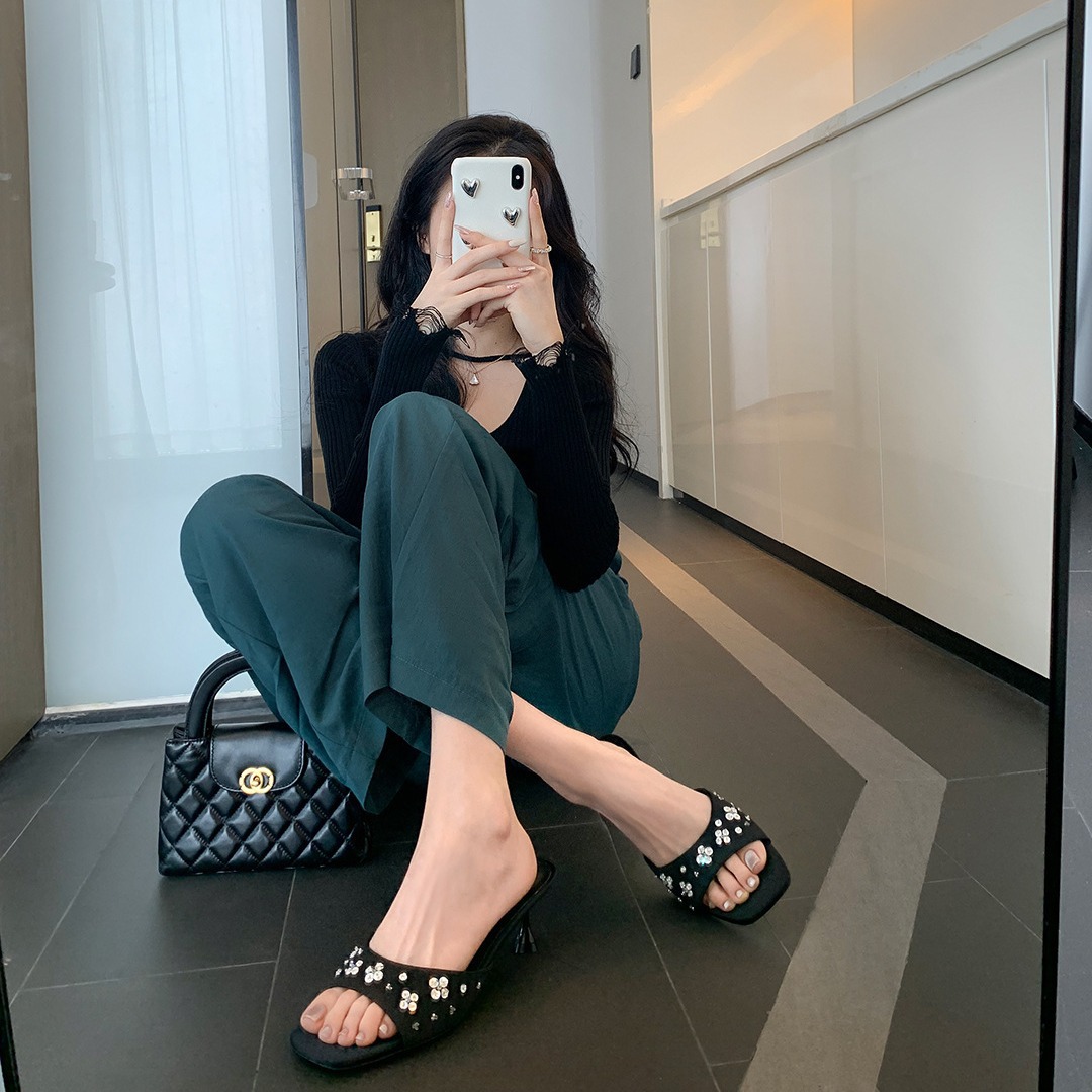 【Стиль Grape Mom】Серия Socialite ~ Женские летние шлепанцы-сандалии на низком каблуке с квадратным носком, отделкой из страз и атласа, для ношения на улице