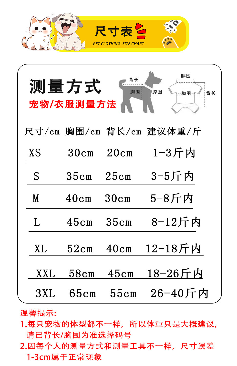 XS (бюст 30 см 1-3 кг домашнее животное); S (бюст 35 см 3-5 кг питомец); M (бюст 40 см 5-8 кг домашнее животное); L (бюст 45 см 8-12 кг домашнее животное); XL (бюст 52 см 12-18 кг); XXL (бюст 58cm 18-26 кг); 3XL (в пределах бюста 65 см 40 кг)