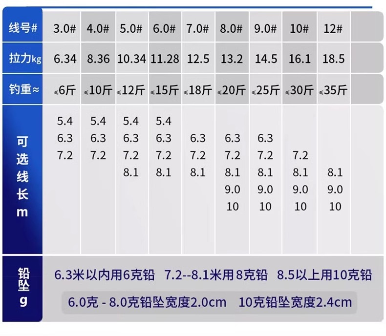 5,4 метра [Легкая версия, более чувствительная]; 6,3 метра [Легкая версия, более чувствительная]; 7,2 метра [легкая версия, более чувствительная]; 8,1 метра [Легкая версия, более чувствительная]; 9 метров [Легкая версия, более чувствительная]; 10 метров [Легкая версия, более чувствительная]
