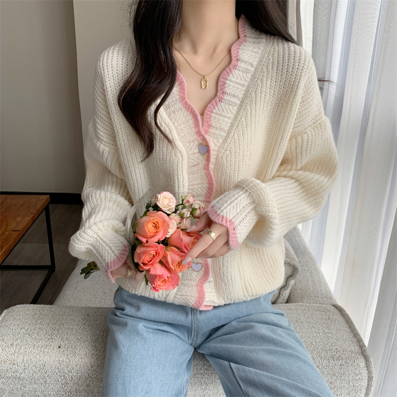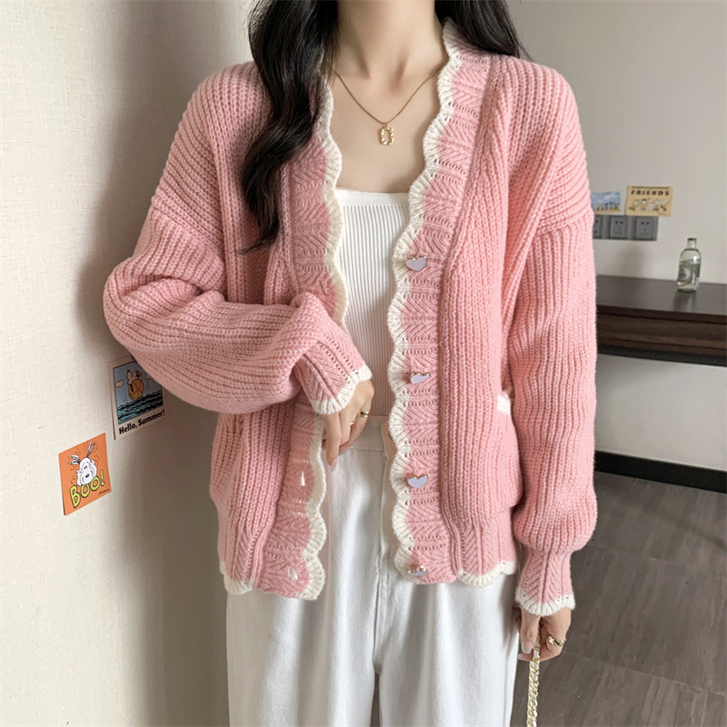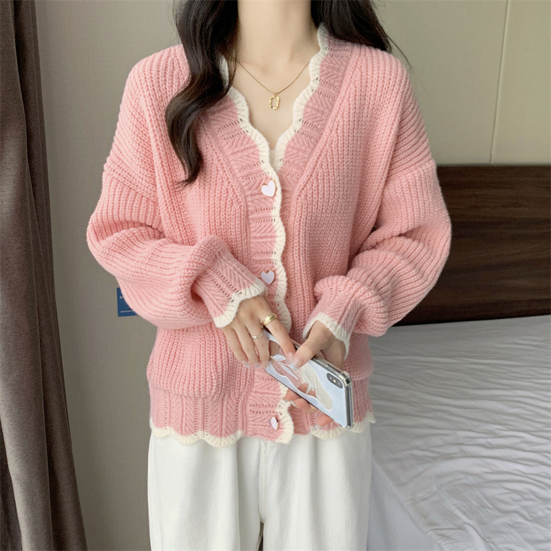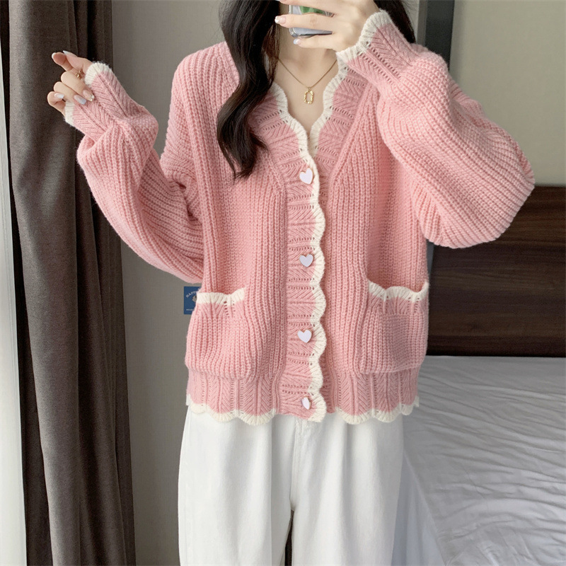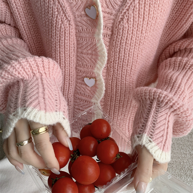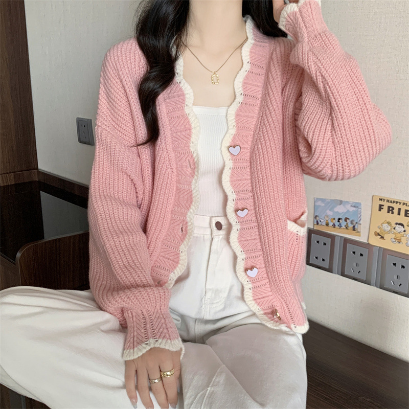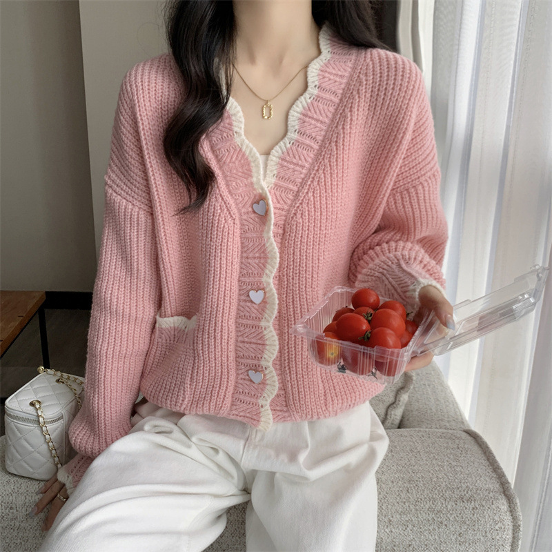 Сладкий вязаный кардиган с длинными рукавами с V-образным вырезом нежный стиль дизайн первая любовь топ женский розовый мягкий клейкий пальто свитер осень