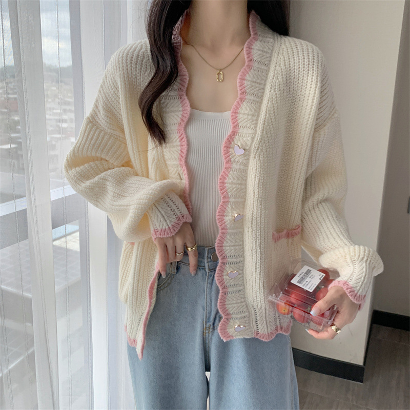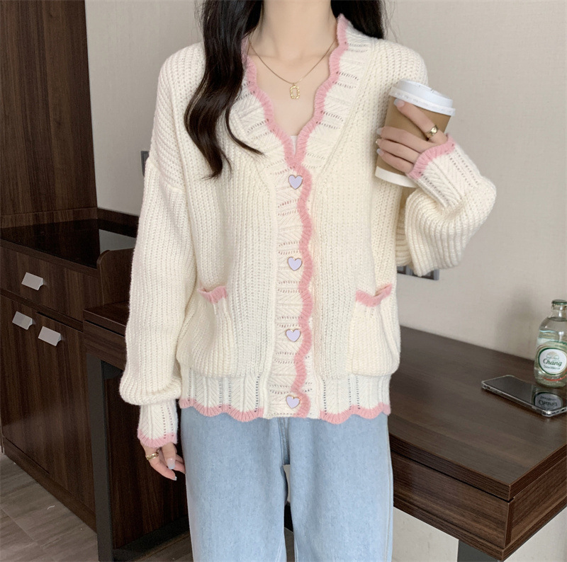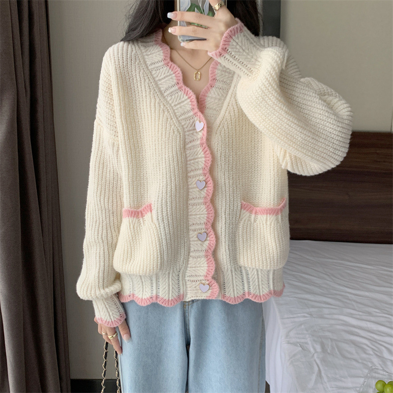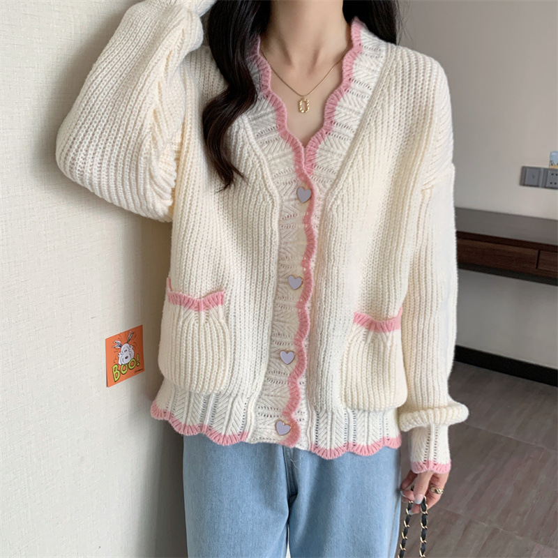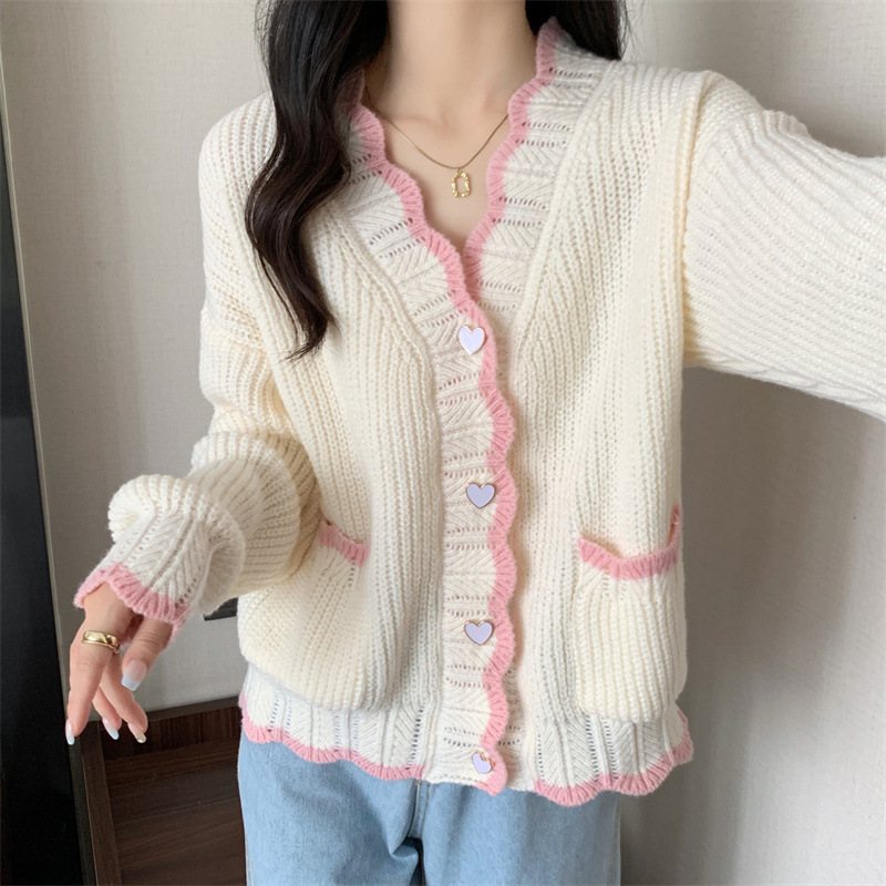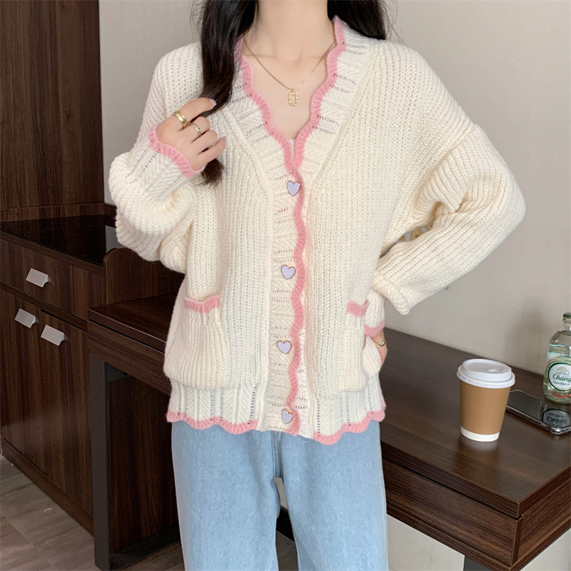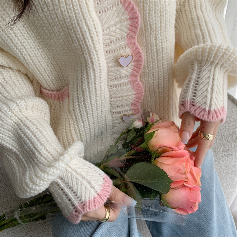 Сладкий вязаный кардиган с длинными рукавами с V-образным вырезом нежный стиль дизайн первая любовь топ женский розовый мягкий клейкий пальто свитер осень