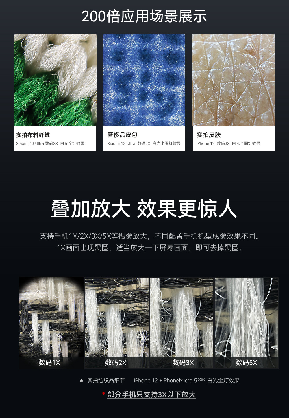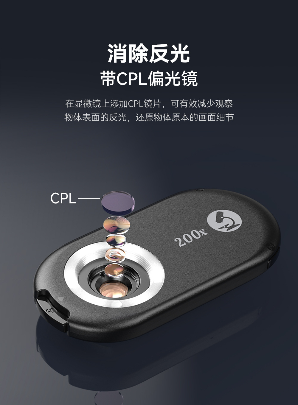 放大倍数:200倍 镜片:4片4组+CPL LED灯:12颗 亮度档位:3档 半圈亮度模式:y 电源;100mAh锂电池 续航:2-5.5小时 |