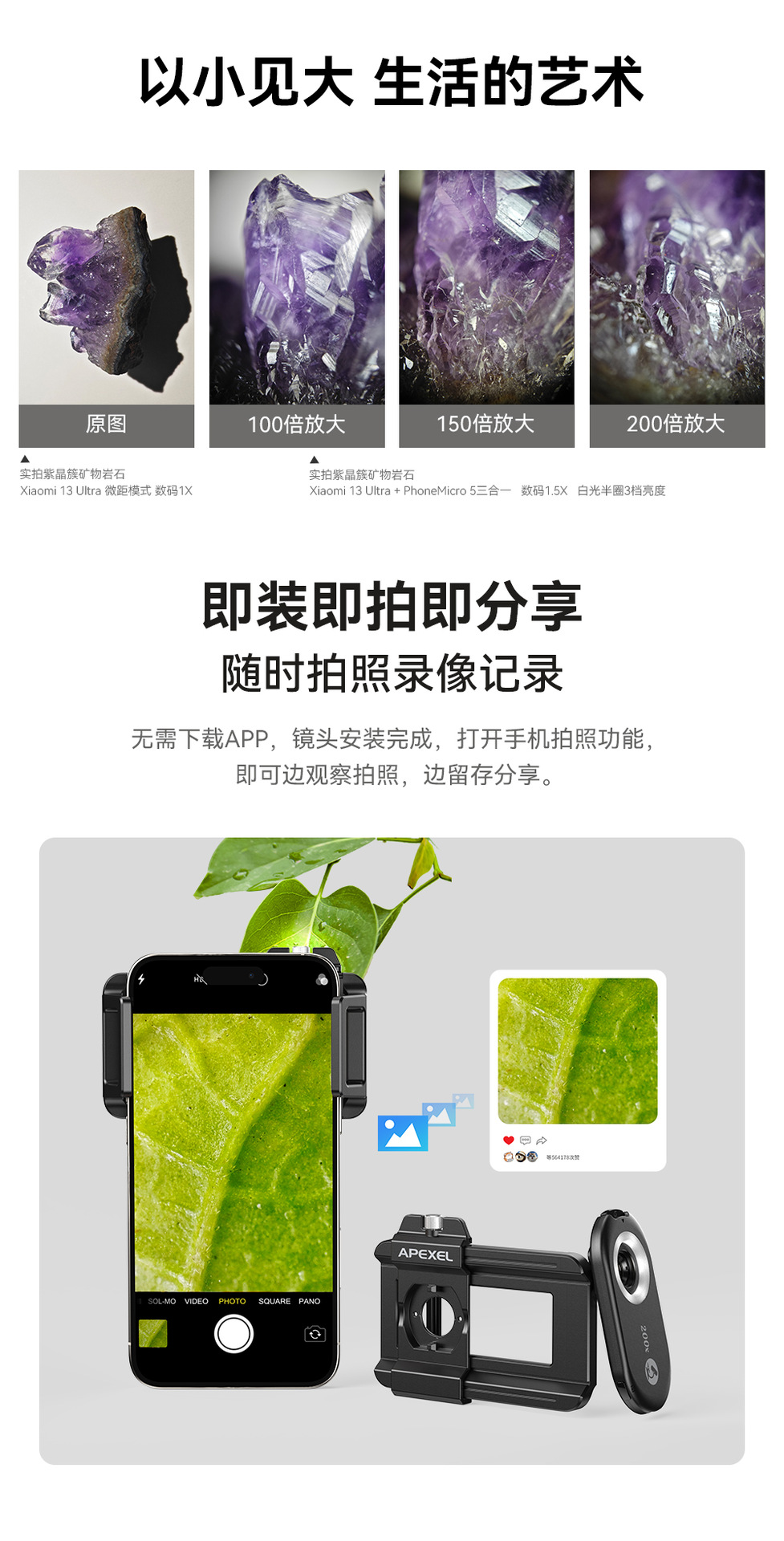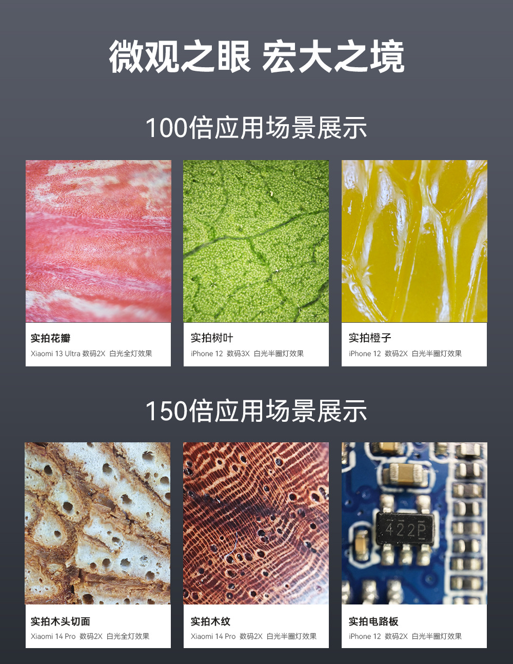 放大倍数:150倍 镜片:4片4组+CPL LED灯:12颗 亮度档位:3档 半圈亮度模式:y 电源;100mAh锂电池 续航:2-5.5小时 |