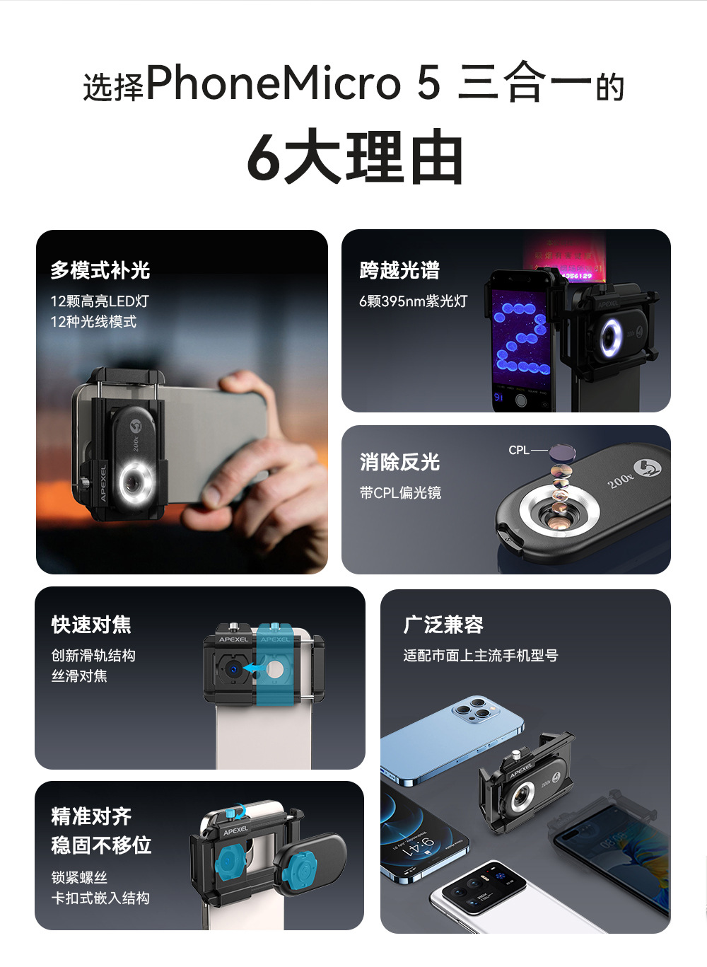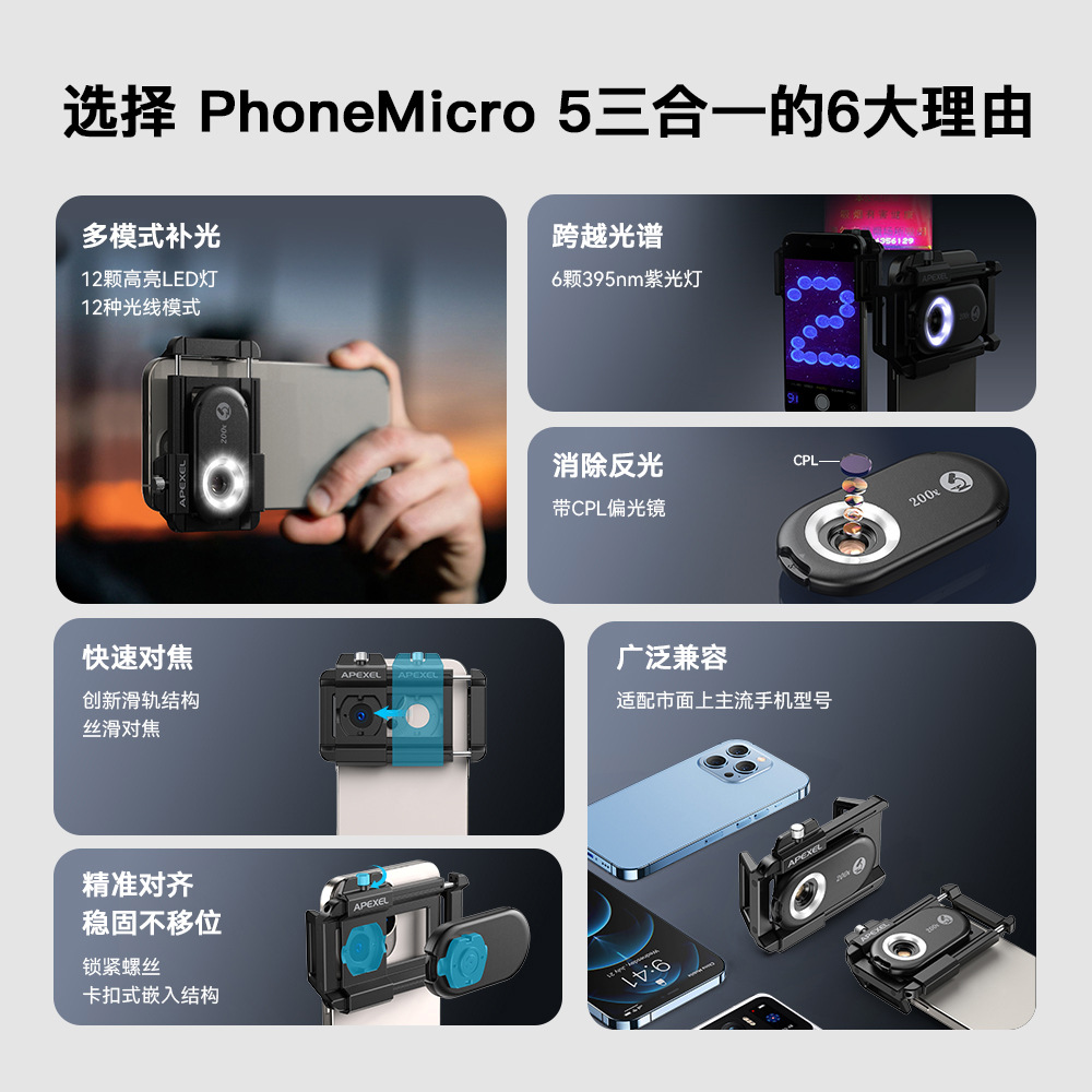 | APL-MS3IN1 | MS3IN1 单套 尺寸 8.7X4.4X15.25CM 单套重量:177g 外箱尺寸:52*42*32cm 装箱数;84个 | 放大倍数:100倍/150/200倍 3合一 镜片:4片4组+CPL LED灯:12颗 亮度档位:3档 半圈亮度模式:y 电源;100mAh锂电池 续航:2-5.5小时 |