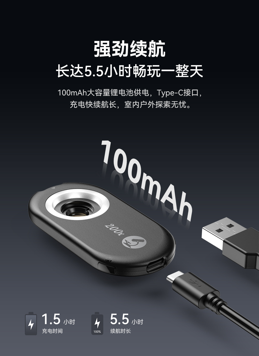 放大倍数:100倍 镜片:4片4组+CPL LED灯:12颗 亮度档位:3档 半圈亮度模式:y 电源;100mAh锂电池 续航:2-5.5小时 |