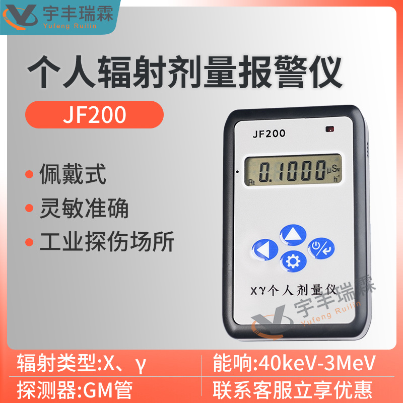 宇丰瑞霖JF200型个人辐射剂量报警仪,是以卤素 GM 计数管为探测器的多功能χγ辐射剂量实时测量仪器,设计用于佩戴在人体躯干部位测量个人剂量当量 HP(10),也可用于辐射场调查和侦测。