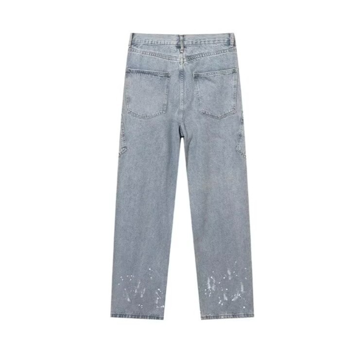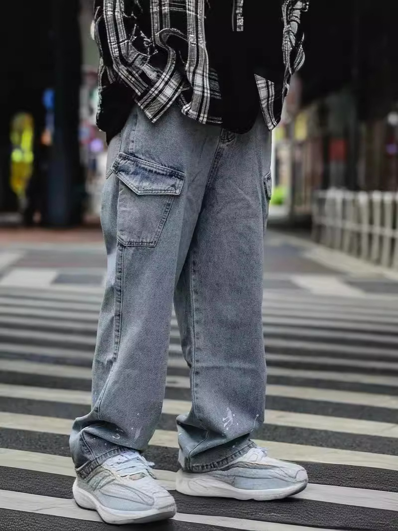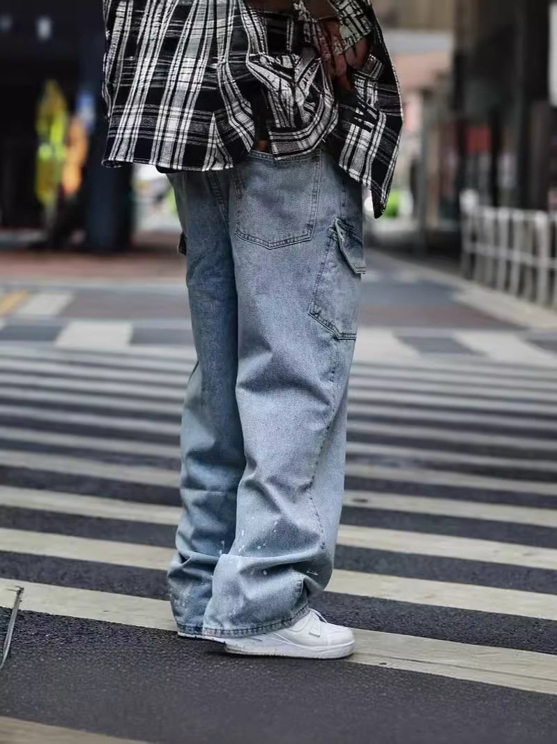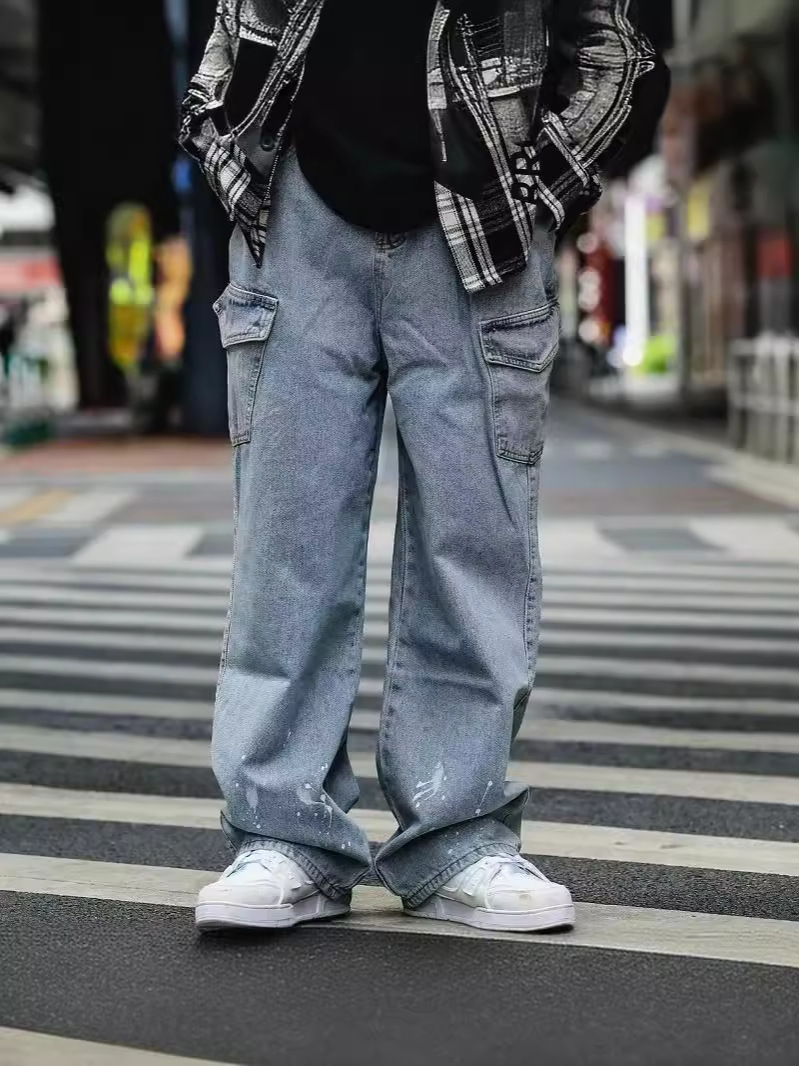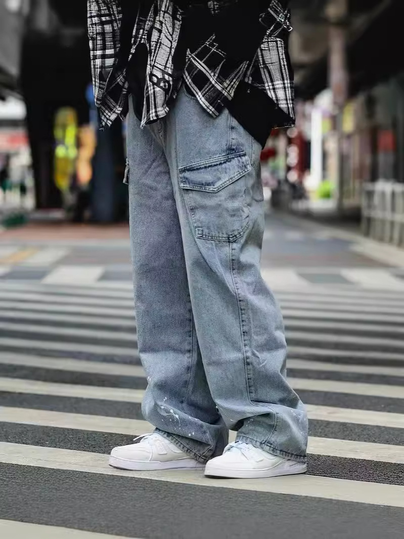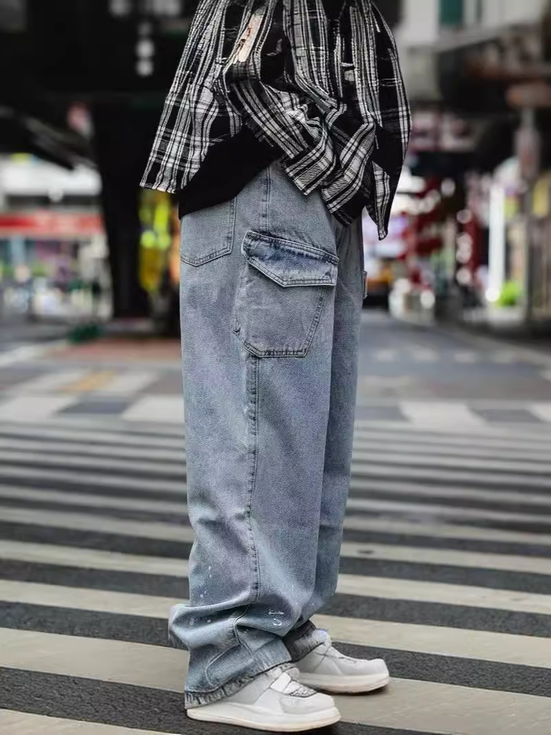 Японский стирается тяжелым дизайном Окрашенные прямые джинсы Мужская мода модная свободная ретро-швабра