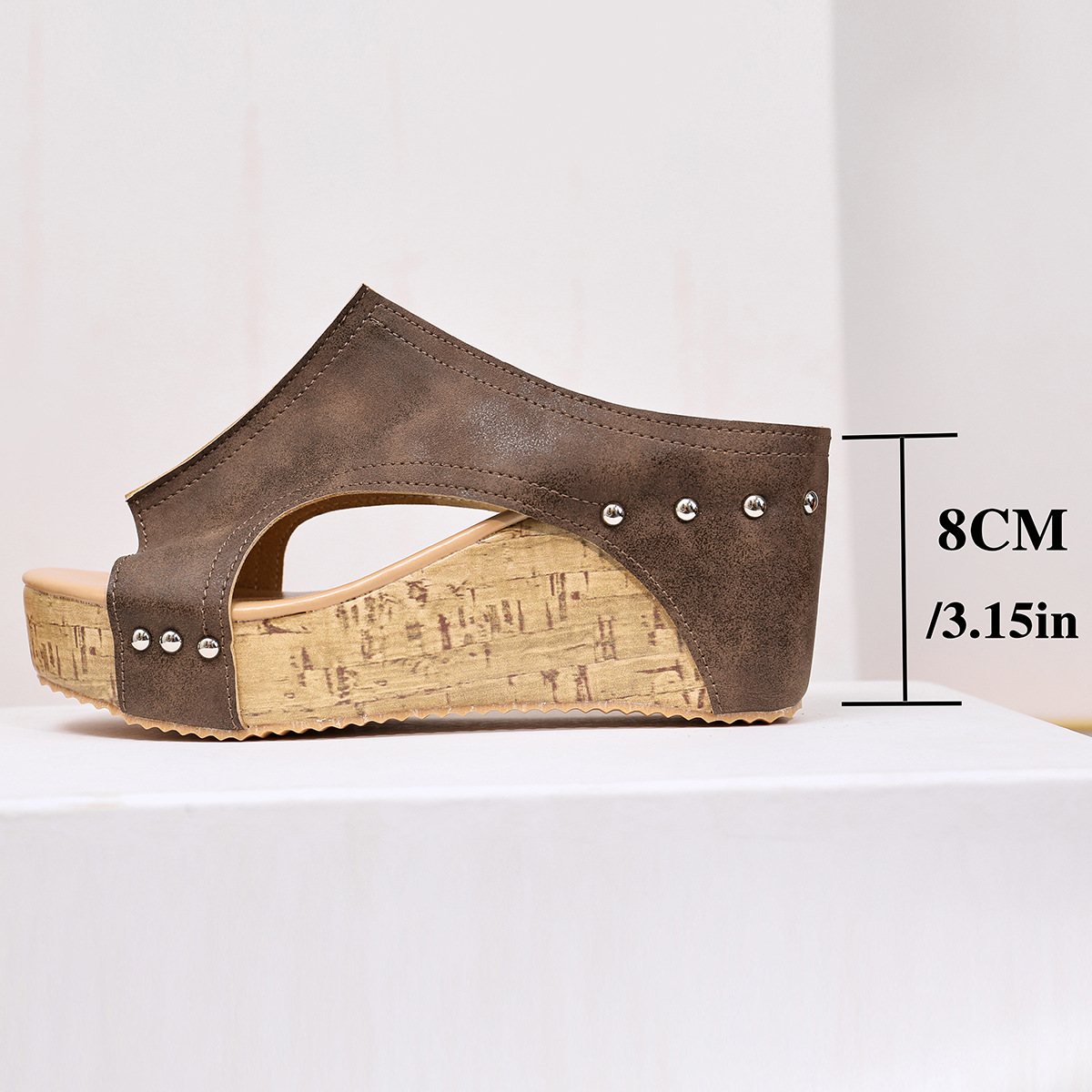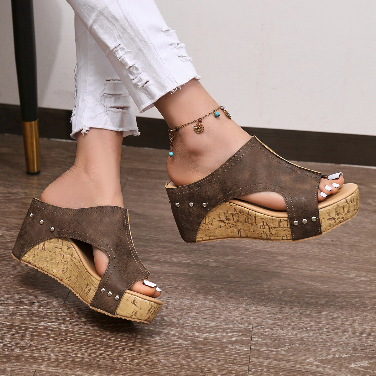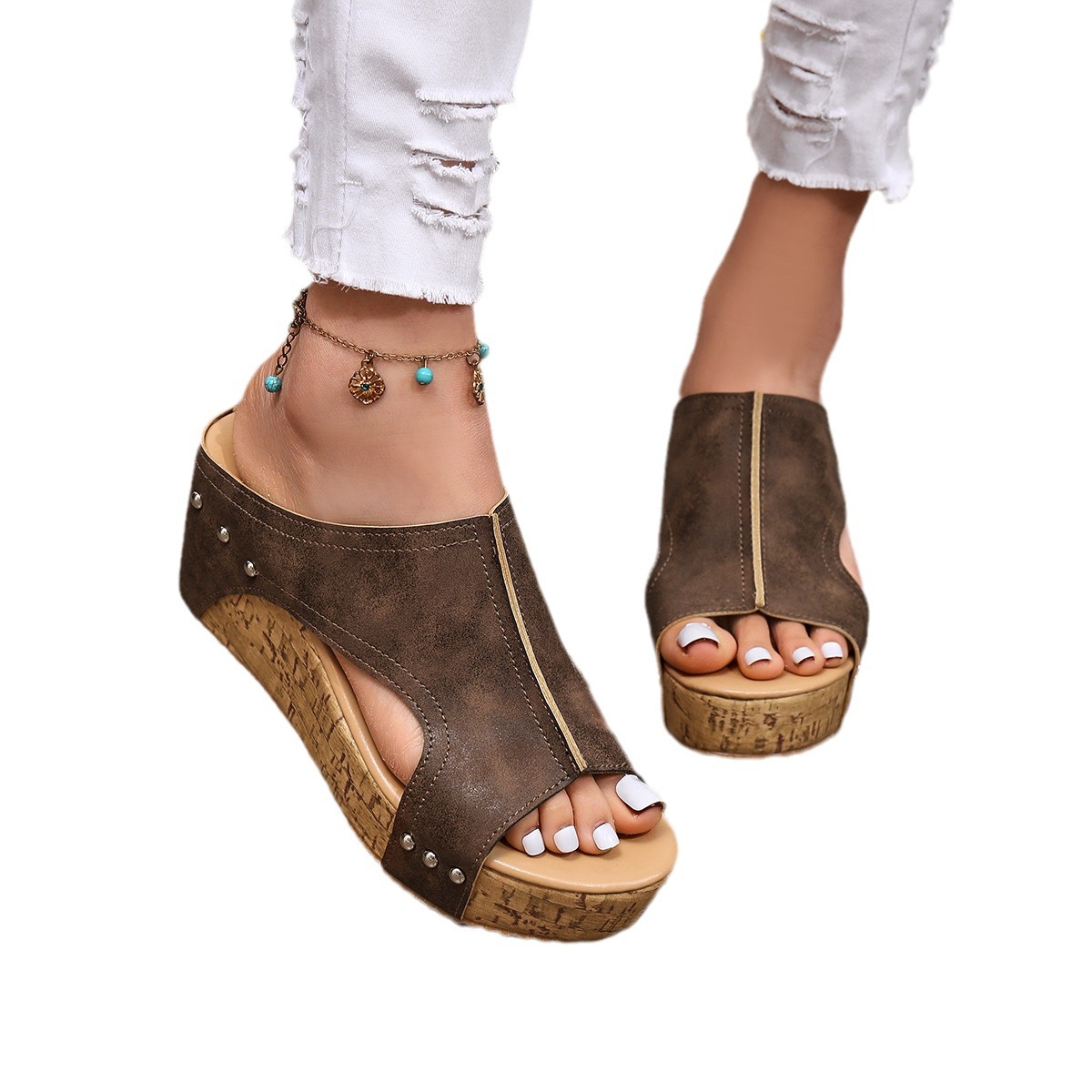 Большой размер тапки на каблуке женский 2024 трансграничная внешняя торговля новый европейский и американский женский рыбий рот с толстым дном заклепки сандалии оптом