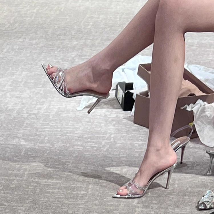 Летняя новая модель с открытыми пальцами и острыми стразами прозрачная ПВХ лакированная кожа буксировка женская сексуальная одежда на каблуках тапочка