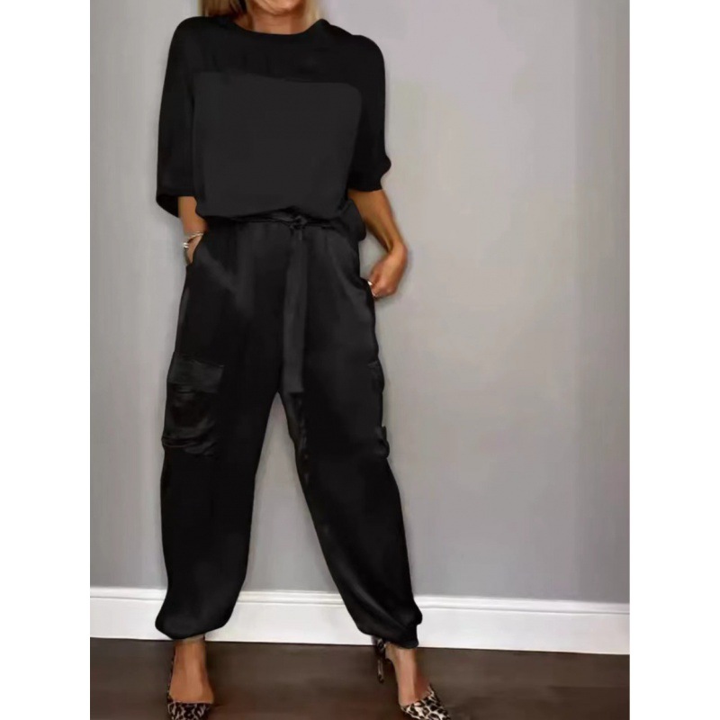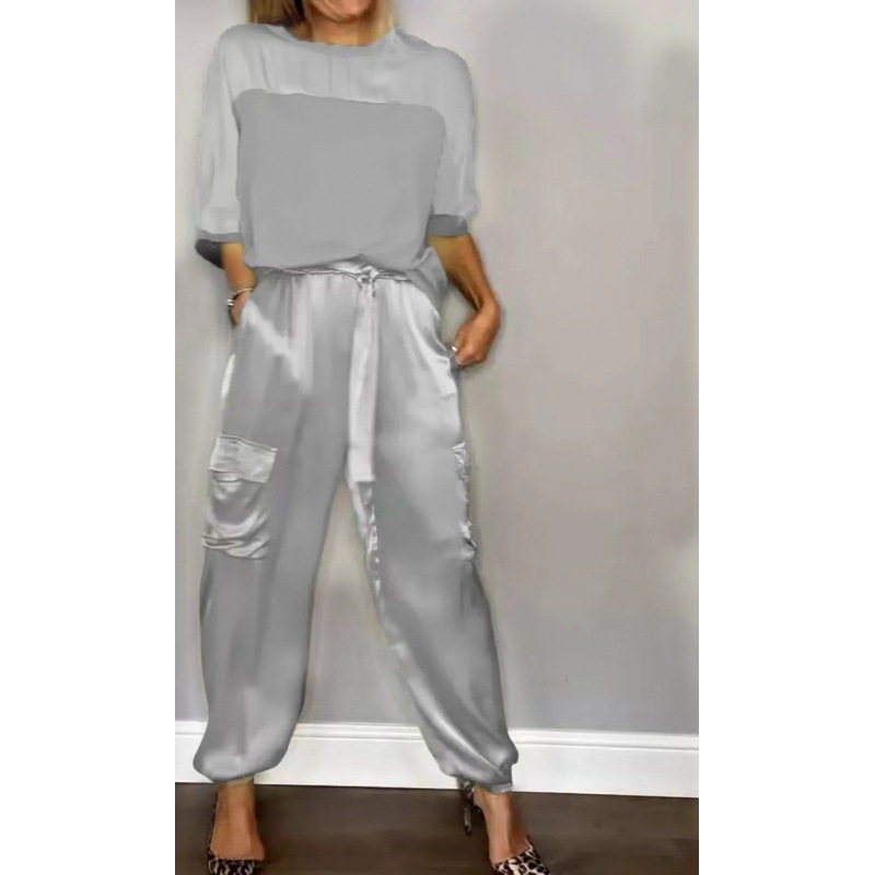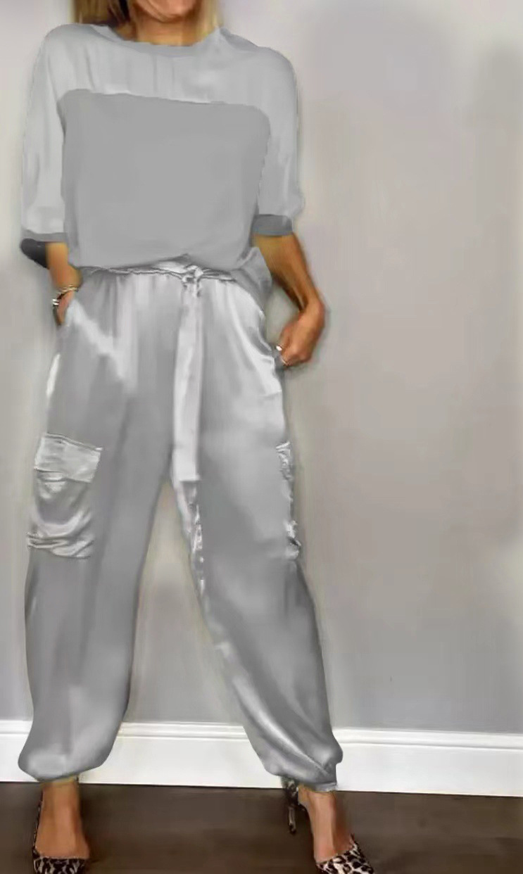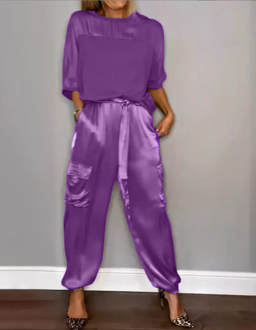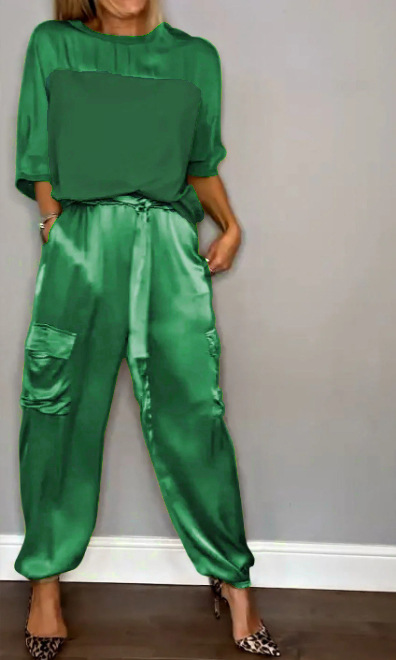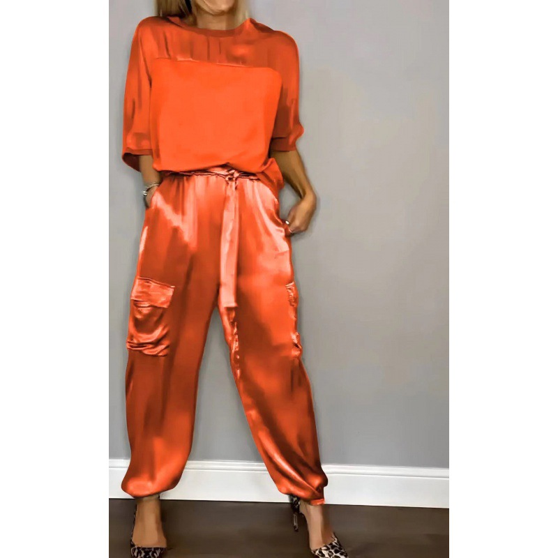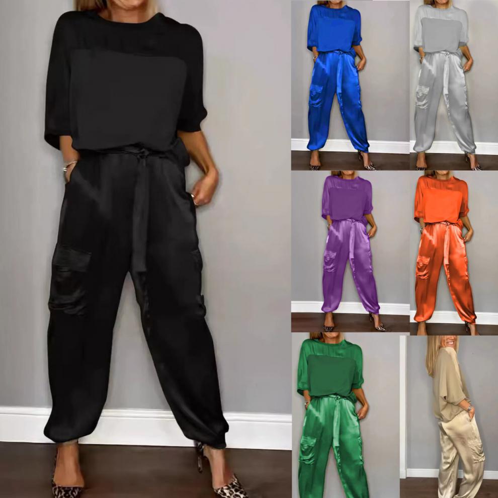 2024 Европейский и Американский трансграничный новый модный женский гладкий атласный топ с половиной рукава брюки набор из двух частей повседневный набор