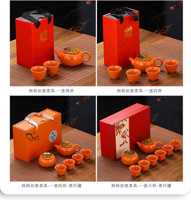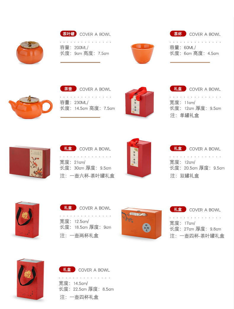 Оранжевая банка (без подарочной коробки); Оранжевая банка (подарочная коробка); Красная банка (подарочная коробка); Оранжевая пара (подарочная коробка); Красная пара (подарочная коробка); Один горшок и две чашки (подарочная коробка); Четыре чашки в одном горшке (подарочная коробка)
