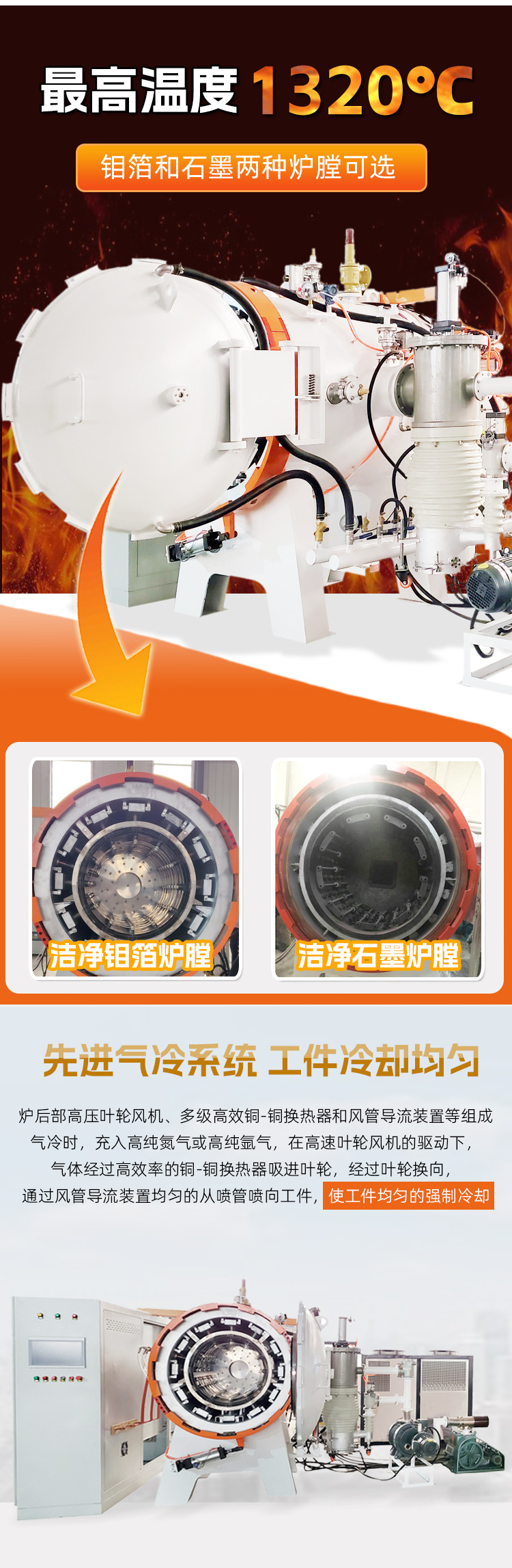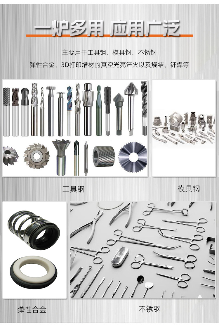 Высокотемпературное вакуумное спекание, отжиг, отпуск и т. д. керамико-металлических композитов, негорючих металлов и сплавов, а также вакуумная пайка сплавов и сверхтвердых материалов.