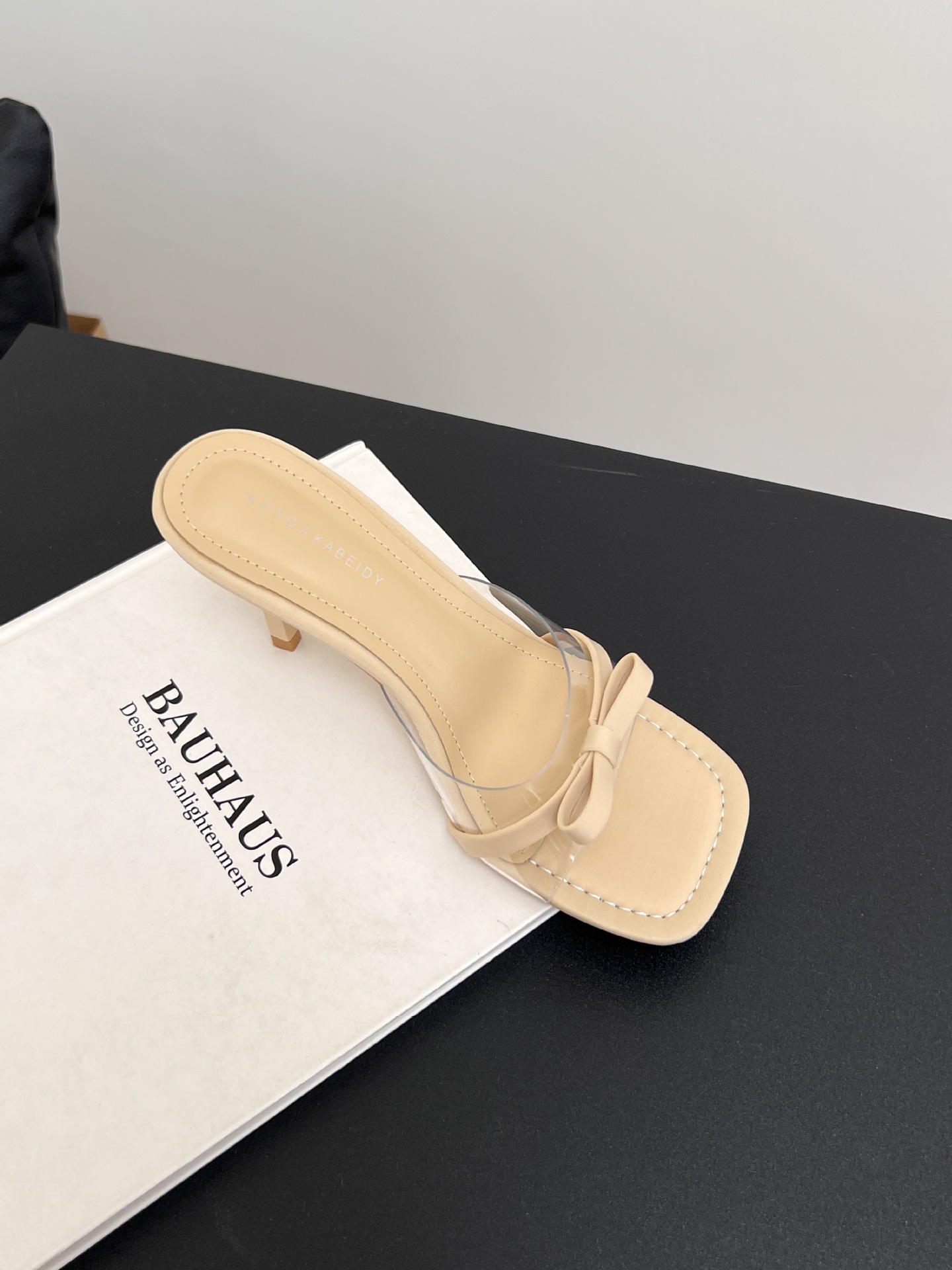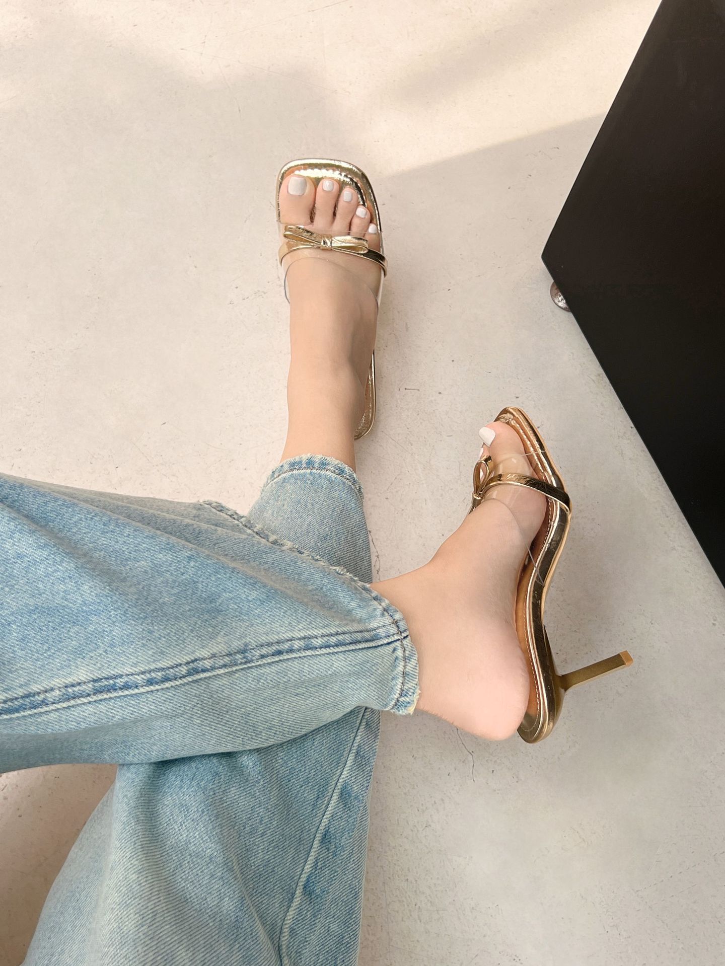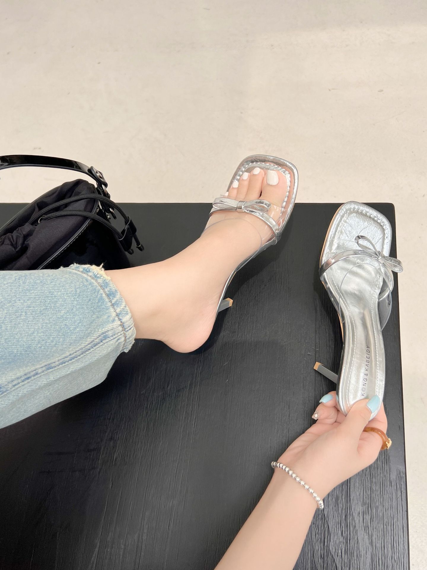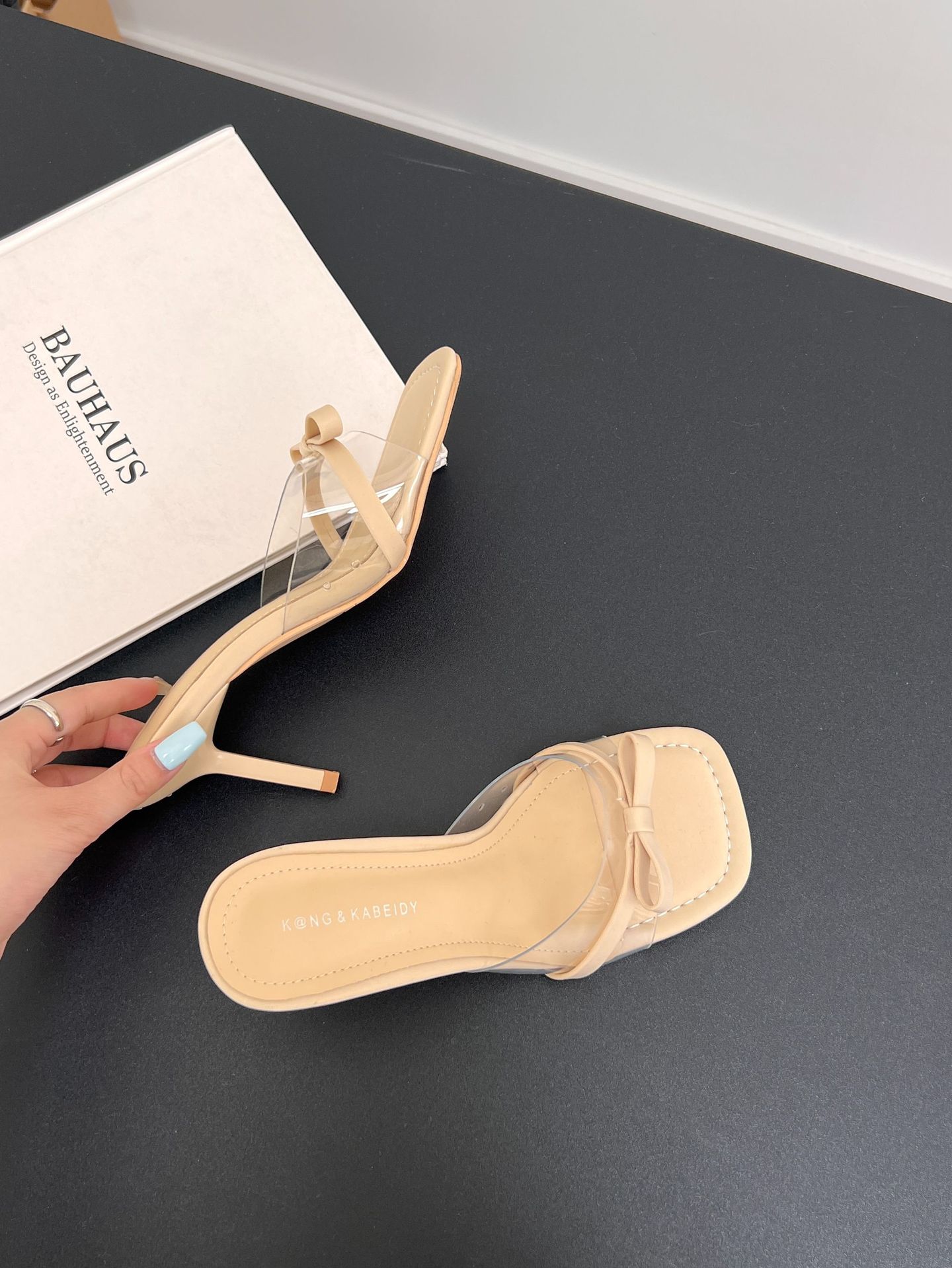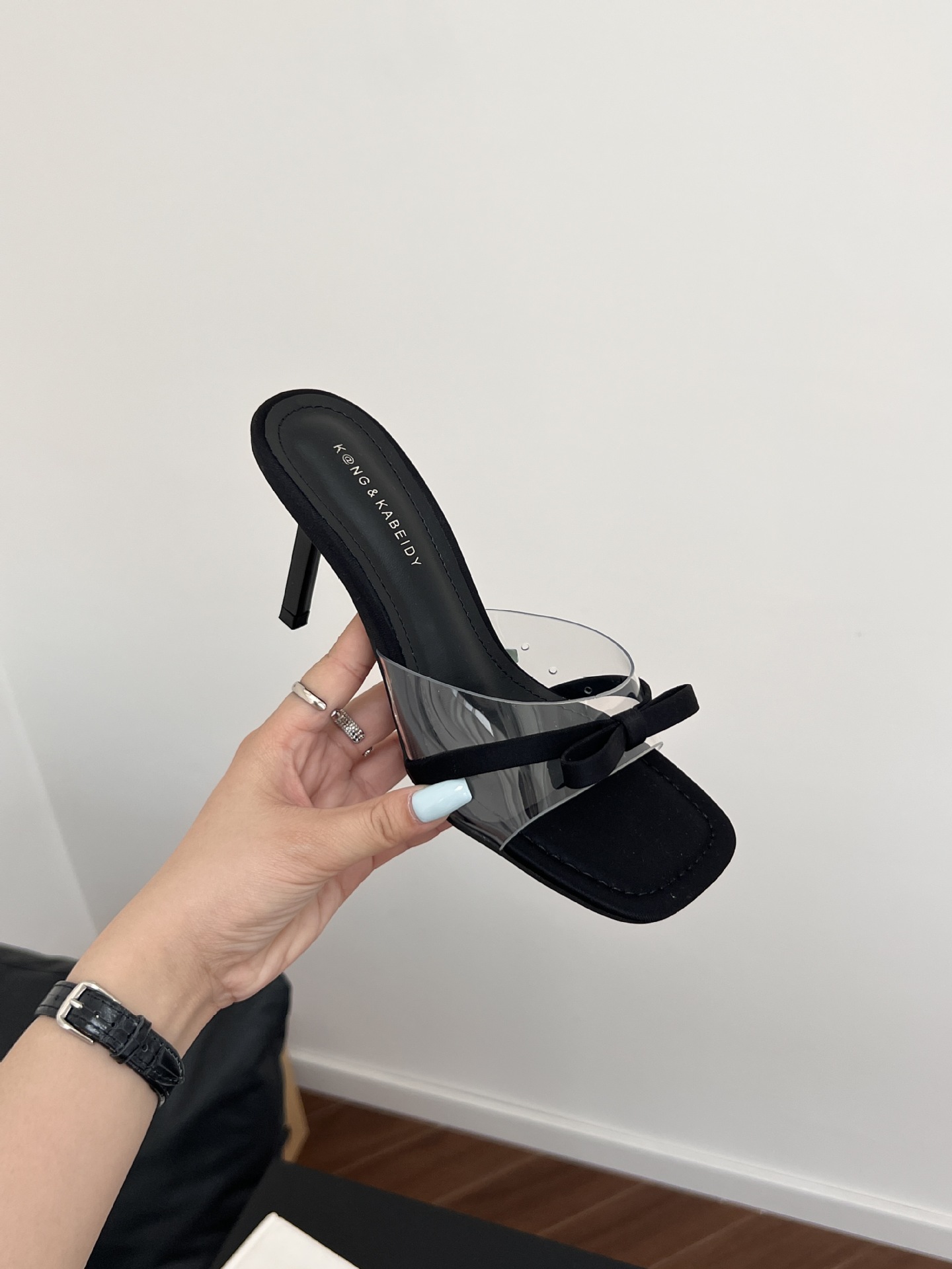 Новинка 2023 года, открытые сандалии и тапочки с прозрачным бантом и квадратным носком интернет-знаменитостей, самые последние модели подходят на очень высоком каблуке-шпильке