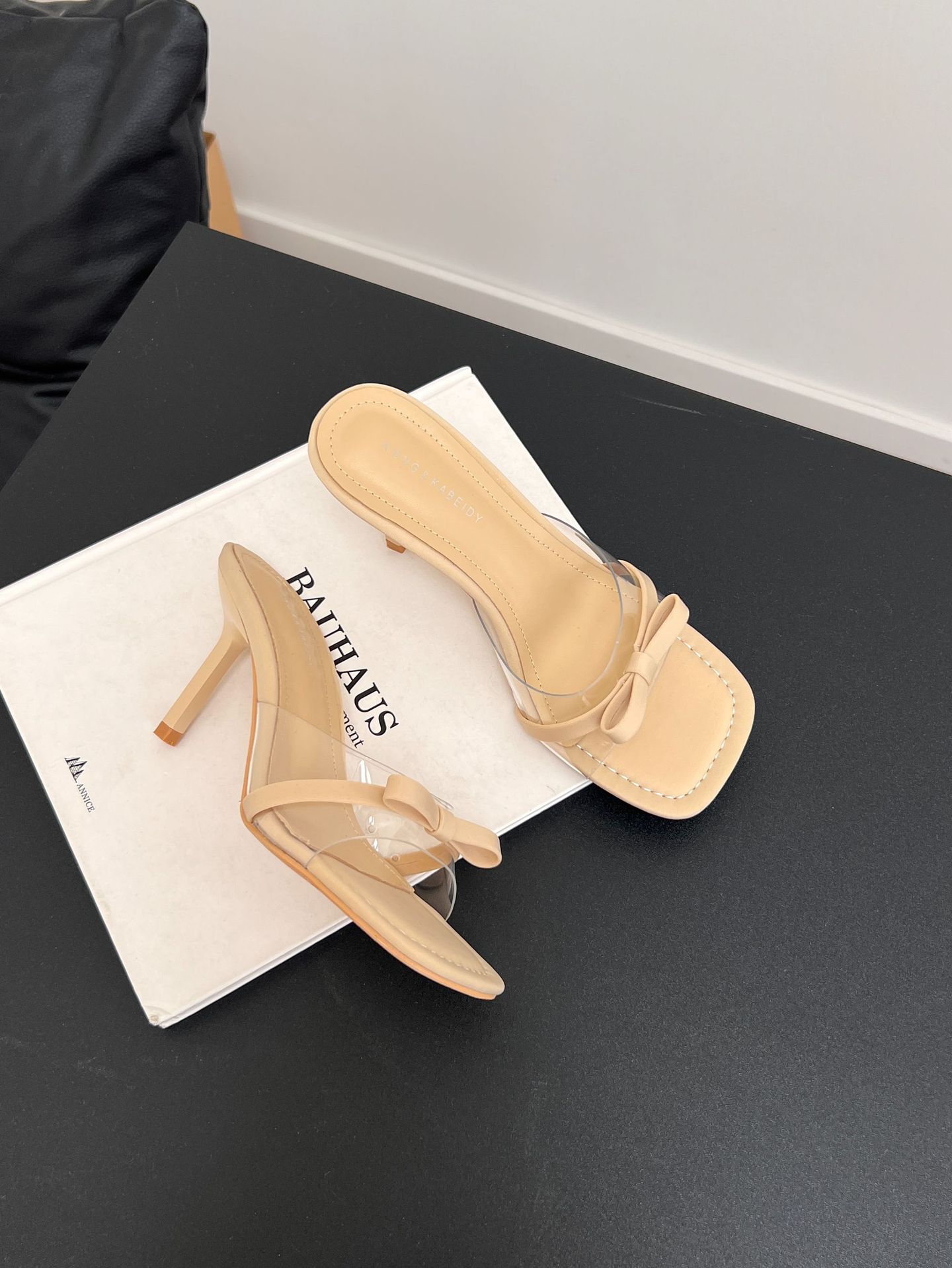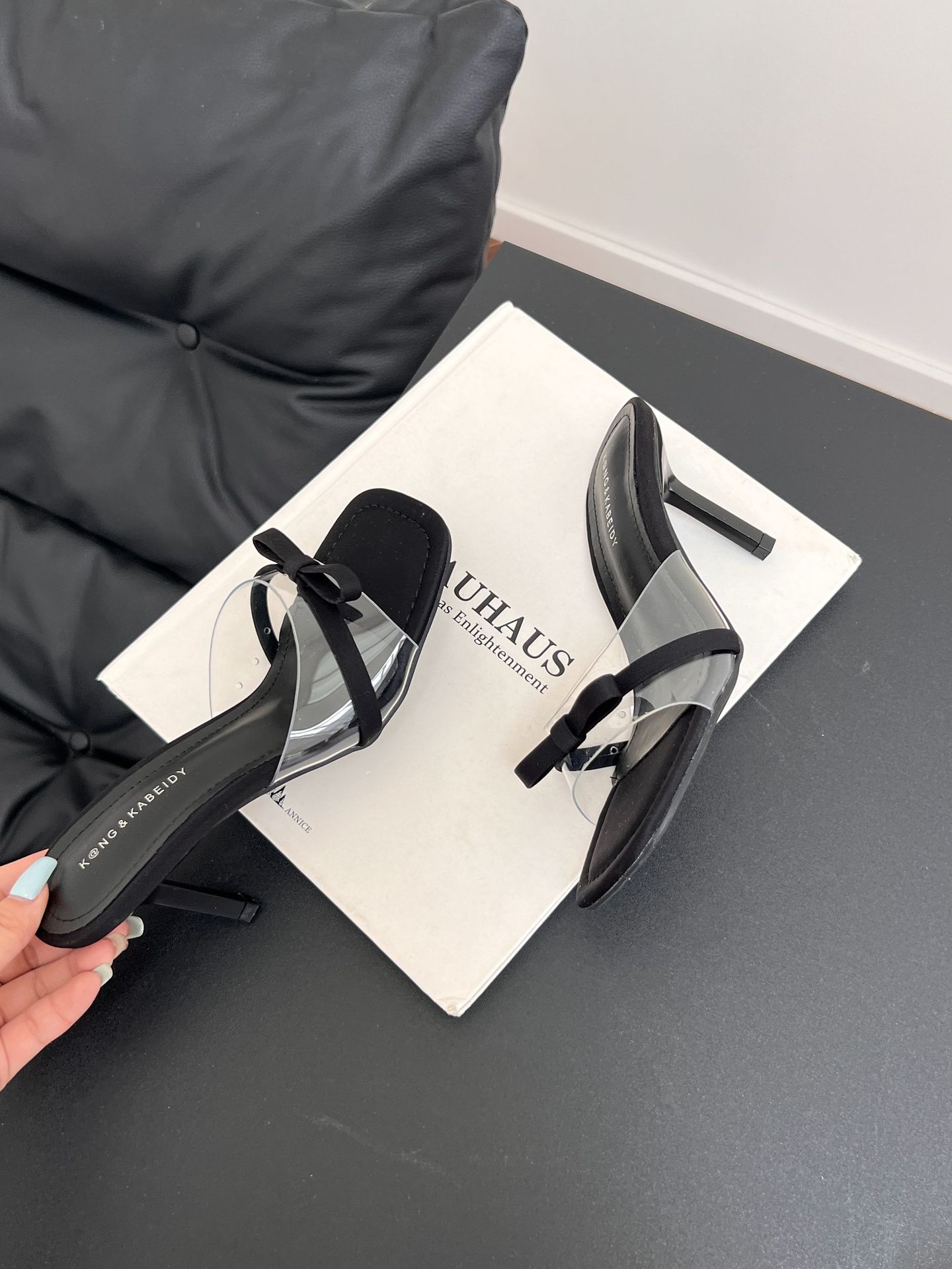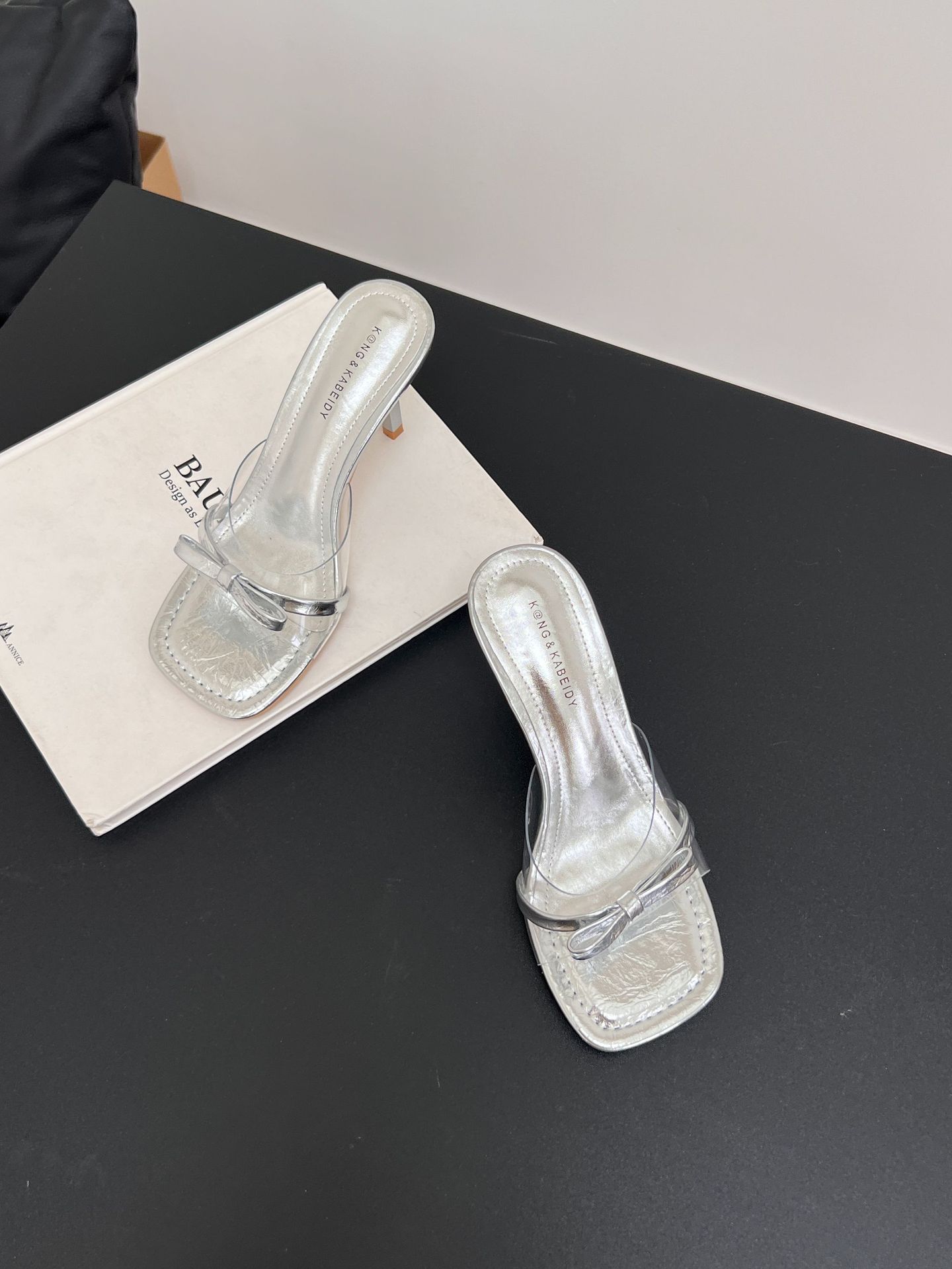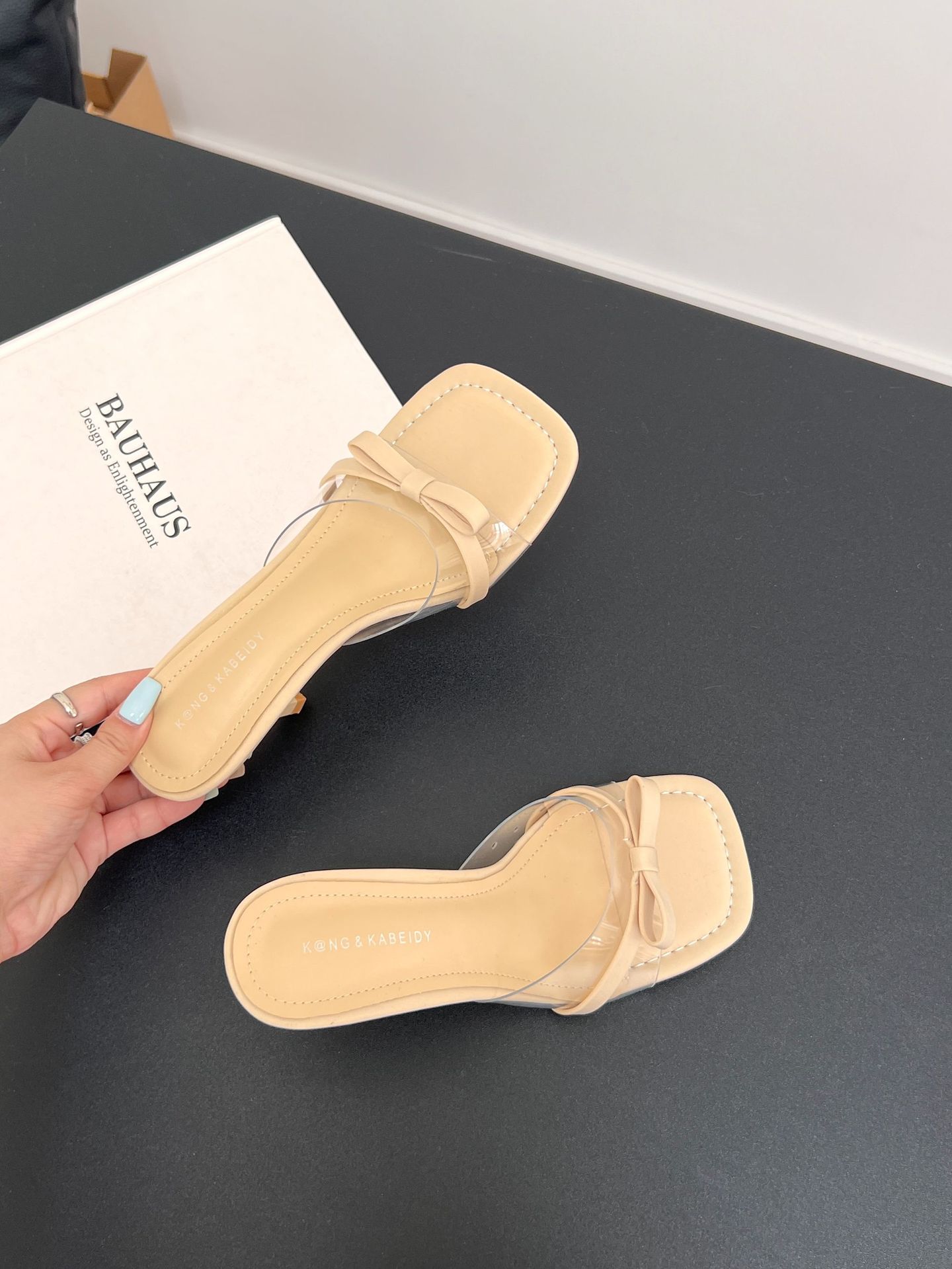 Новинка 2023 года, открытые сандалии и тапочки с прозрачным бантом и квадратным носком интернет-знаменитостей, самые последние модели подходят на очень высоком каблуке-шпильке