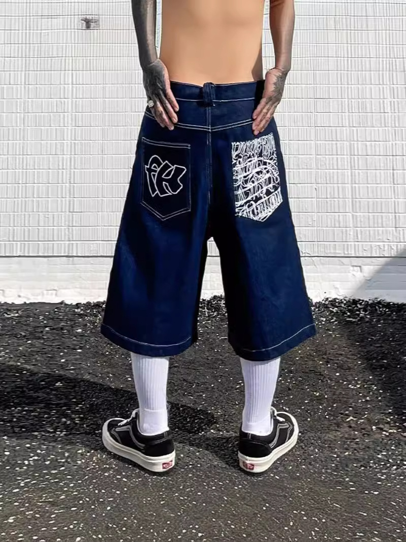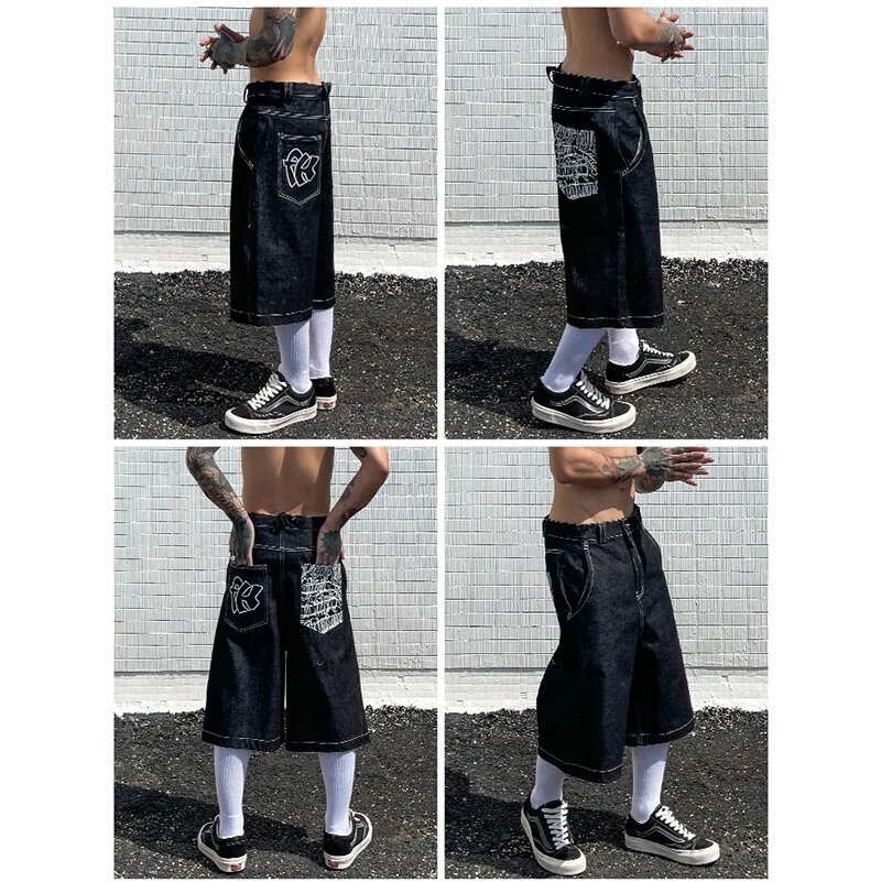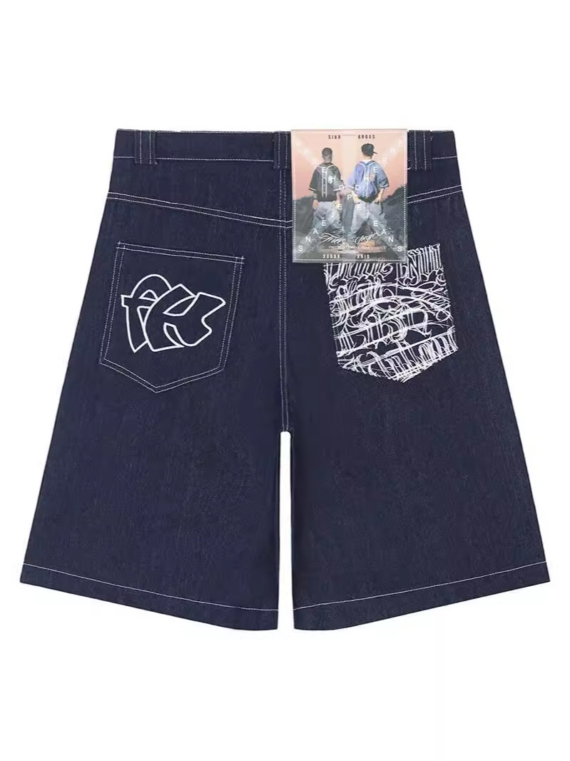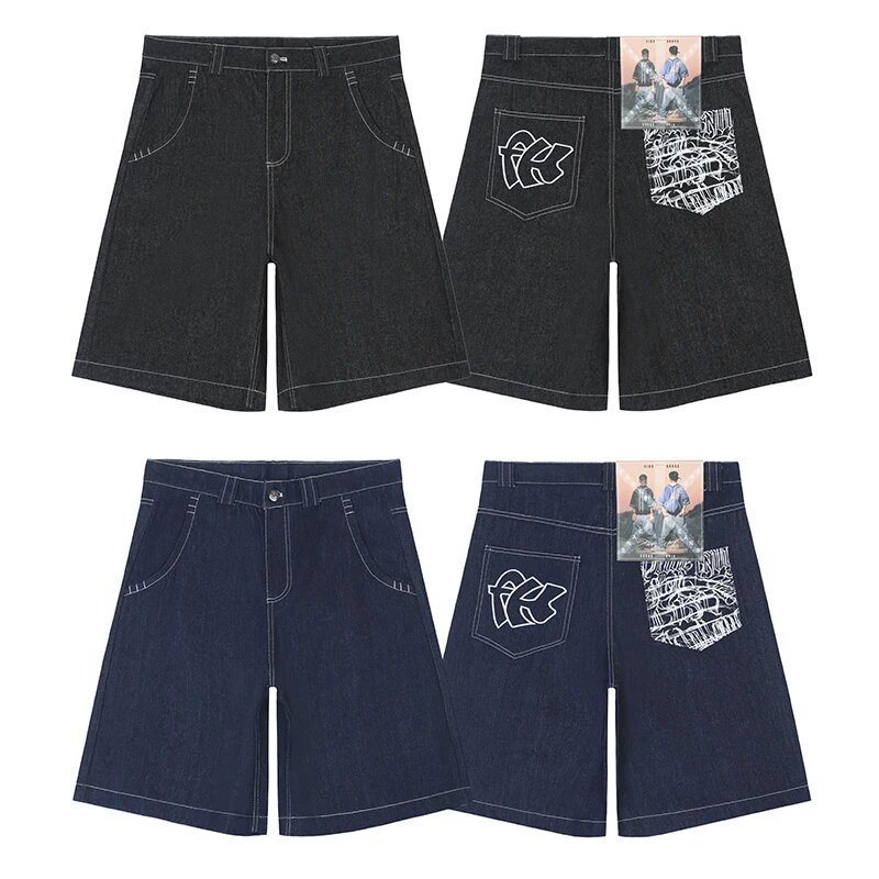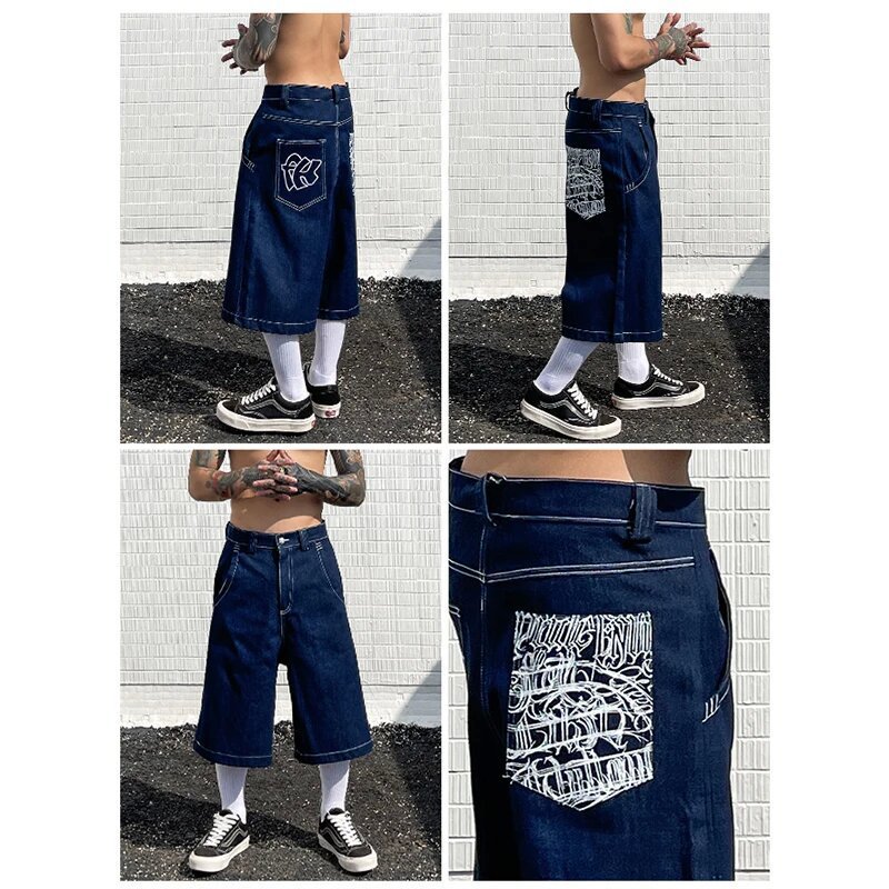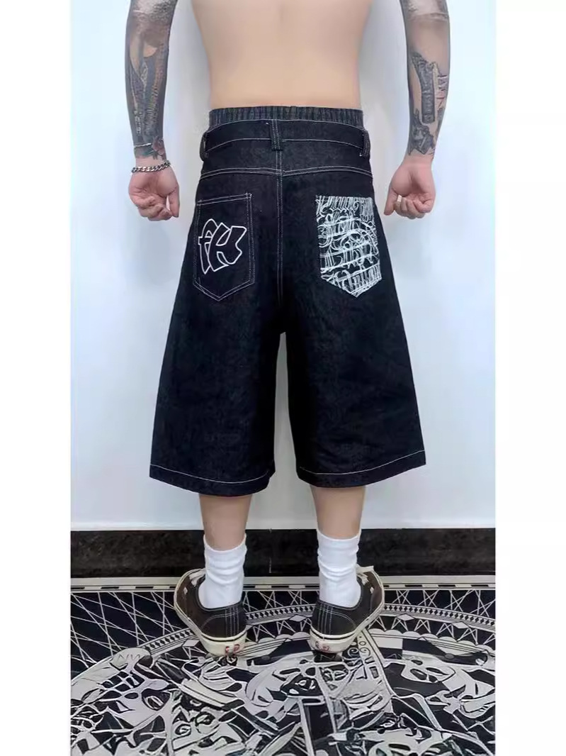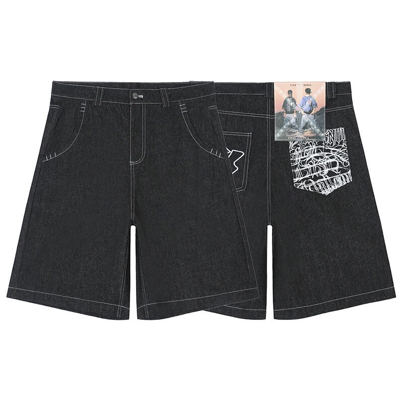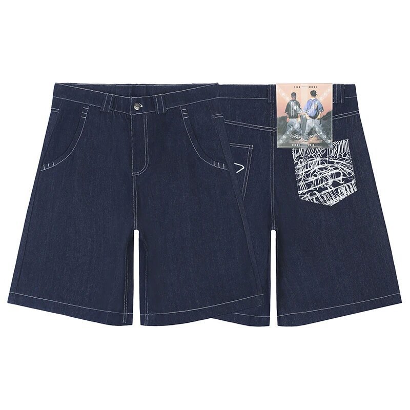 Хип-хоп карманные вышитые буквенные принты джинсы мужские шорты ретро лето негабаритные широкие джинсы колено брюки