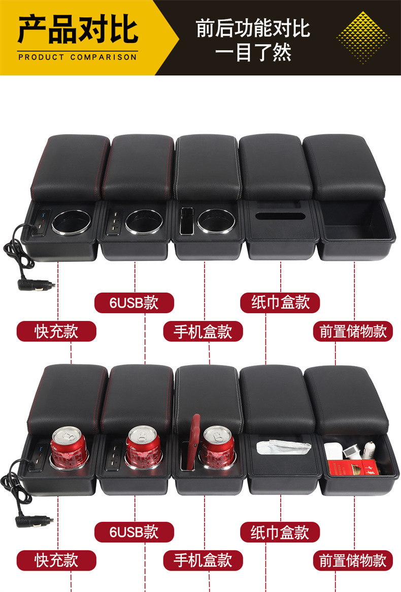 【产品特点】:本产品简约创意、设计独特、大容量收纳空间,适用于各类汽车原车没有中控扶手箱安装使用。主要功能为缓解胳膊疲劳,杂物收纳,保持车内整洁有序,增强坐车时的舒适体感,兼具USB供电和水杯架等功能。