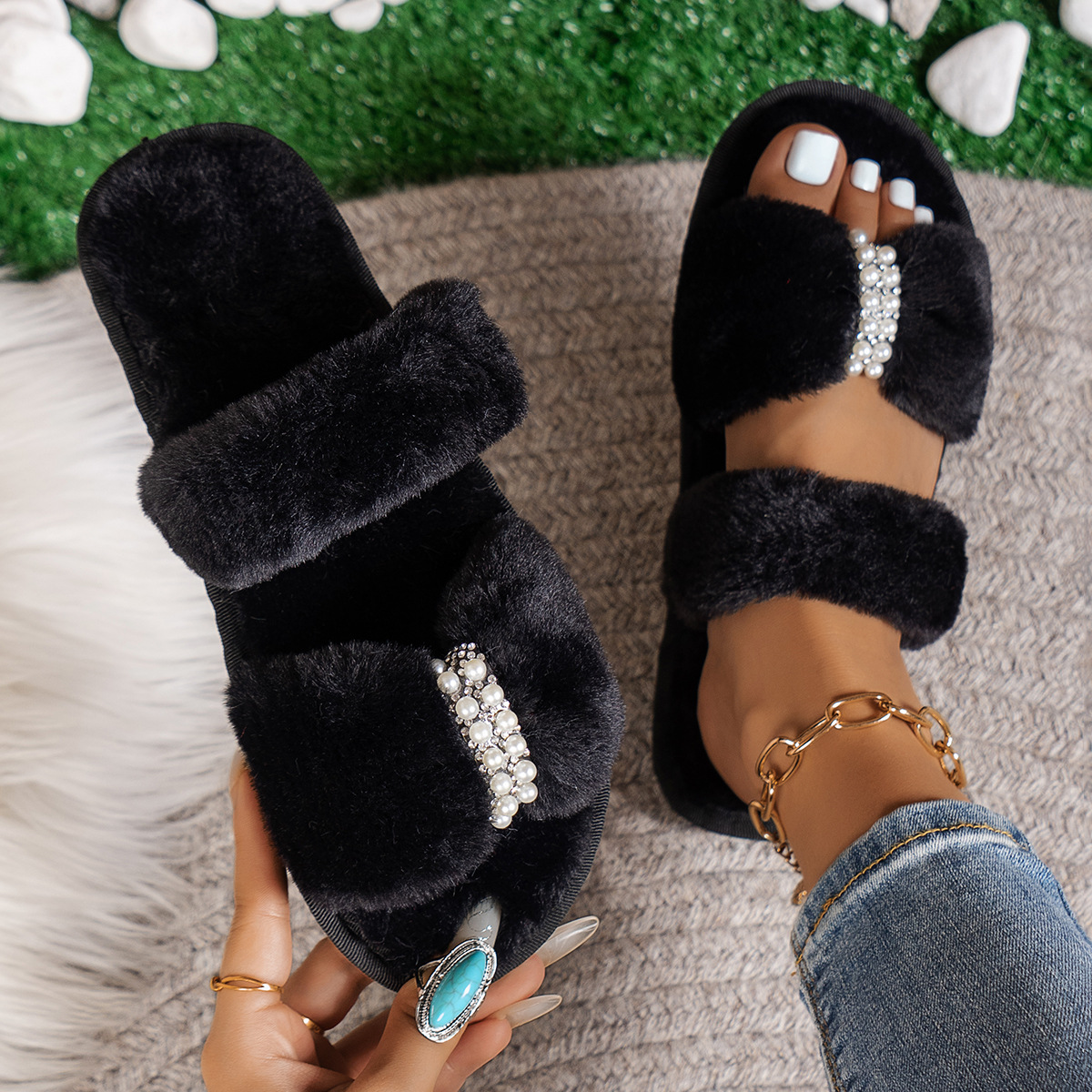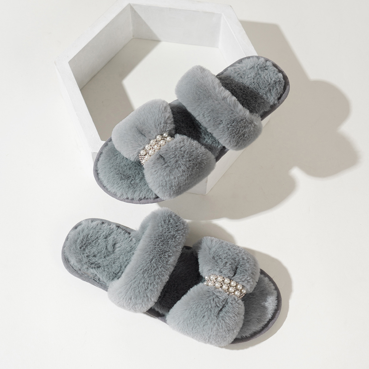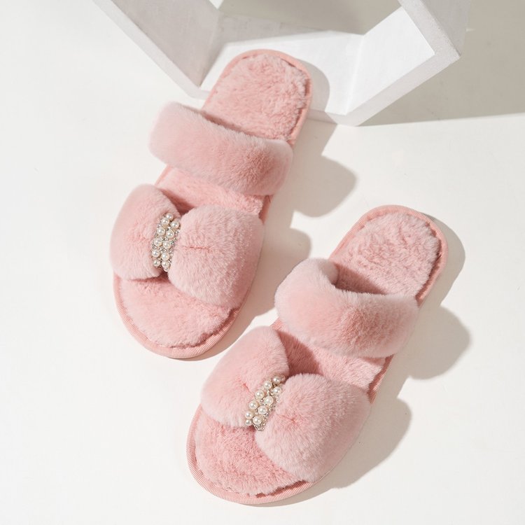 Трансграничная внешнеторговая продажа плюшевых хлопковых тапочек с стразами и жемчугом, новые осенне-зимние женские домашние плюшевые тапочки на плоской подошве с открытым носком оптом.