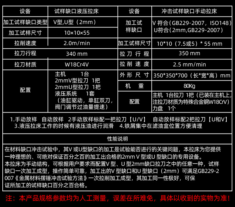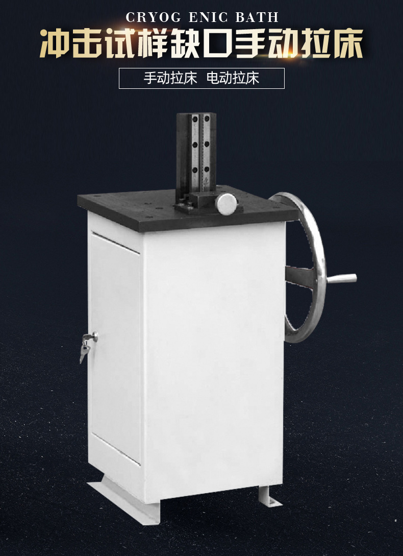 冲击试样缺口拉床是国内除光学曲线磨床外能加工出合格试样缺口的工具。由于一次成型加工原理,其加工出的缺口的同一性好。该系列产品,目前国内可分为:冲击试样缺口手动拉床(单刀)、冲击试样缺口电动拉床(双刀),以及冲击试样缺口液压电动拉床(双刀)等几种,该产品满足GB/P229-2007《金属材料 夏比摆锤冲击试验方法》如果改变结构形式及更换重要相关零件,可同时满足美标、欧标ASTM、E23-02a、EN10045、ISO148、ISO083等国际标准。