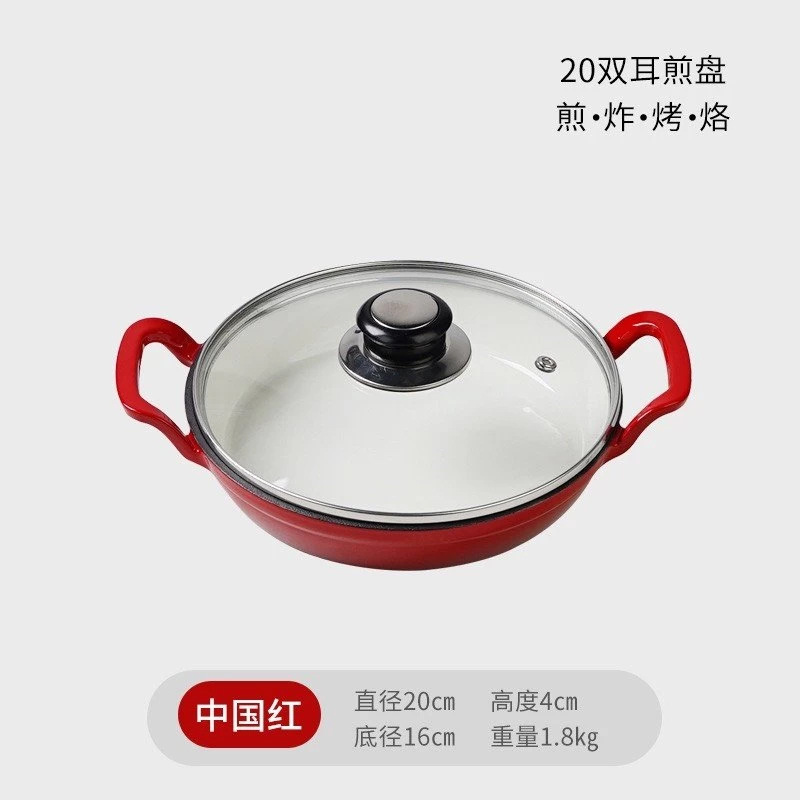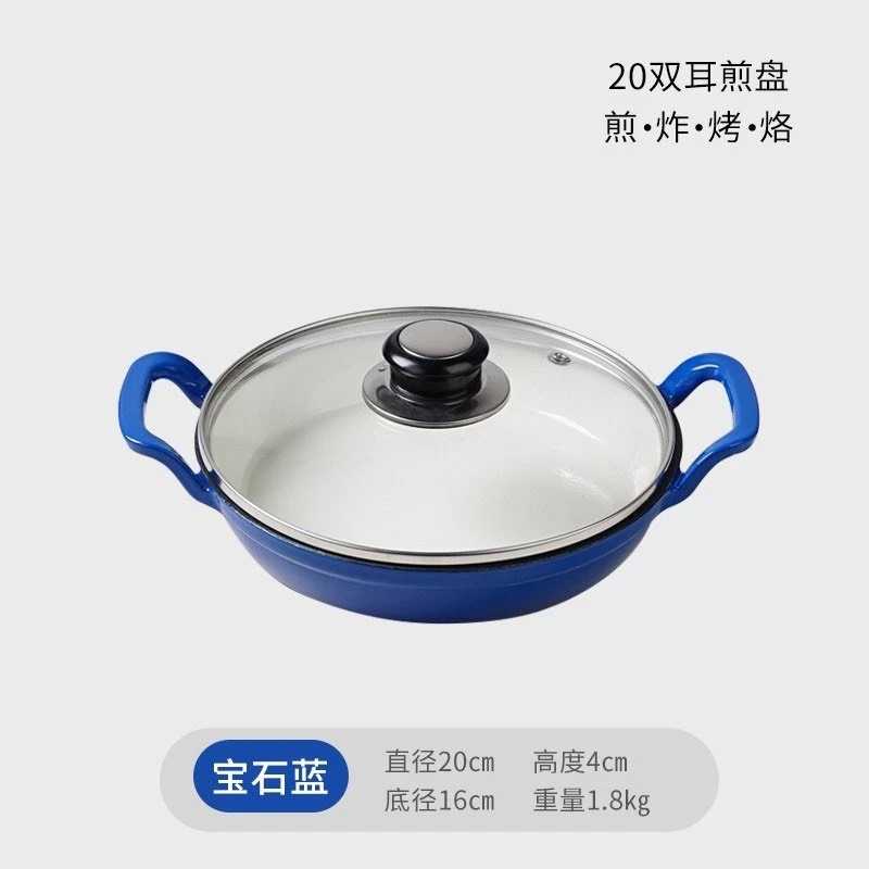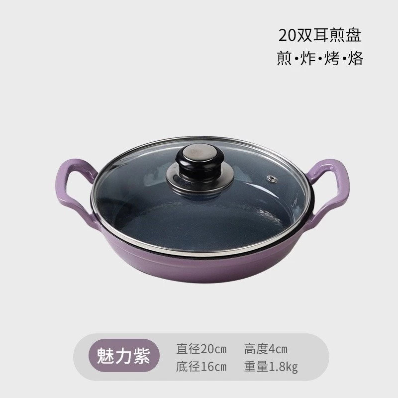 20cm красная бинауральная эмалевая сковорода; 20cm красная двойная ушная стеклянная крышка сковороды; 20cm фиолетовая бинауральная эмалевая сковорода (внутри черный); 20cm фиолетовый бинауральный маленький стеклянный чехол для сковороды; 20cm синяя бинауральная эмалевая сковорода; 20cm синий двойной ушей маленькая стеклянная крышка сковороды