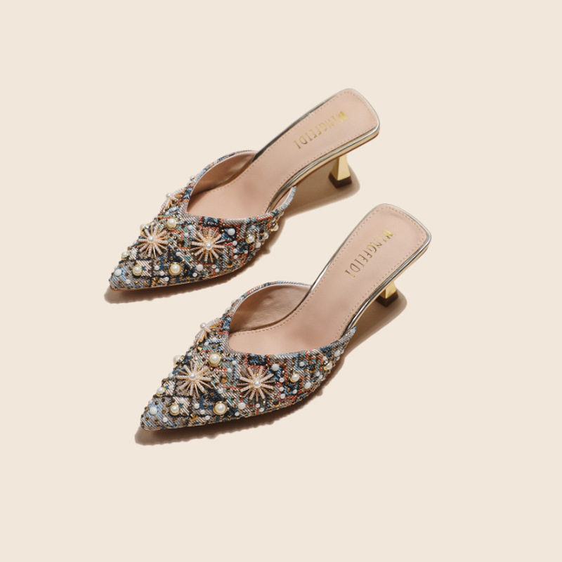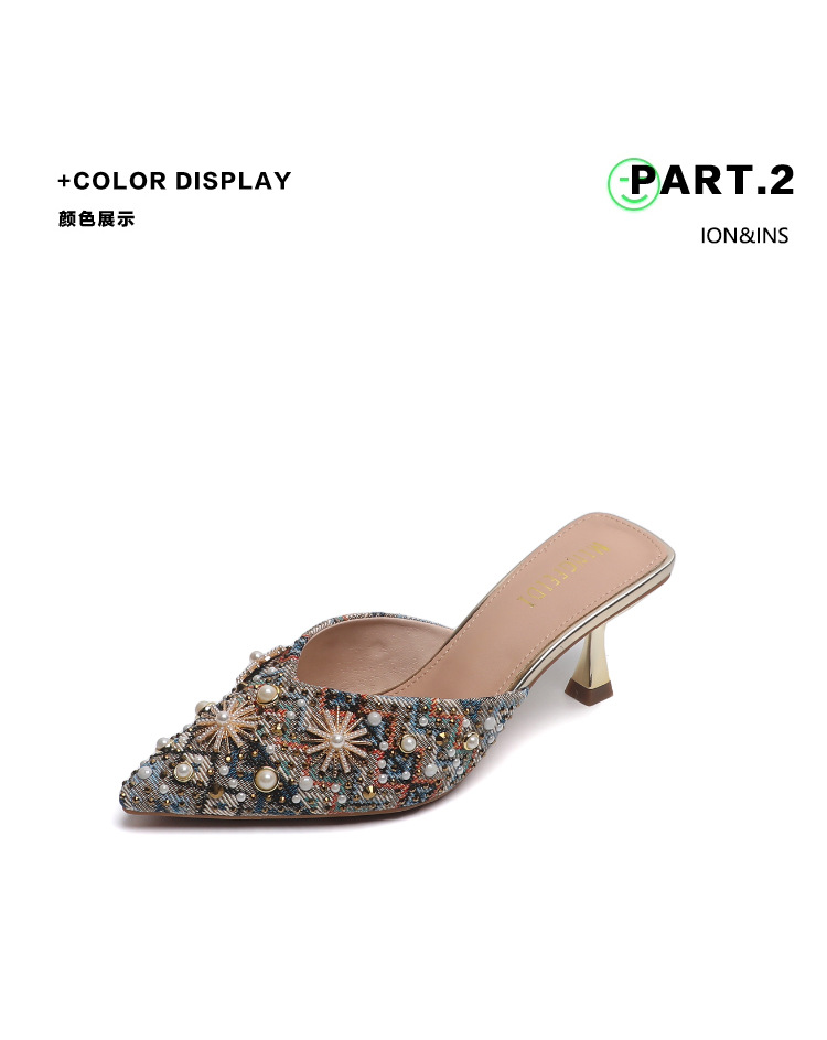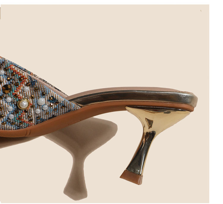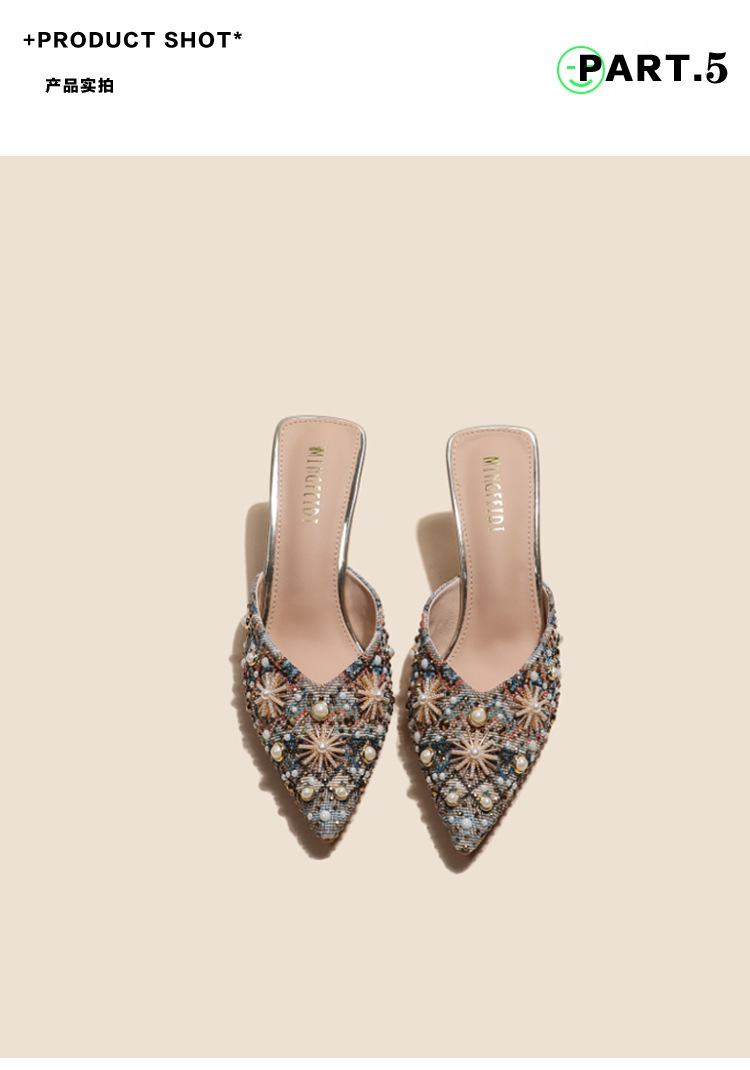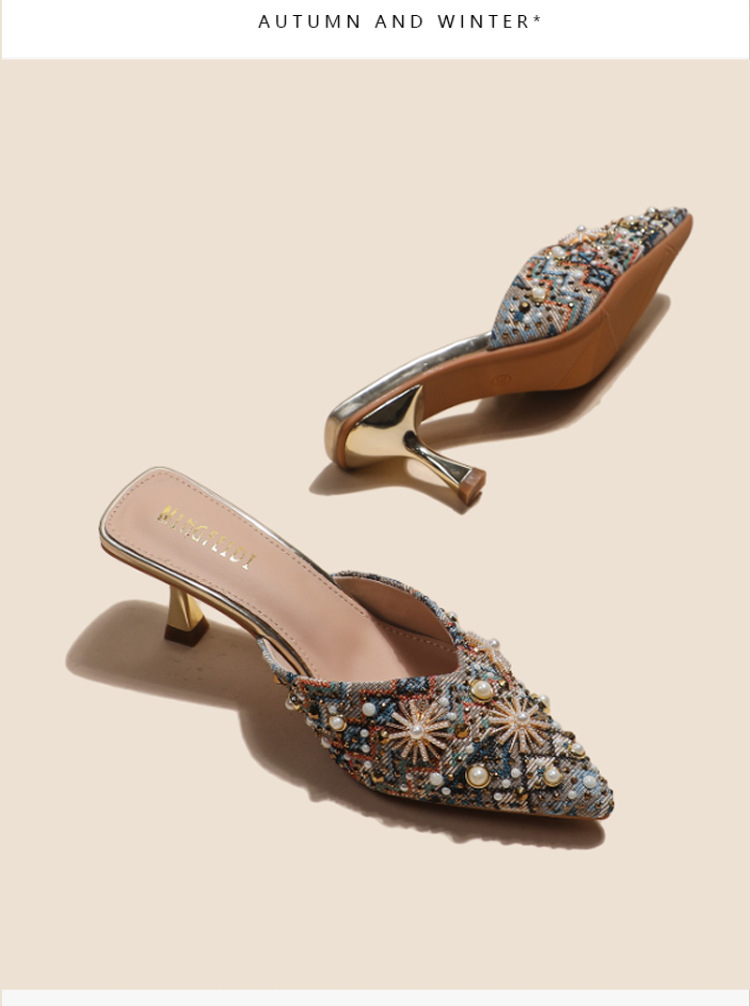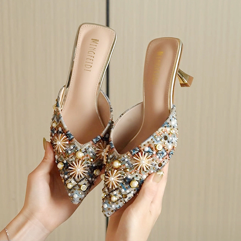 Летний 2024 новый сетчатый красный стразы полутапочки Баотоу холодные тапочки на высоком каблуке женские модные каблуки