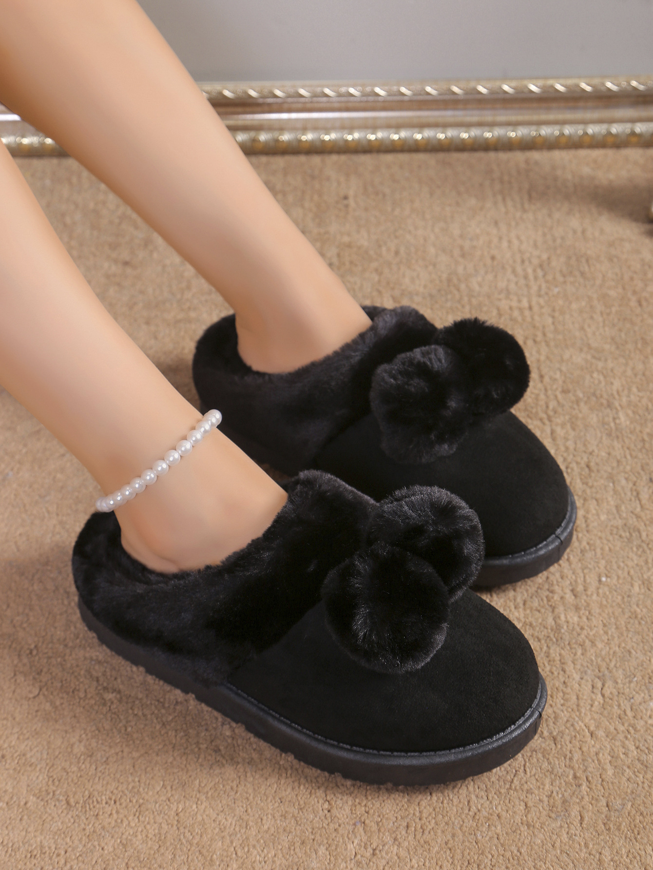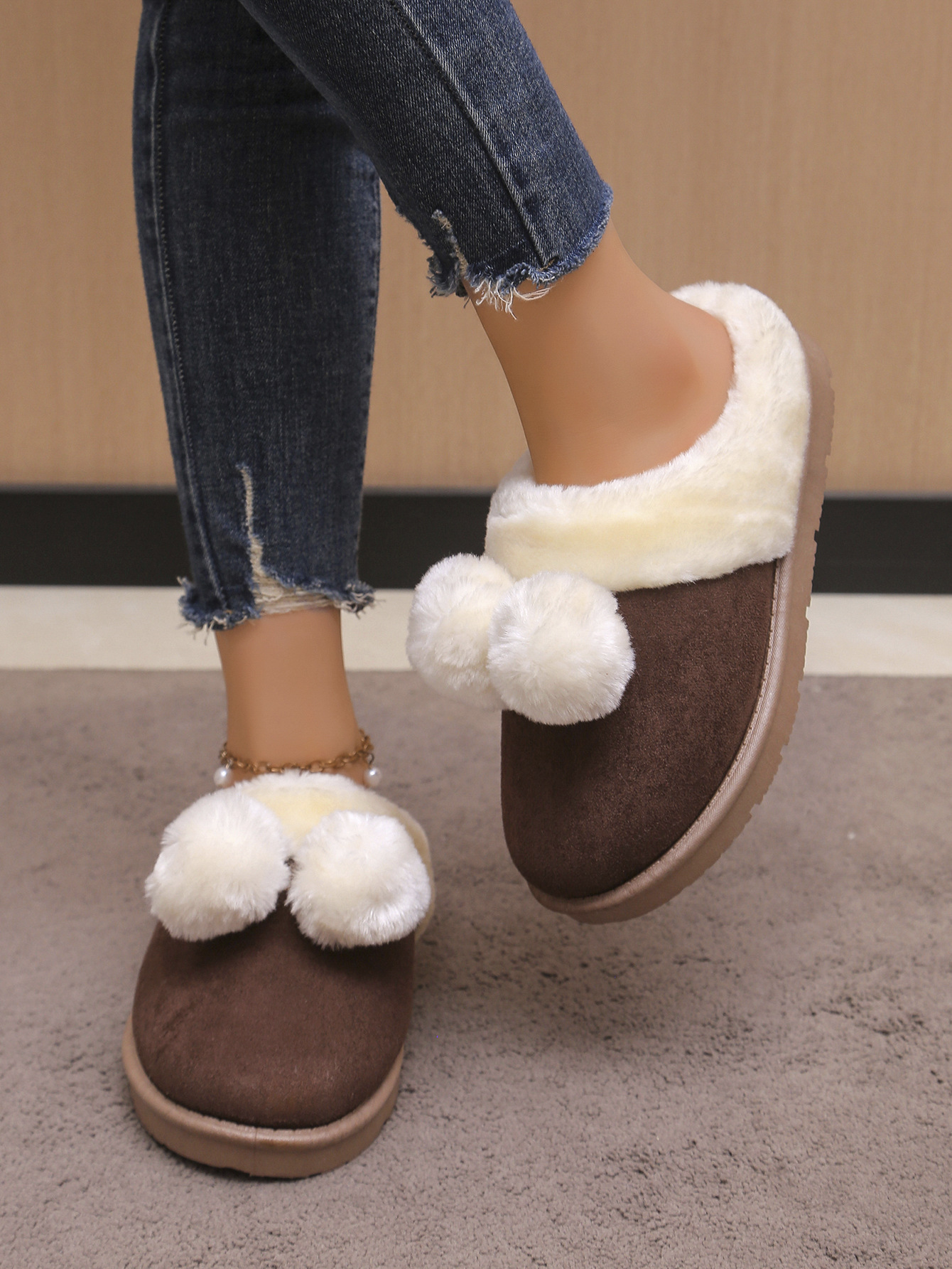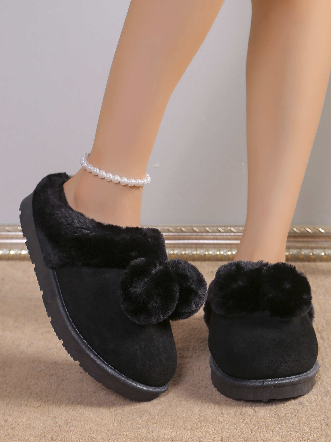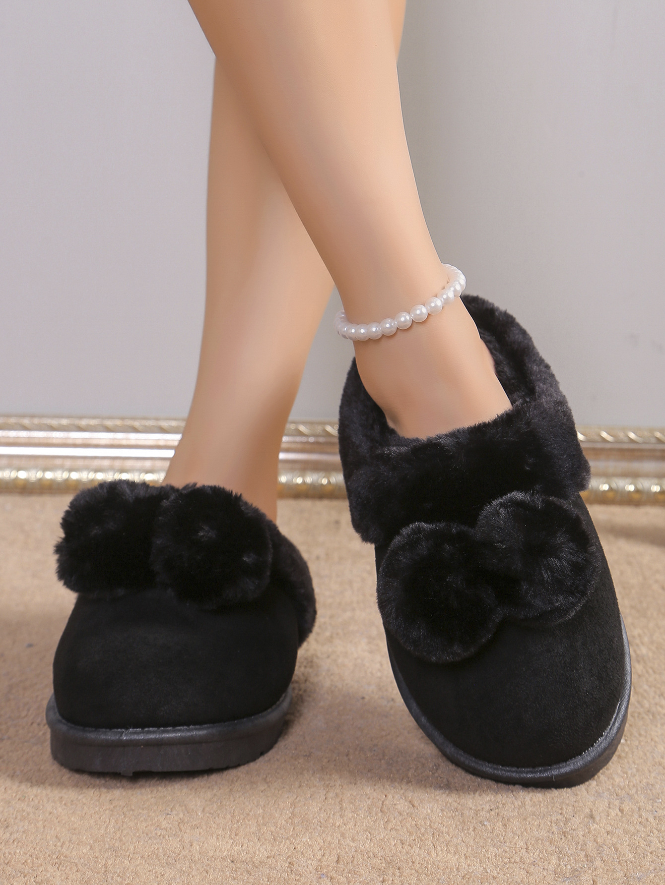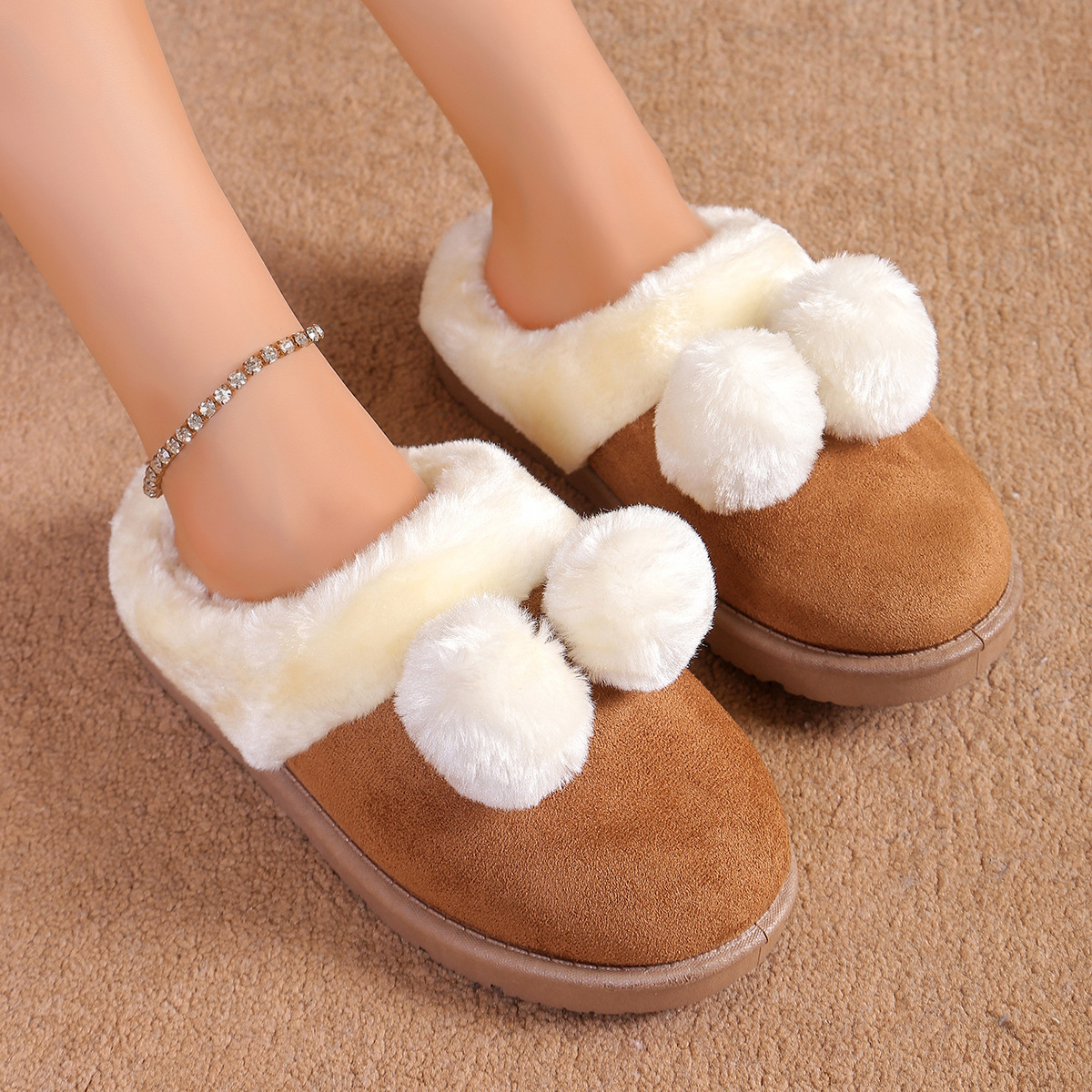 Симпатичные шарики трансграничные TEMU снежные сапоги полуперетаскивания 2024 осень и зима новая толстая подошва меховые туфли женские наружные носки плюс бархат