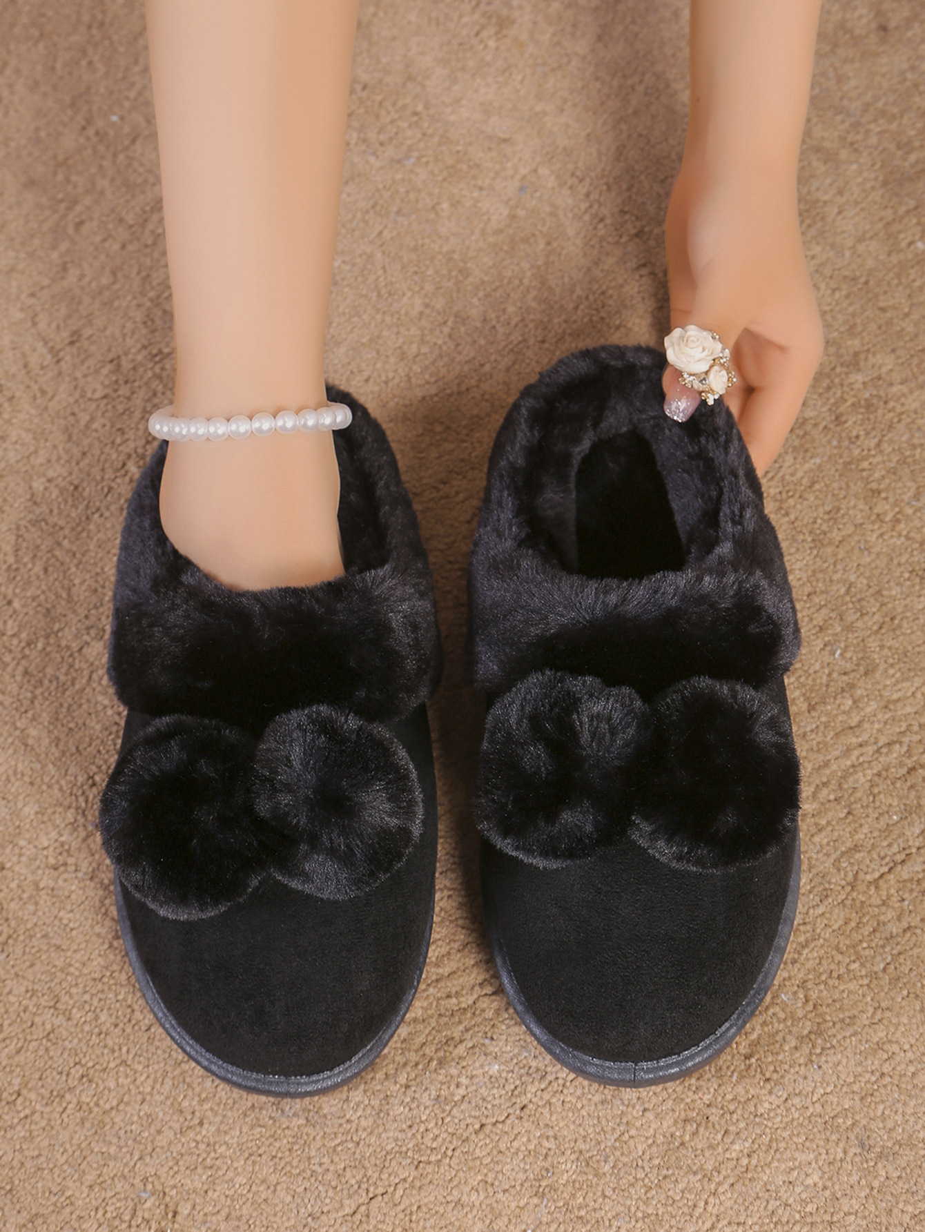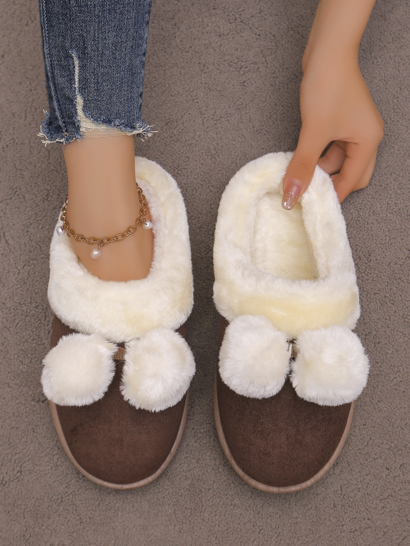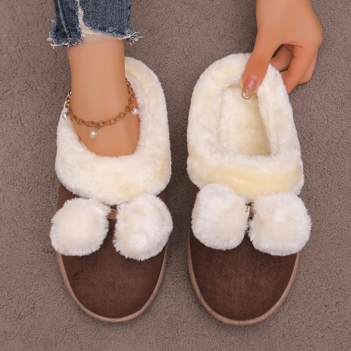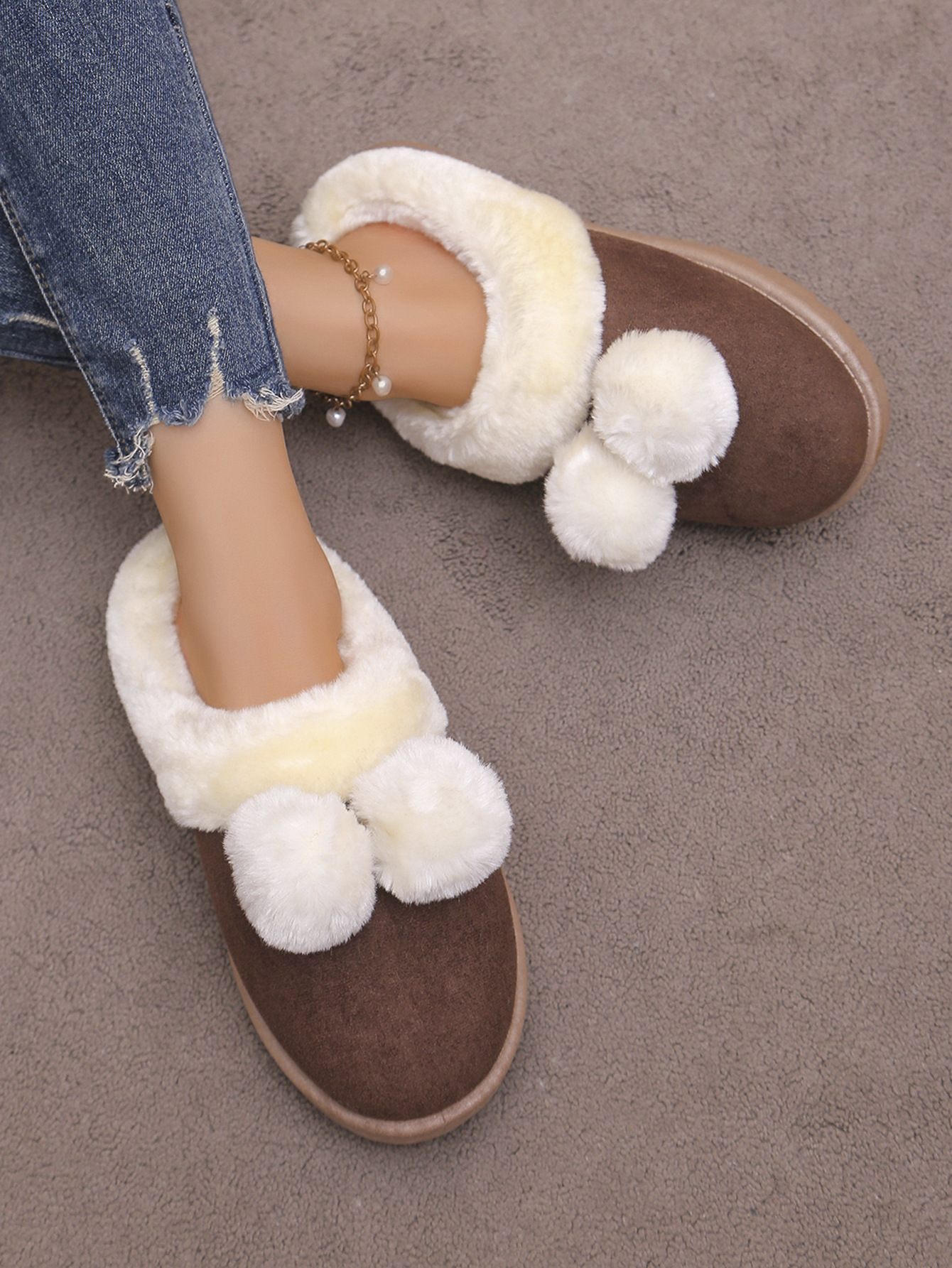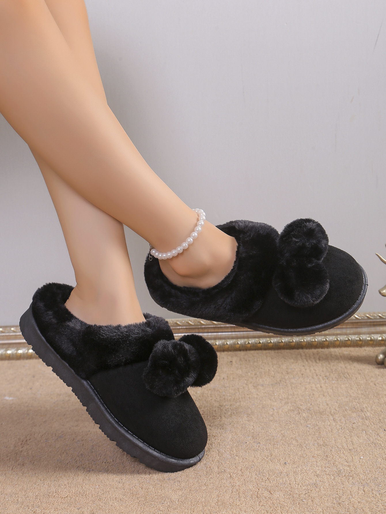 Симпатичные шарики трансграничные TEMU снежные сапоги полуперетаскивания 2024 осень и зима новая толстая подошва меховые туфли женские наружные носки плюс бархат