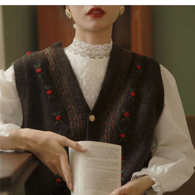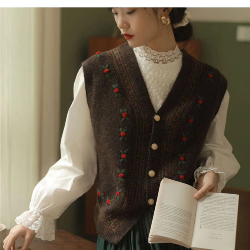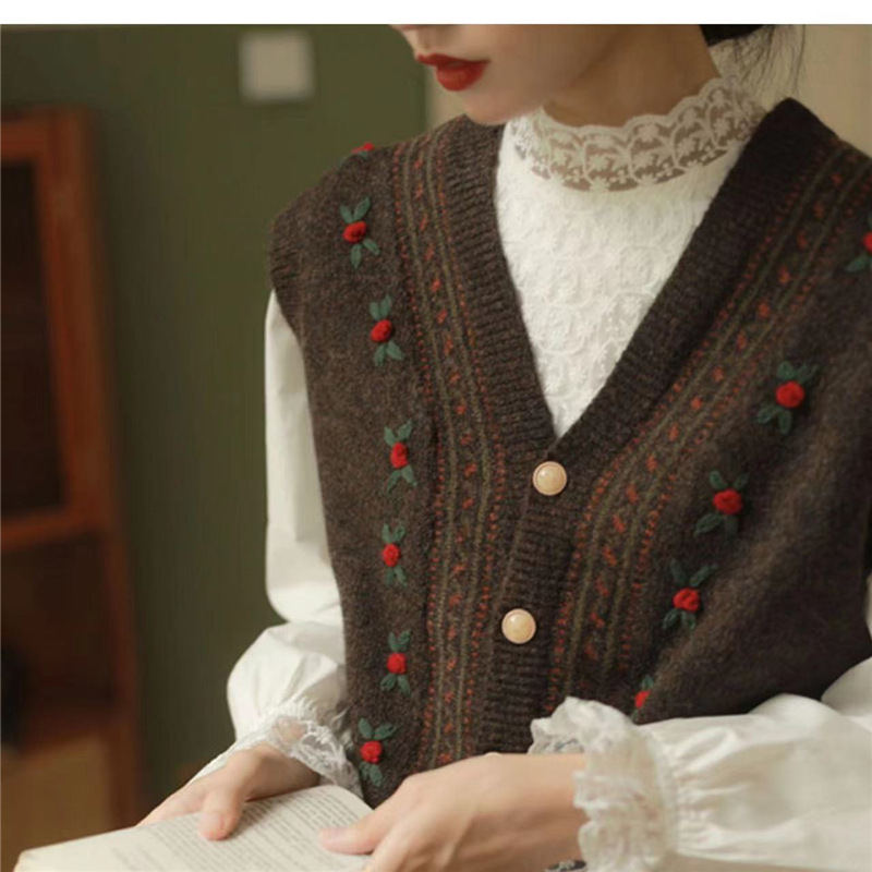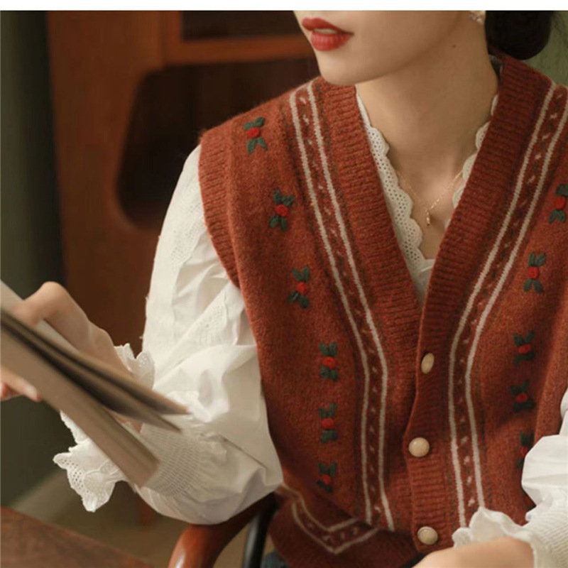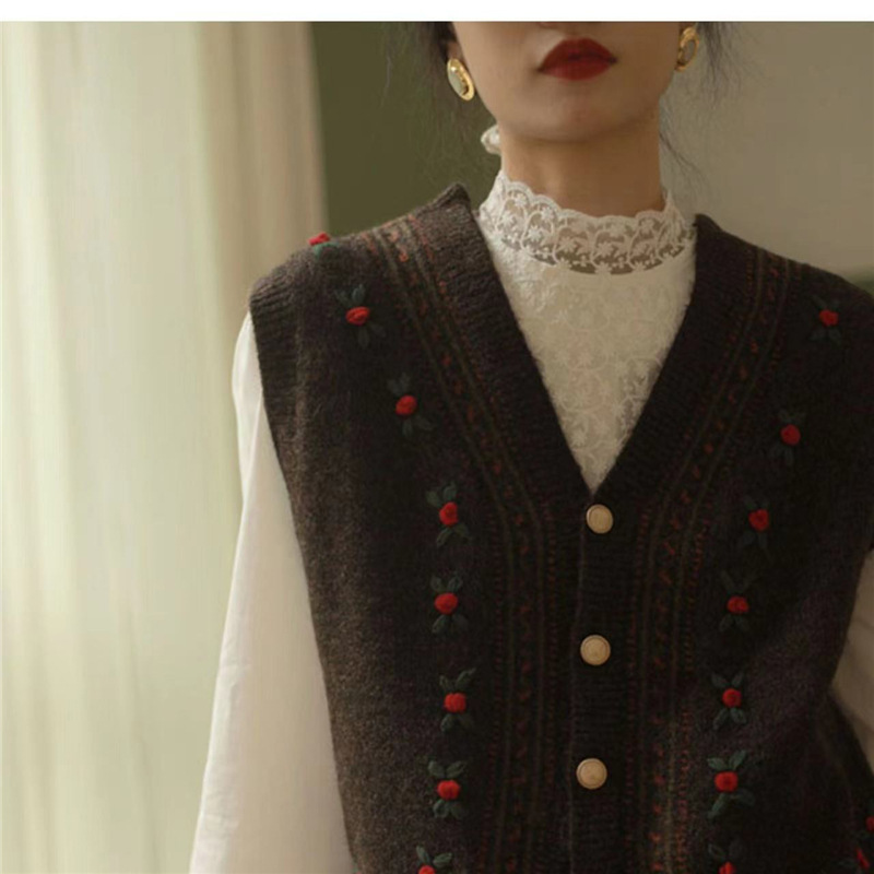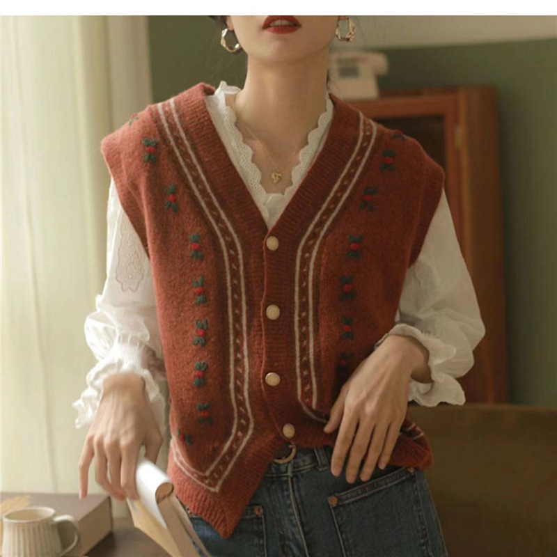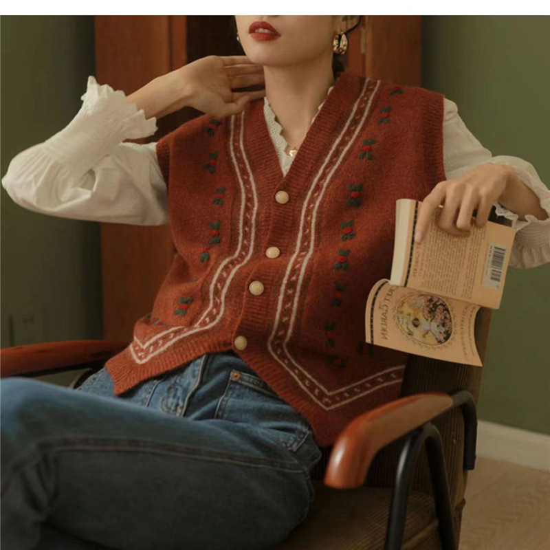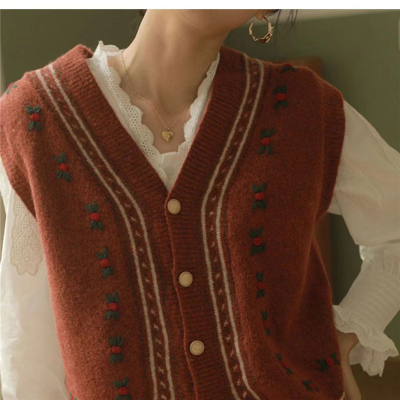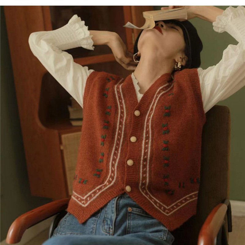 Французский ретро с вышивкой v-образным вырезом маленький ароматный ветер вязаный жилет женский весенний свитер кардиган жилет топ