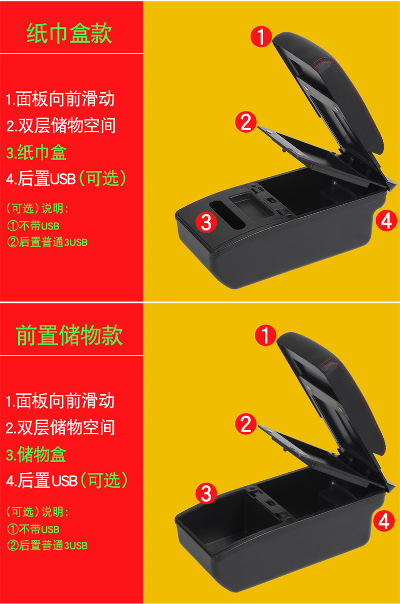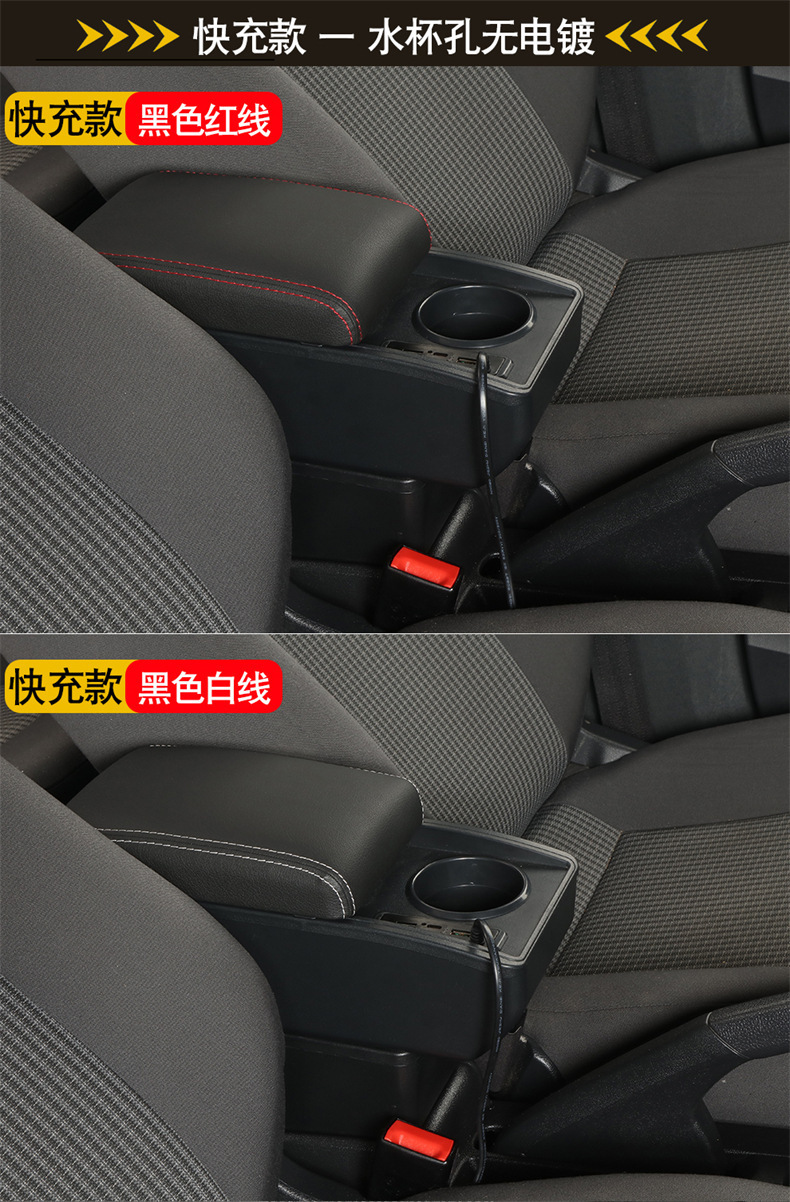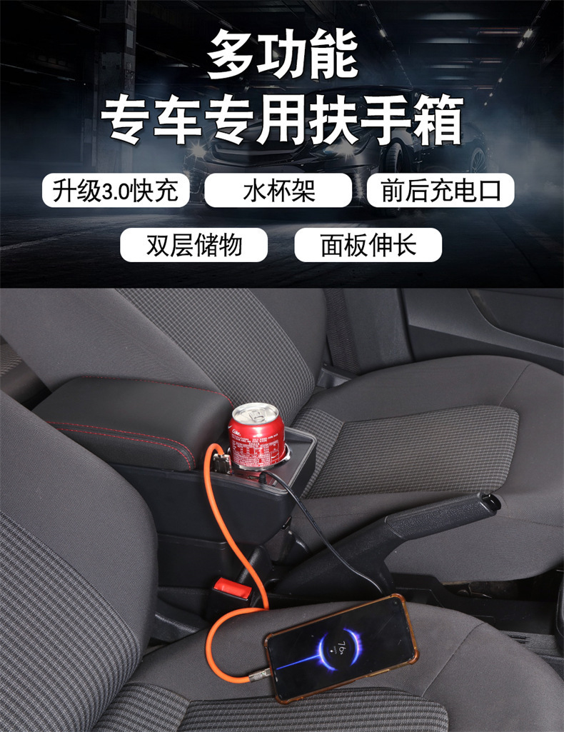 【产品特点】:本产品简约创意、设计独特、大容量收纳空间,适用于各类汽车原车没有中控扶手箱安装使用。主要功能为缓解胳膊疲劳,杂物收纳,保持车内整洁有序,增强坐车时的舒适体感,兼具USB供电和水杯架等功能。