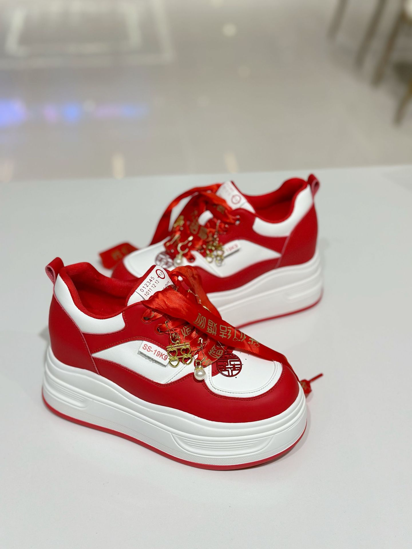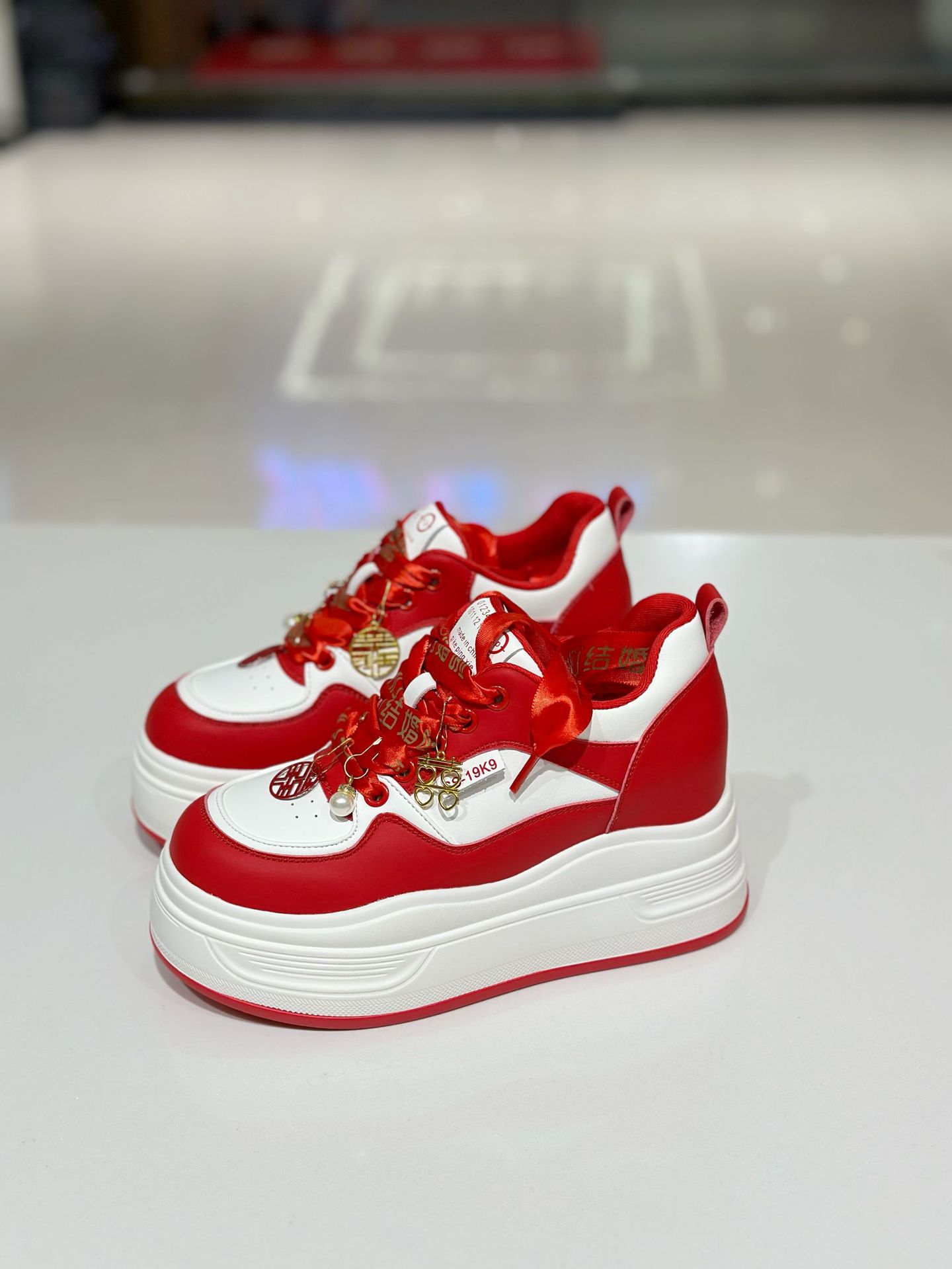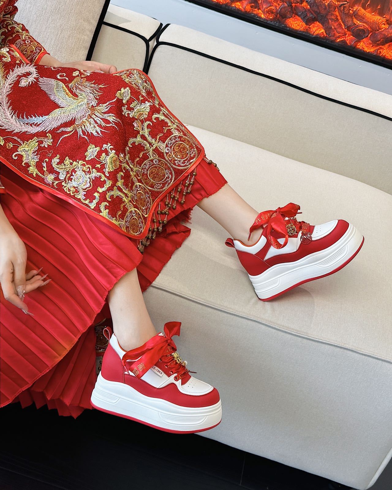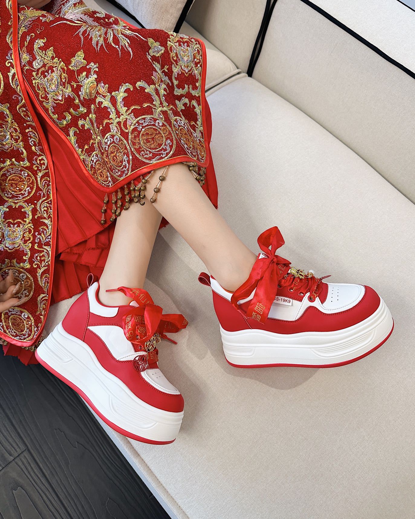 Подарочные красные свадебные туфли Xiuhe, новинка 2025 года, свадебные туфли на толстой подошве, внутренняя высота 9 см, повседневные туфли из натуральной кожи на высоком каблуке для подружки невесты