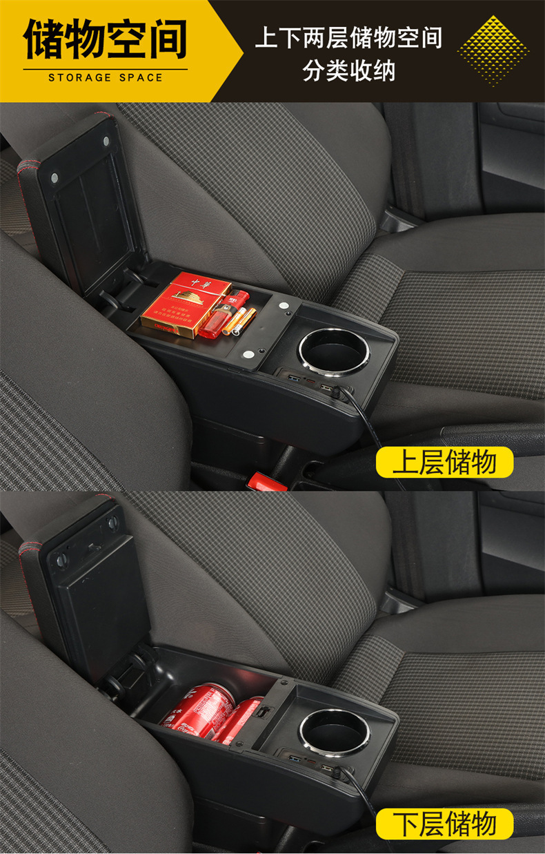 【产品特点】:本产品简约创意、设计独特、大容量收纳空间,适用于各类汽车原车没有中控扶手箱安装使用。主要功能为缓解胳膊疲劳,杂物收纳,保持车内整洁有序,增强坐车时的舒适体感,兼具USB供电和水杯架等功能。