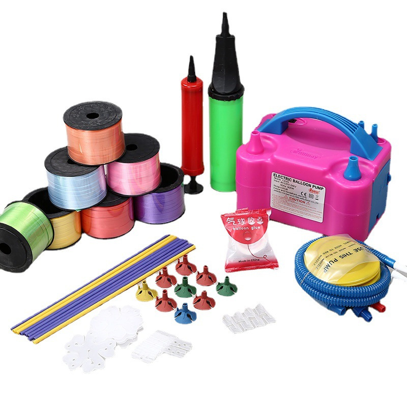 1 ручной насос (случайный цвет); 1-футовый насос; Дозирование воздушного шара 1 рулон; 1 рулон красной ленты; 1 рулон розовой ленты; 1 рулон фиолетовой ленты; 1 рулон двустороннего скотча; 1 рулон текстурированного клея; 1 рулон прозрачного клея; 1 рулон поролонового клея; 1 рулон без перманентного клея; 1 рулон цепочки из воздушных шаров длиной 5 м (двойное отверстие); 1 кнопка с цветком сливы; 1 электрический насос; 1 узловязатель