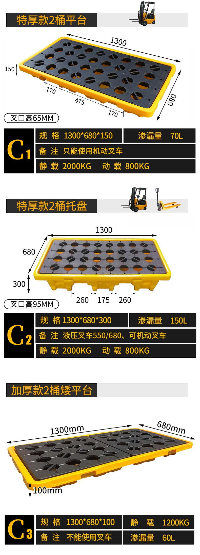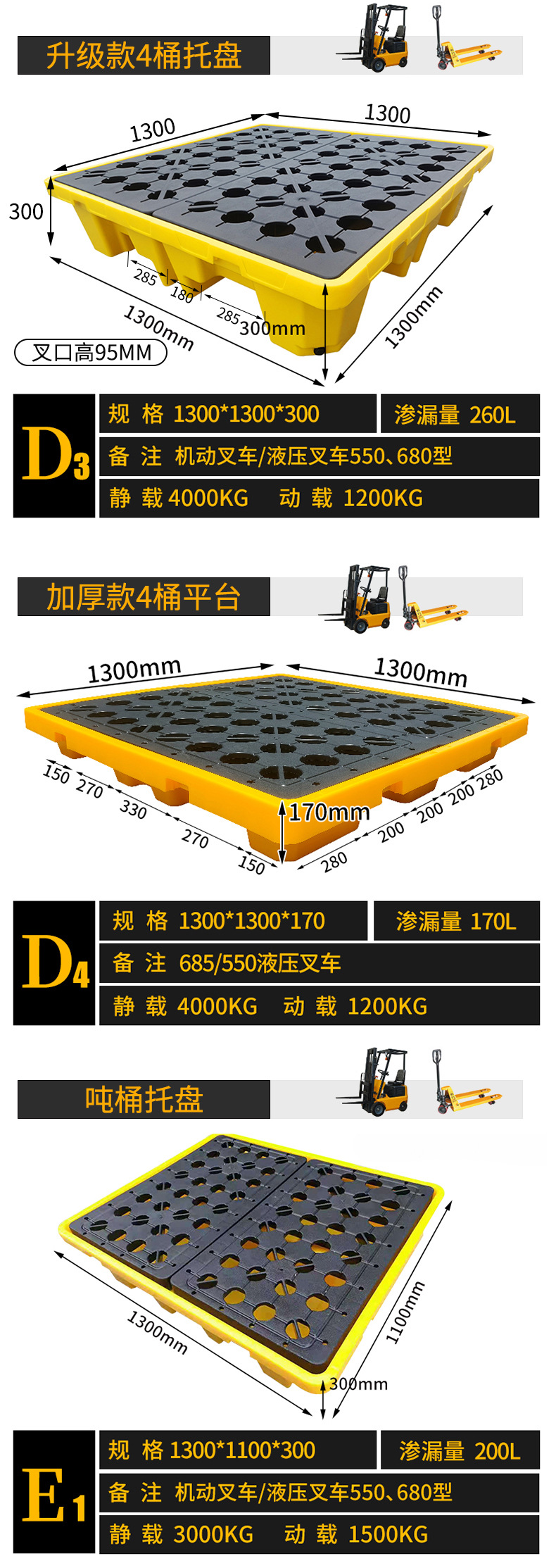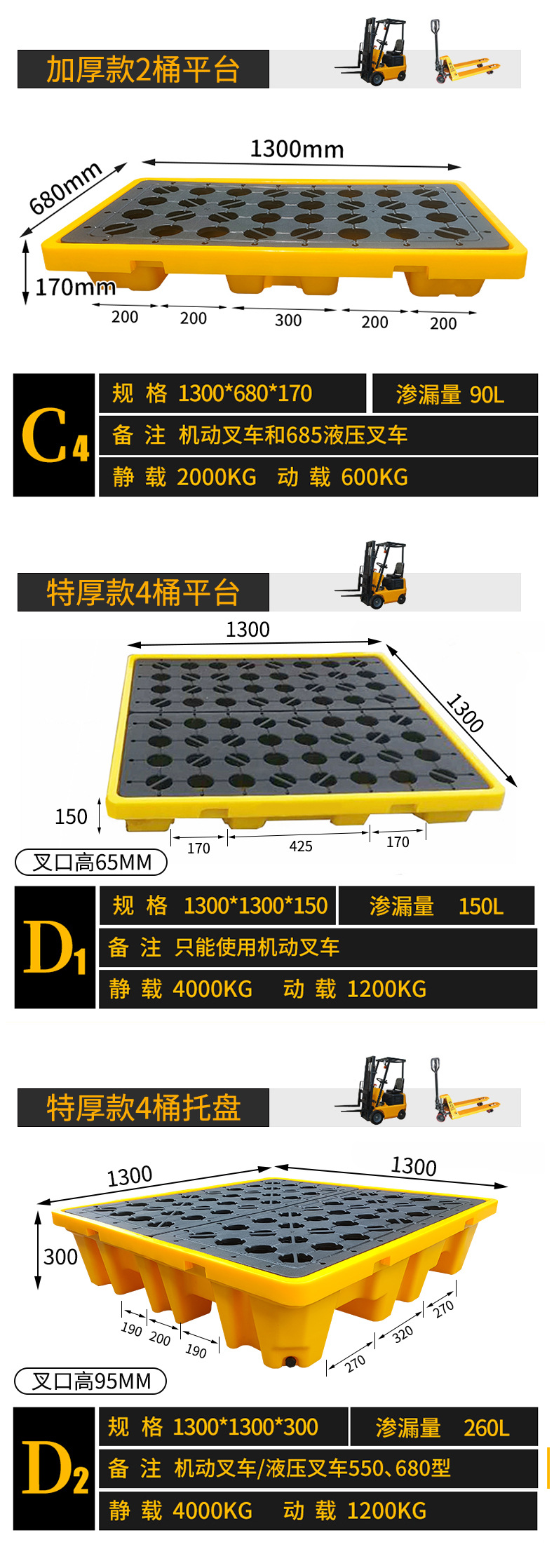Настольный компьютер A1, небольшая платформа, очень толстая версия 500*360*100, вилочная погрузка не может быть вилочной погрузкой; Мини-платформа A2, очень толстая модель 330*330*60 вмещает ведра объемом 25 л и 1 ведро.; Мини-платформа A3 очень толстая модель 665*370*100 вмещает ведра объемом 25 л и 2 бочки.; B1 однобочечная платформа, очень толстая модель 670*670*150 не может быть вилочным погрузчиком; Одноствольный лоток B2, очень толстая модель 680*680*150 может иметь ручной вилочный погрузчик шириной 550; C 0.05kg Стойковая платформа очень толстая 1300*680*150 ручной гидравлический вилочный погрузчик; C 0.1kg Дуже толстый лоток для ствола 1300*680*300 Ручной вилочный погрузчик; C 0.15kg Утолщенная модель с бочковой платформой 1300*680*100 не может использоваться вилочный погрузчик; C 0.2kg Стойковый лоток очень толстый 1300*680*170 можно использовать для ручного вилочного погрузчика шириной 680.; C 0.25kg Стволная платформа 1200*600*170 ручной гидравлический вилочный погрузчик; C 0.3kg Платформа-бочка простая модель 1200*600*170 без черной крышки; Д1 четырехствольная платформа, очень толстая модель 1300*1300*150, ручной гидравлический вилочный погрузчик; Д2 четырехствольный лоток, очень толстая модель 1300*1300*300, ручной гидравлический вилочный погрузчик; Модернизированная модель с четырехствольным лотком D3 1300*1300*300, ручной гидравлический вилочный погрузчик; Четырехствольная платформа D4, утолщенная версия 1300*1300*170, ручной гидравлический вилочный погрузчик; Четырехствольная платформа D5 1200*1200*170 ручной гидравлический вилочный погрузчик; Четырехствольная платформа D6, простая модель 1200*1200*170 без черной крышки; E1 тонный бочковый лоток 1300*1100*300 ручной гидравлический вилочный погрузчик; Наклон B1200*800*150 с поддоном; Наклон A1200*800*300 соответствующий лоток