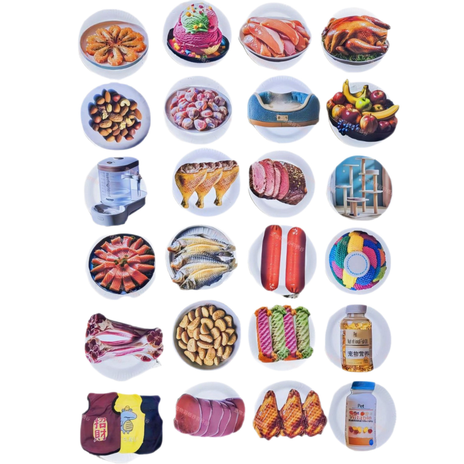 Куриная кожа и кусочки куриных ножек 1; 1 бумажный игрушечный шарик; Бумажная тарелка с рыбным филе 1; бумажный витамин 1; бумажный рыбий жир 1; Бумажные куриные крылышки 1; Бумажная большая кость 1; Диспенсер для бумаги 1; Кусочки желтой куриной голени 1; бумажный стейк 1; Целая курица на бумаге 1; Игрушка для укуса бумаги 1; Бумажная тарелка с куриными грудками; Бумажная ветчина 1; бумажное мороженое 1; Бумажные цыплячьи гризуны 1; бумажный лосось 1; Регби из бумажной тарелки; Каркас для лазания бумажного кота; бумажные креветки; Бумажные ломтики мяса 1; бумажные орехи; бумажный перепел; бумажная одежда