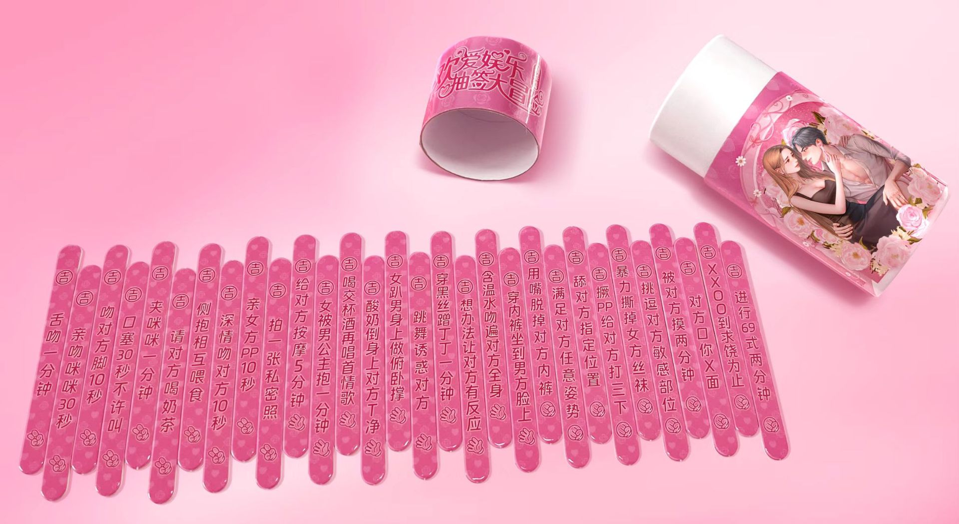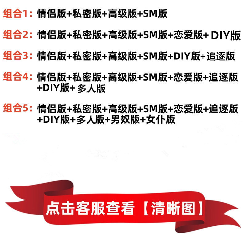 Парная версия + частная версия + шахматные фигуры и кости; Парная версия + расширенная версия + шахматные кости; Расширенная версия + версия SM + шахматные кости; Расширенная версия + приватная версия + шахматные кости; Версия «Любовь» + версия «Сделай сам» + шахматные фигуры и игральные кости; Версия «Охота» + версия «Сделай сам» + шахматные фигуры и игральные кости; Версия «Охота» + версия для четырех игроков + кости для шахматных фигур; Мужская рабская версия + версия горничной + кости шахматных фигур; Студенческая версия + версия секретаря + шахматные кости (в нее могут играть три человека); Комбинация 1 + кубики шахматных фигур; Комбинация 2+шахматные кости; Комбинация 3+шахматные кости; Комбинация 4+ шахматных кубиков; Комбинация 5+ шахматных фигур в кубиках; карта полета; Лотерейное ведро; люби смело; Любите свободно; Небесный свиток; земной свиток; частные дела; Секретный код; Свиток неба + свиток земли; Свиток Неба + Свиток Земли + Секретные вещи; Красочные забавные кубики; Пара кубиков с буквами; Пара светящихся букв; Поза кубика; Одна поза, светящаяся в темноте; Сексуальные чулки и нижнее белье; разорванные вручную носки; Сексуальная маска для глаз черная; Сексуальная маска для глаз белая; Сексуальная кружевная маска для глаз; кожаная маска для глаз; Вибрационная массажная палочка для яиц LILO; жидкость для кульминации удовольствия; Смазка Дуай 8мл; Смазка 60 мл коробка; Вода для орального секса в стиле Ван (пара); Взрывные леденцы (пара); Сексуальный комплект нижнего белья; Сексуальный капающий воск (чашка); Кисточка с кисточкой (длина 50 см); Зажим для груди Zhenghuan Shake Leaf Palace Bell (твердый переплет); Сексуальная маска для глаз черная; Сексуальная маска для глаз белая