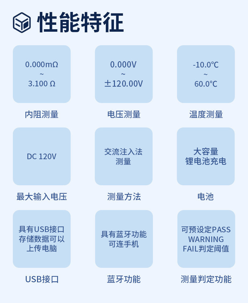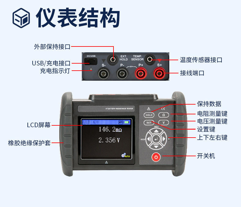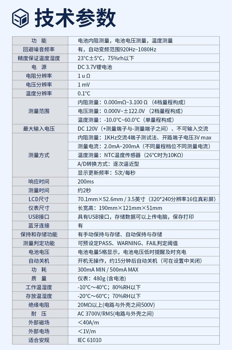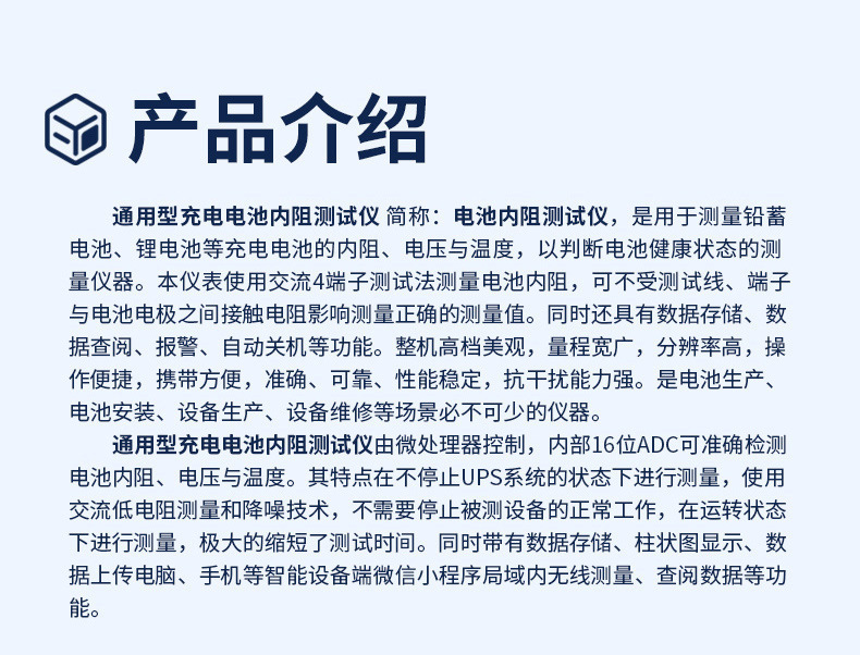 Он используется для измерения внутреннего сопротивления, напряжения и температуры свинцовых, литиевых батарей и других батарей для определения состояния батареи.