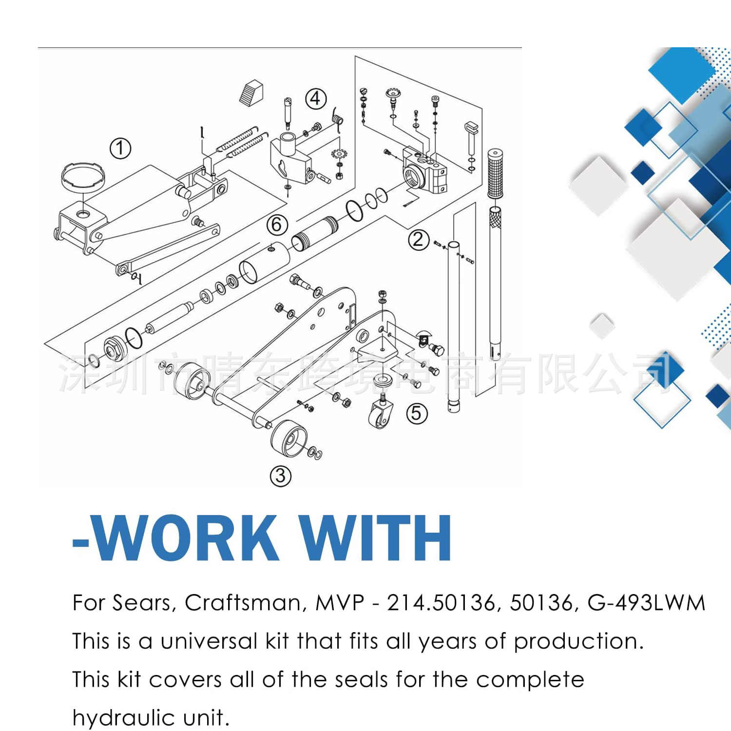 功能:全套密封件,用于更换或修理 Sears(工匠)地板千斤顶液压