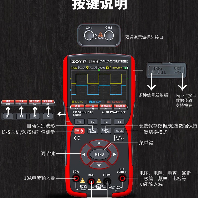 ZOYI многофункциональный мультиметр генератор сигналов осциллограф 702S703S 3-в-1 высокографический осциллограф