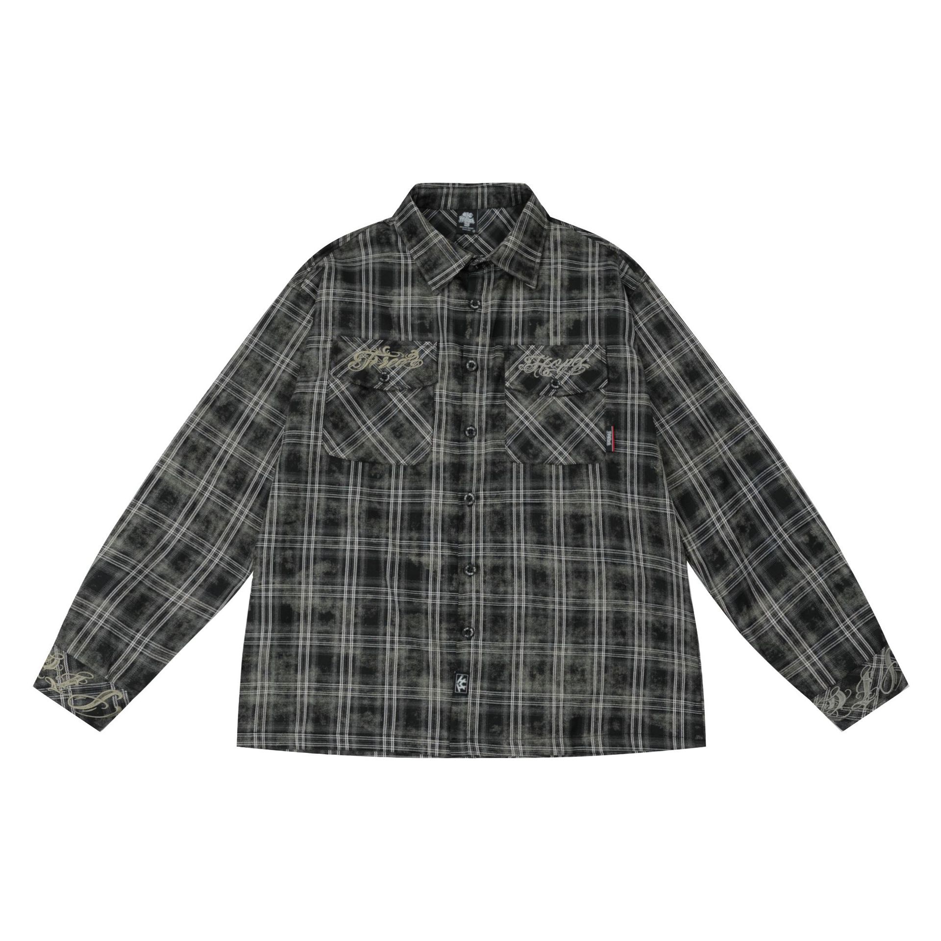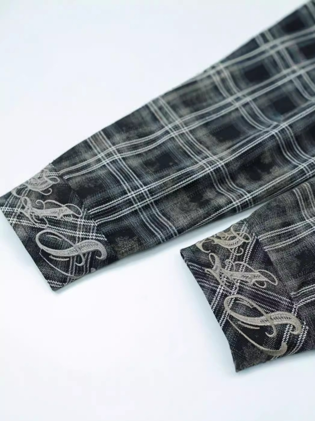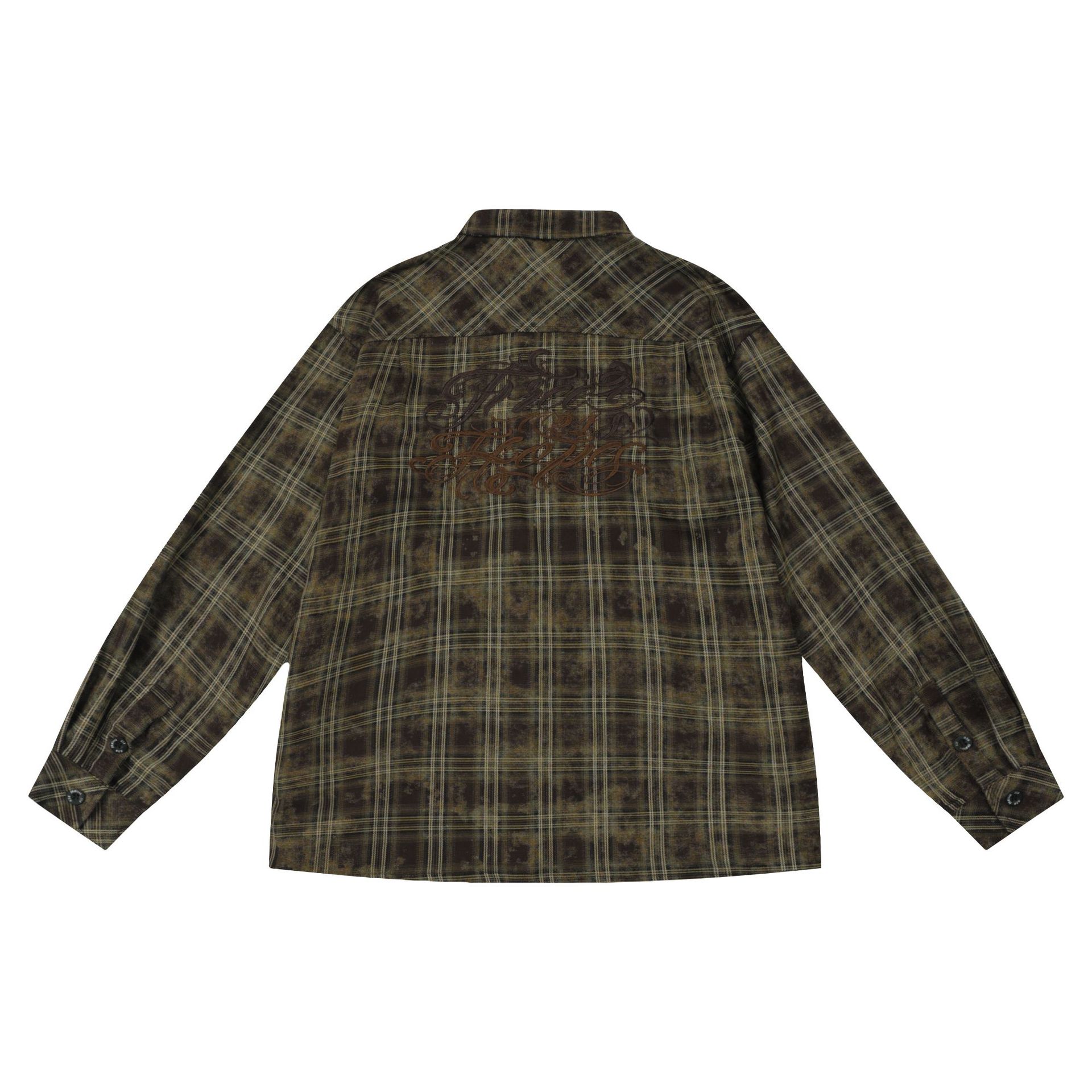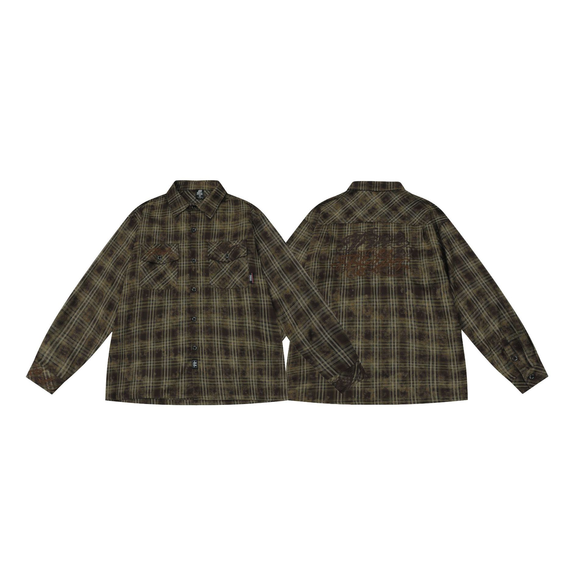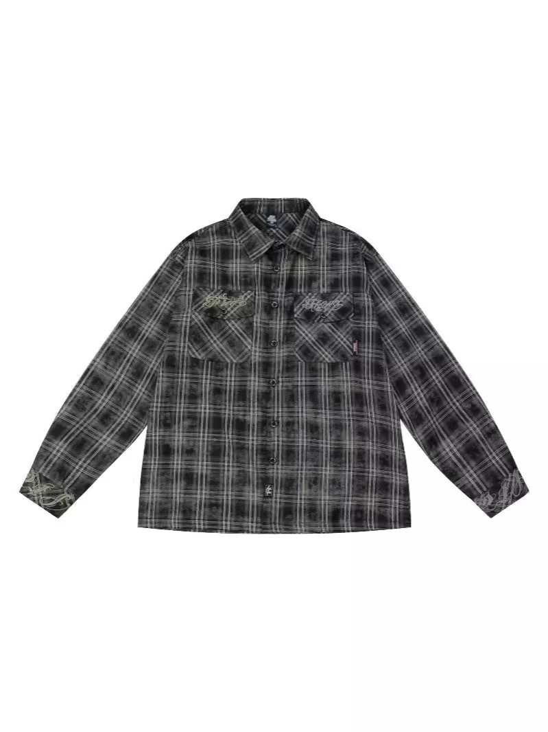 锈蚀效果重工花体刺绣宽松格子工装衬衫