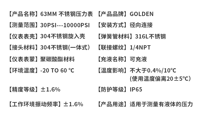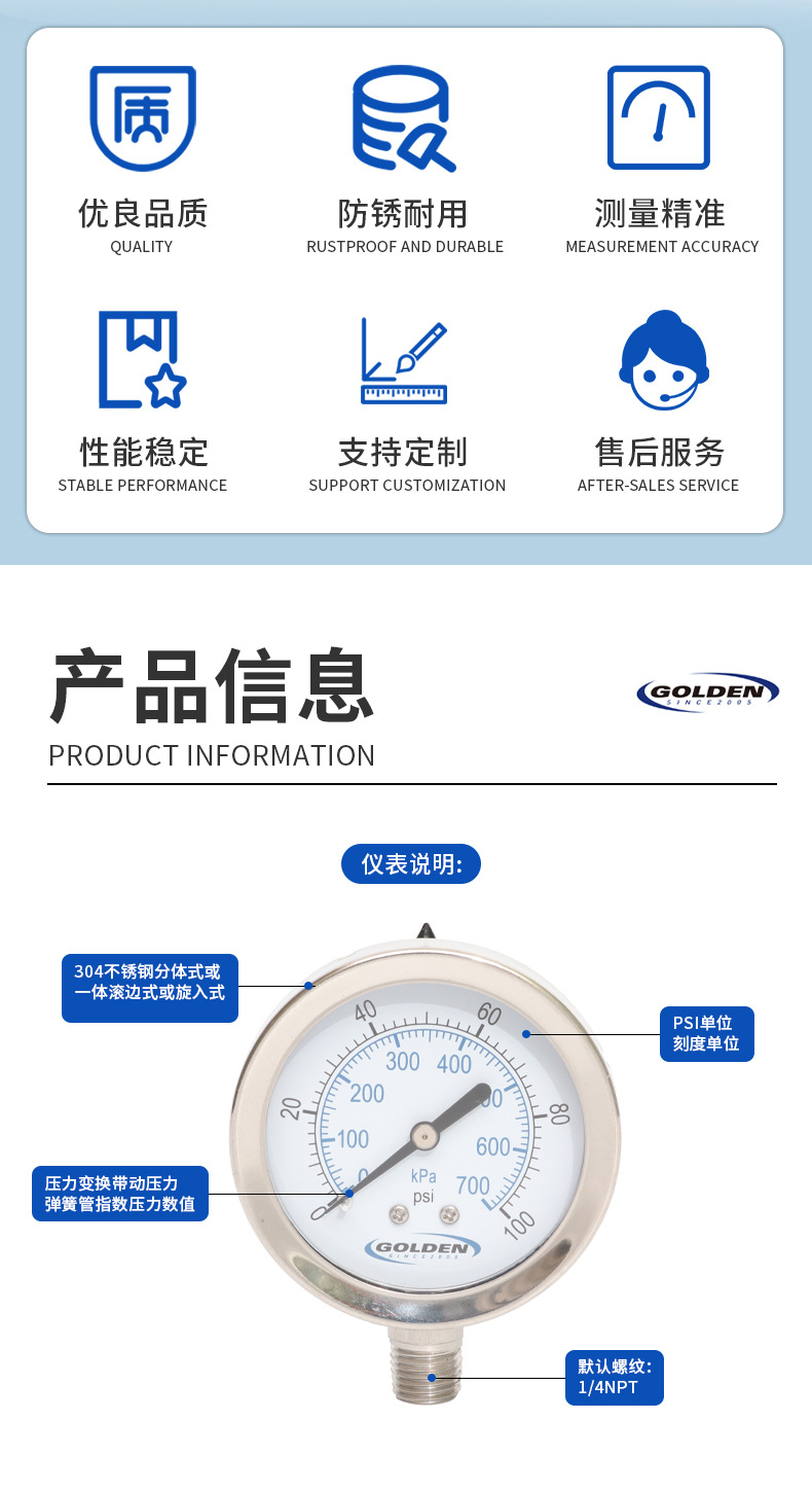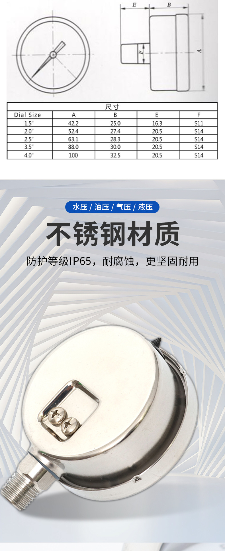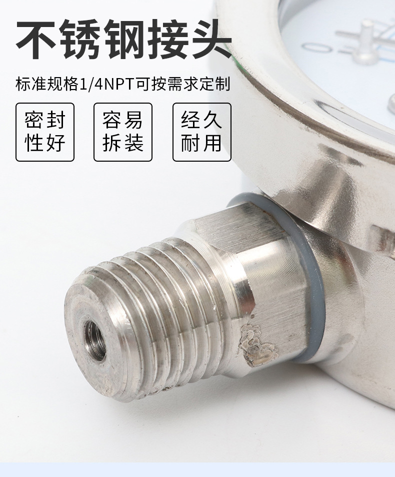 压力表的外壳采用304不锈钢材料,内部结构采用不锈钢材料与铜材料二种