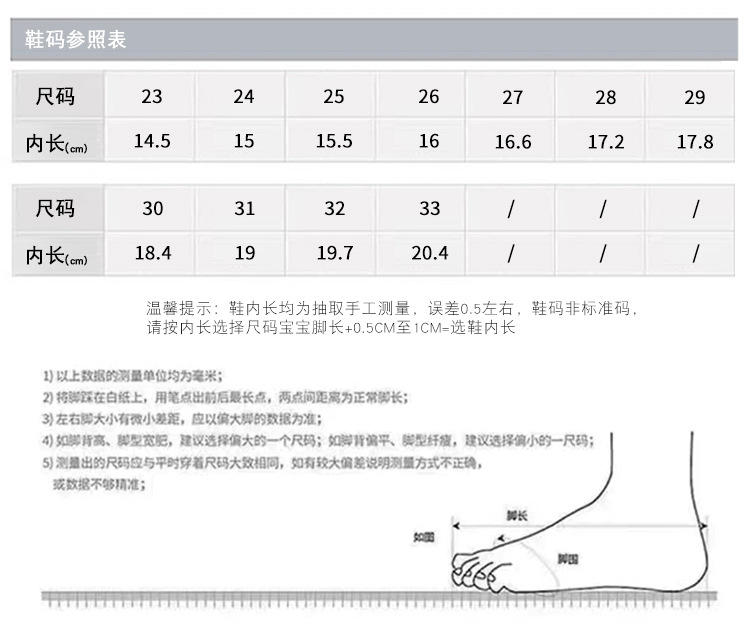 Размер 23: внутренняя длина 14.5cm; Размер 24: внутренняя длина 15.0cm; Размер 25: внутренняя длина 15.5cm; Размер 26: внутренняя длина 16,6 см.; Размер 27: внутренняя длина 16.1cm; Размер 28: внутренняя длина 17.2cm; Размер 29: внутренняя длина 17.8cm; Размер 30: внутренняя длина 18.4cm; Размер 31: Внутренняя длина 19.0cm; Размер 32: внутренняя длина 19.7cm; Размер 33: внутренняя длина 20.4cm; Цена за индивидуальные 1000 пар.