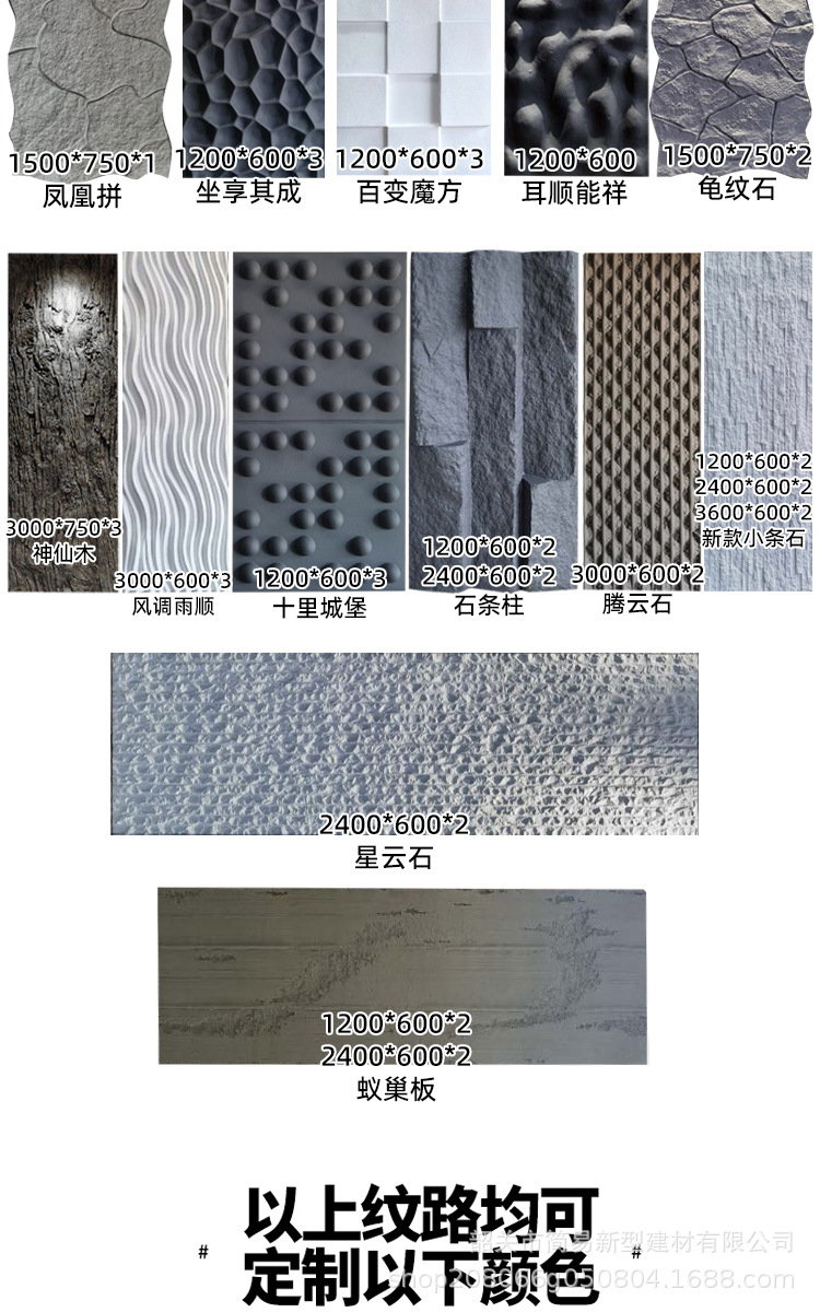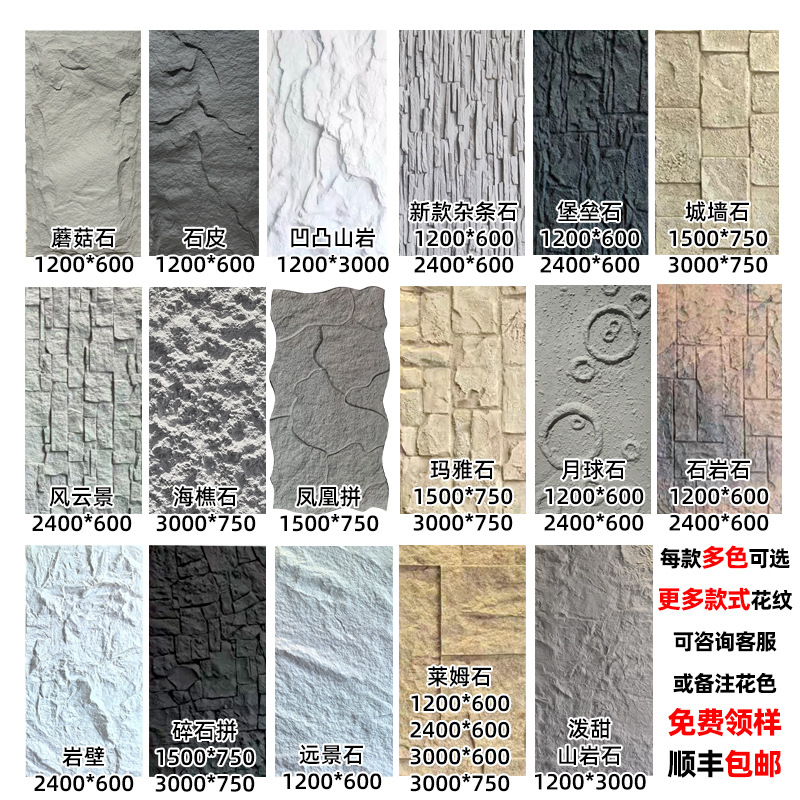 Набор цветных карточек (12 образцов); Небольшой образец; Ультратонкая модель из искусственной кожи PU ( 1.0-2cm ); Белая каменная плита снежинки № 1; Лист белого мрамора №2; 2А белый кожаный лист магнолии; 3А лист цементно-серого камня; Кожаный лист №4 темно-серого цвета с камнем; Кожаный лист №5 космического черного камня; Кожаный лист №6 космического темно-черного камня; 7А трамбованная земля, желтый камень, тонкая доска; 7F кожаный лист из кораллового золота; № 8 Эмма Красная тонкая тарелка; 9А Средиземноморская синяя тонкая доска; №1 Хань белая каменная кожа; №2 кожа из белого мрамора; № 3 кожа из прозрачного водного известняка; 3А современный цвет камня кожи; № 4, прозрачная вода, темно-серая каменная кожа; №5 космическая черная каменная кожа; №6 Космическая темная каменная кожа; №7 золотая гранитная кожа; №8 Ефимия Красный; №9 трамбованный грунт желтый; №10 Средиземноморская орхидея; Грибной камень (12 цветов на выбор); перо камень; течущий камень; внутренний угол каменной кожи; Каменная кожа Янцзяо; Внутренний угол грибовидного камня; Грибной камень Янцзяо; Вогнутые и выпуклые стены; Каменная кожа средняя пластина 300; Каменная кожа средняя пластина 600; Каменная кожа средняя пластина 800; Каменная кожа средняя пластина 750; Большая каменная плита 1800 г.; Большая каменная плита 3000; цементная плита; Большая шиферная стена 2400*600 (5 текстур и 12 цветов на выбор); Рисунок каменной стены (цена за штуку); Узор из камня Акияма (цена за штуку); Узор из камня Vision (цена за штуку); Рисунок задней камни (цена за штуку); Лунный камень (цена за штуку); Мелкозернистый камень проточной воды (цена за штуку); Золотой цветок, полупрозрачный камень; каменная стена пятого поколения; Новый разный камень; ПУ каменная стена; Плиты из искусственной скалы; Вогнуто-выпуклая порода типа B, полупрозрачная; неровные камни; Горный крутой звездный лунный камень; Кожа из искусственного камня, космический черный; 1200*600 (1-4) №5 космический черный