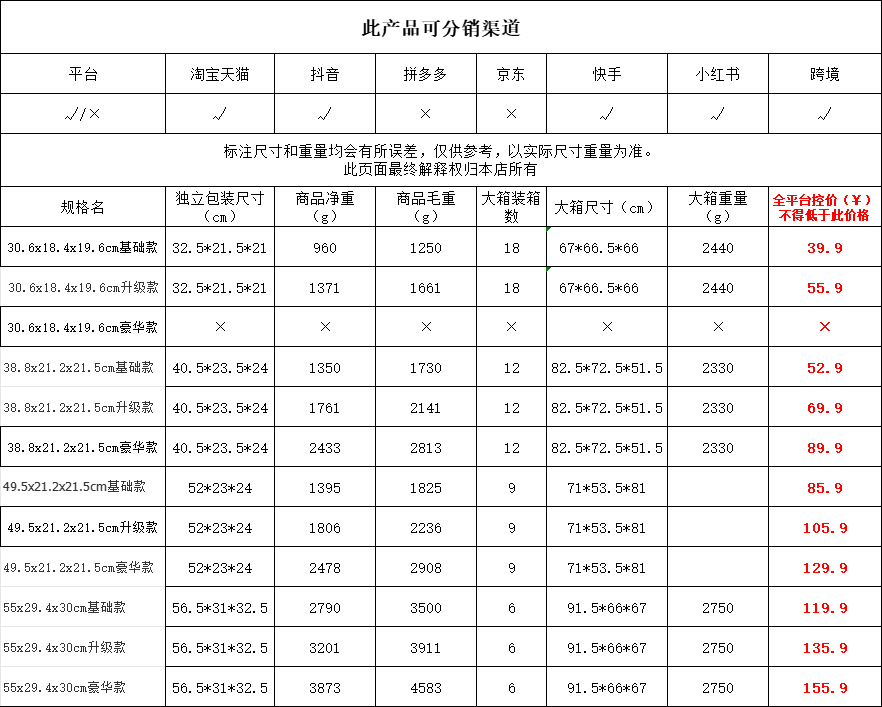 30.6x18.4x19.6cm; 38.8x21.2x21.5cm; 49.5x21.2x21.5cm; 55x29.4x30cm