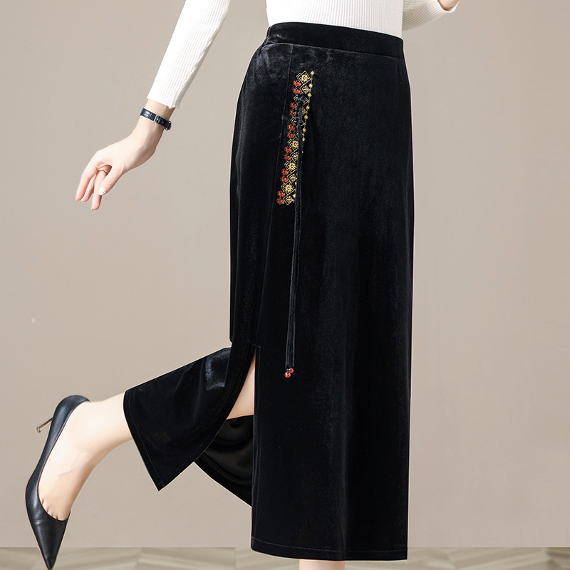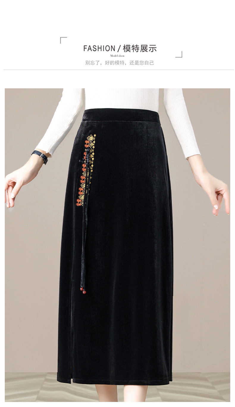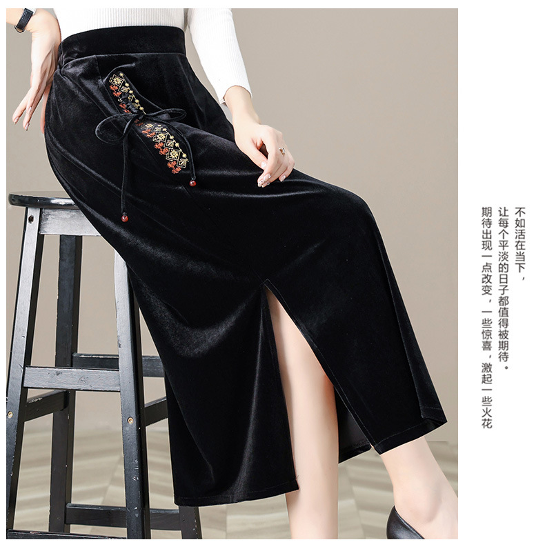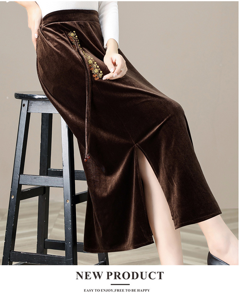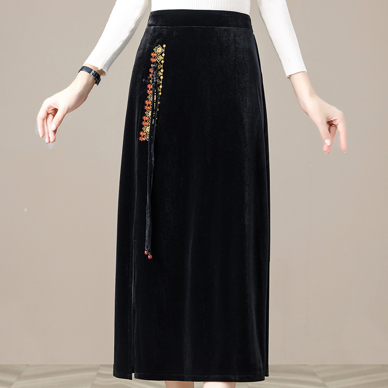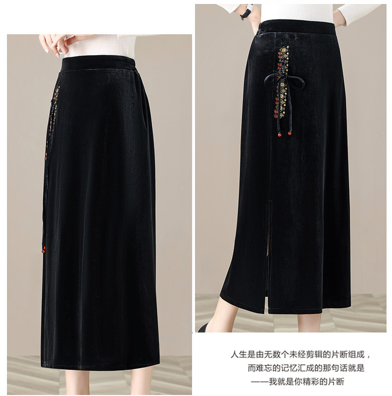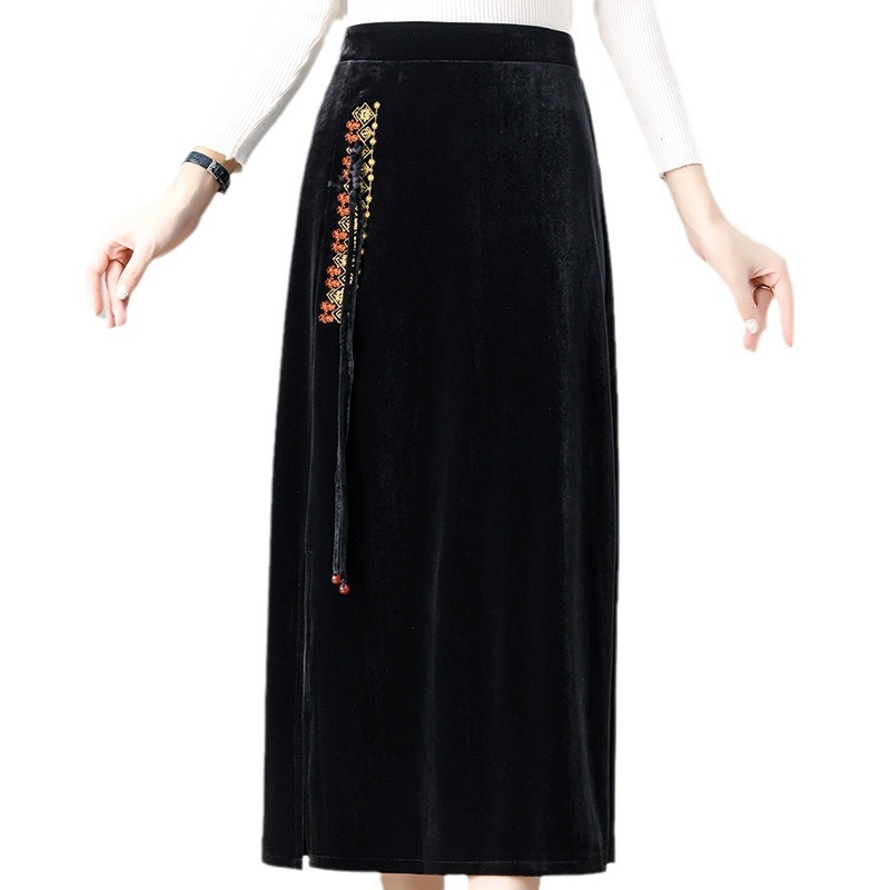 Новый китайский стиль ретро с открытой вилкой юбка среднего возраста мама темперамент вышитая золотая бархатная юбка с высокой талией