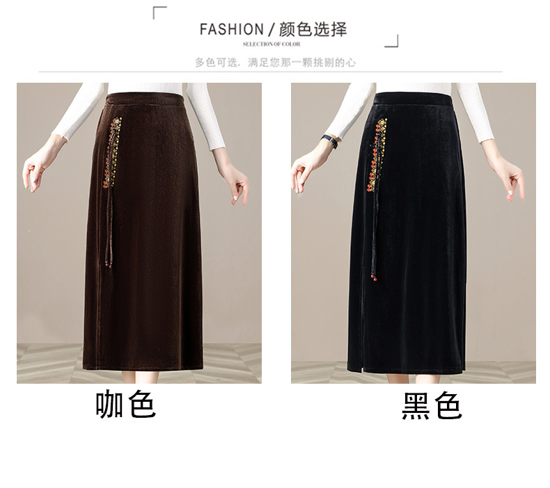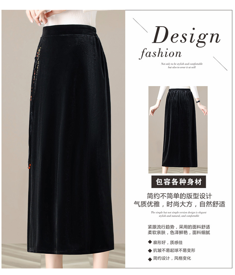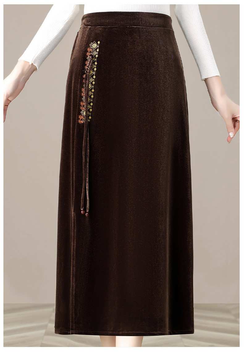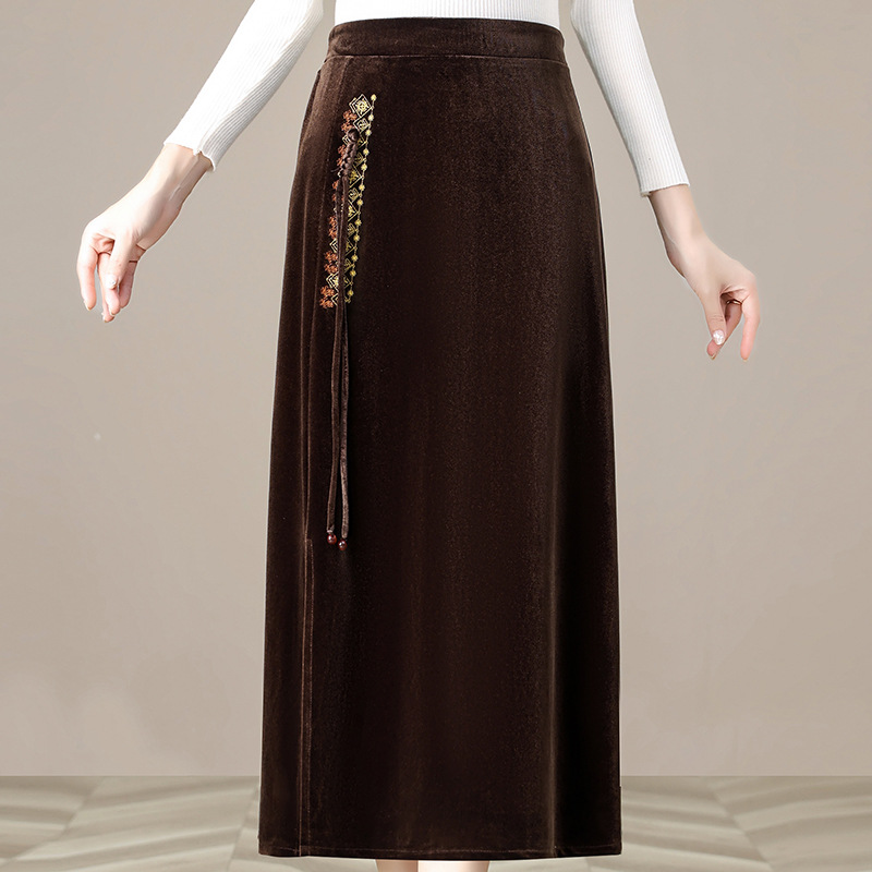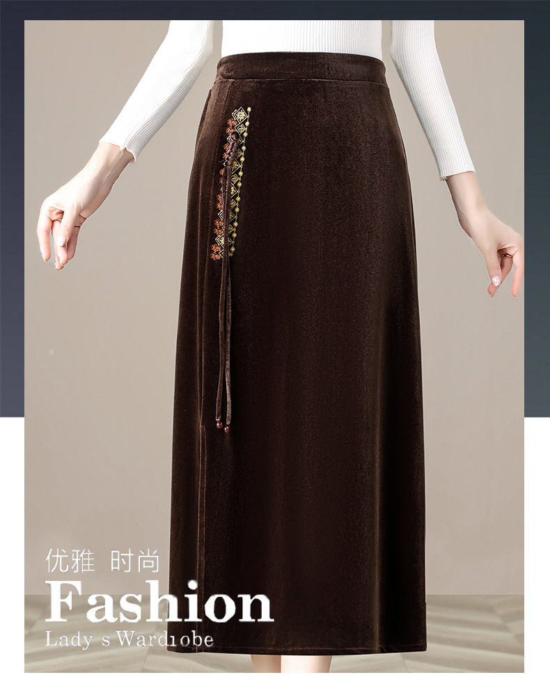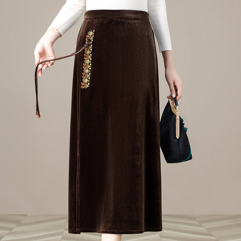 Новый китайский стиль ретро с открытой вилкой юбка среднего возраста мама темперамент вышитая золотая бархатная юбка с высокой талией