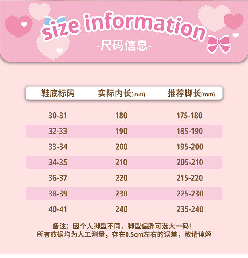 30-31 (внутренняя длина 18CM); 32-33 (внутренняя длина 19CM); 33-34 (внутренняя длина 20CM); 34-35 (внутренняя длина 21CM); 36-37 (внутренняя длина 22CM); 38-39 (внутренняя длина 23CM); 40-41 (внутренняя длина 24CM)