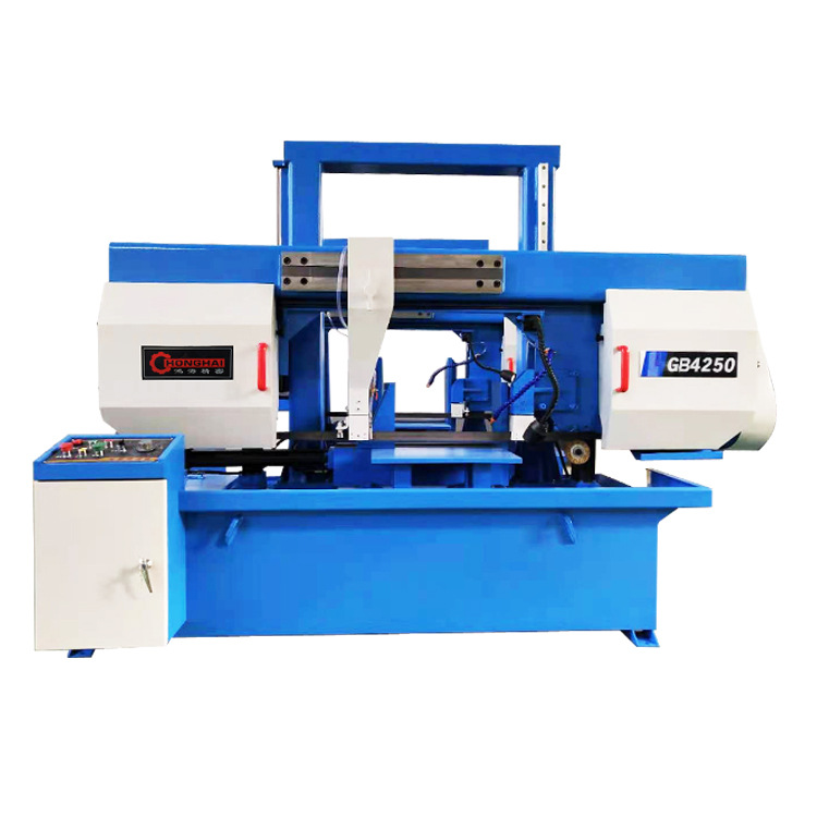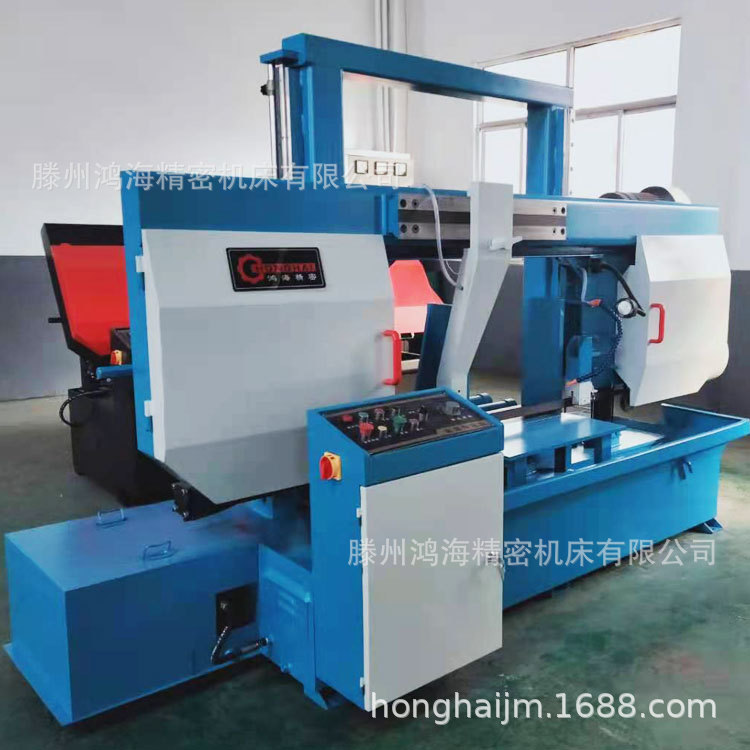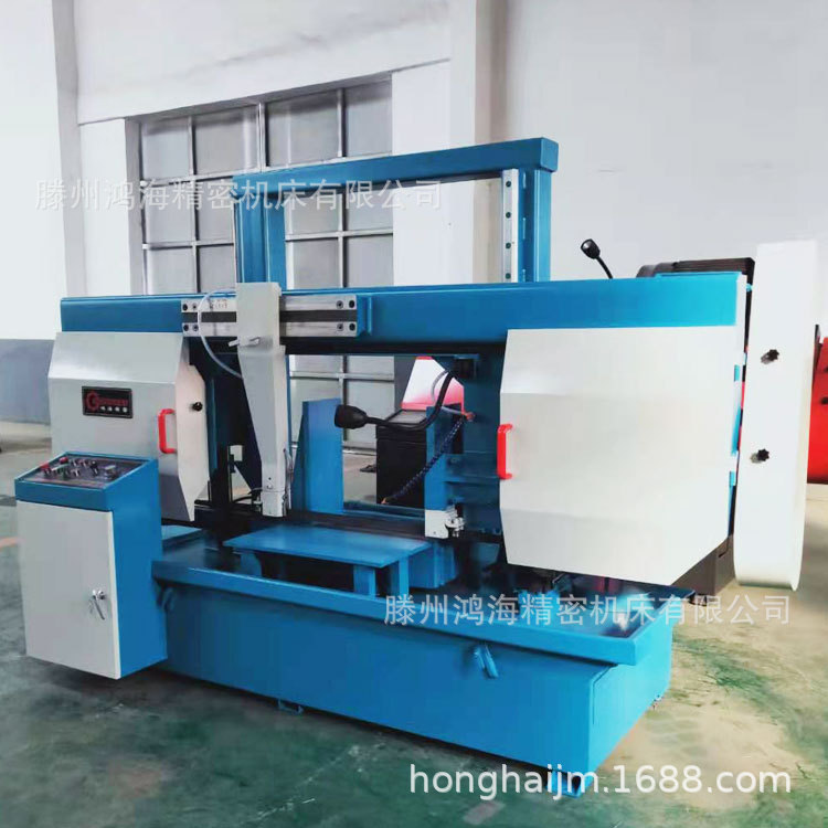 GB系列金属带锯床是一种以金属锯条作为切削工具,并用于切割金属材料的锯切设备,主要用于黑色金属的方料。圆料及各种型材的切割,亦可用于切割有色金属及非金属材料。由于带锯切口窄,切削效率高,因此能耗小,材料浪费少。是一种具有节能,节材效果的切割设备。双立柱带锯床主传动采用蜗轮箱变速,进给采用液压传动,工件夹紧采用手动和液压混合式夹紧,具有结构紧凑,操作维修方便等特点。